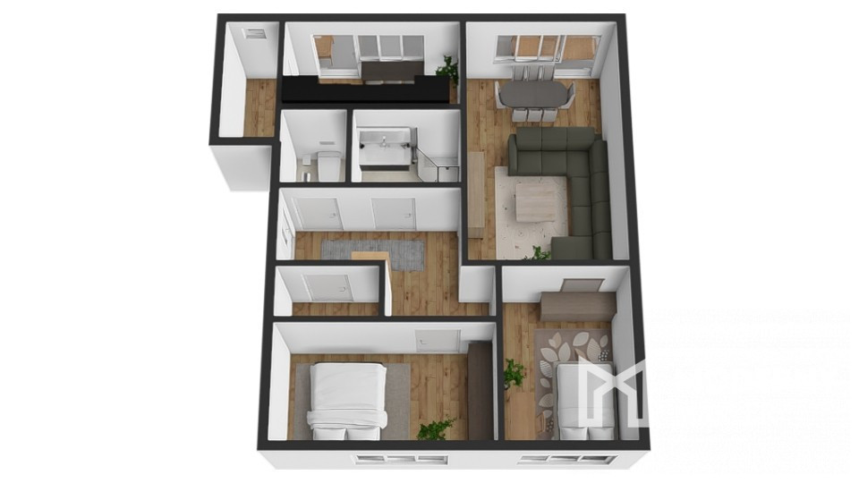 Byt sa predáva čiastočne zariadený a pozostáva z predsiene, z ktorej je vstup do všetkých miestností – obývacej izby, dvoch samostatných izieb, kúpeľne, samostatného WC a kuchyne. Obývacia izba je prechodná s kuchyňou, z ktorej je prístup do komory. Z obývacej izby a kuchyne je výstup na priestrannú loggiu orientovanú na juh.