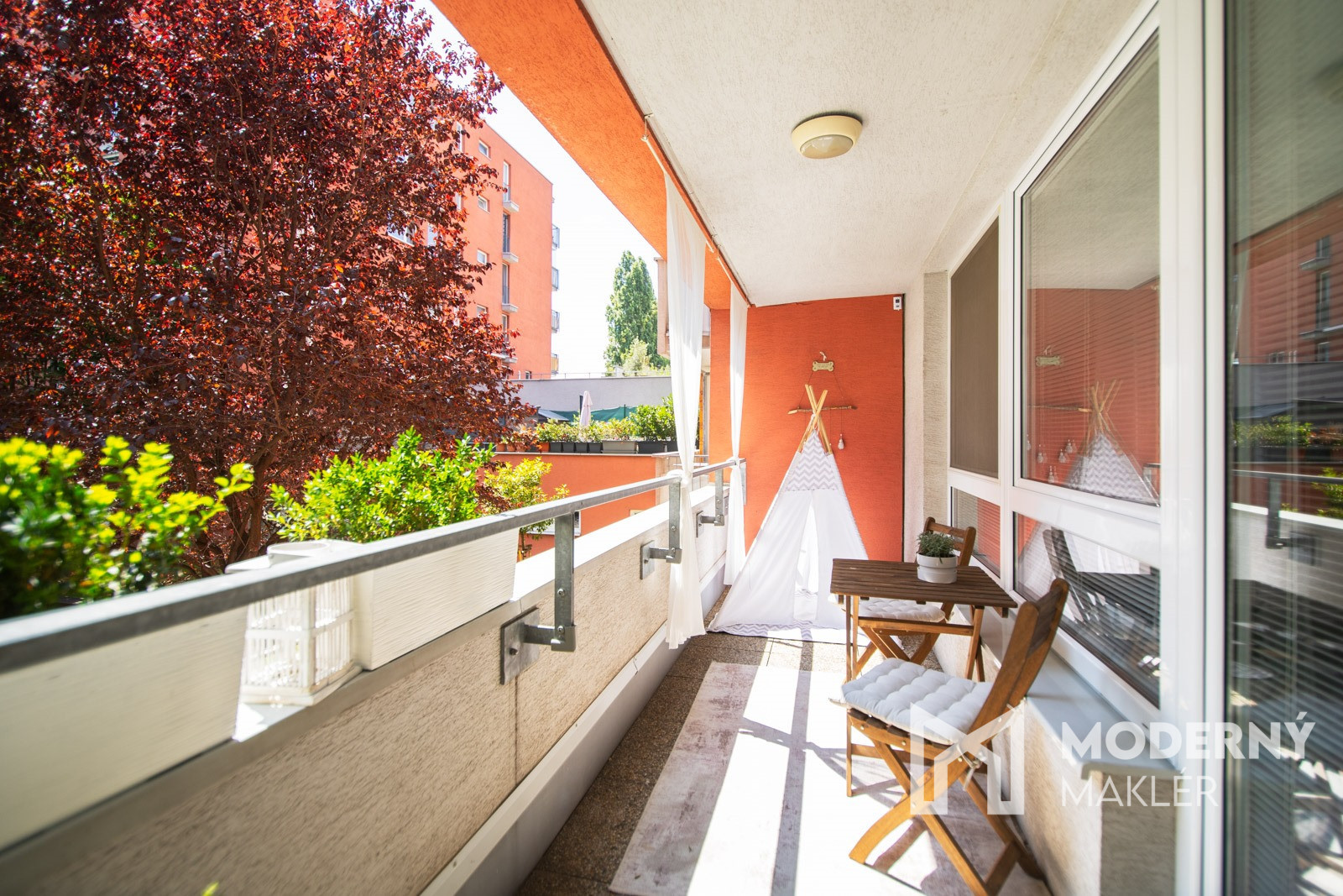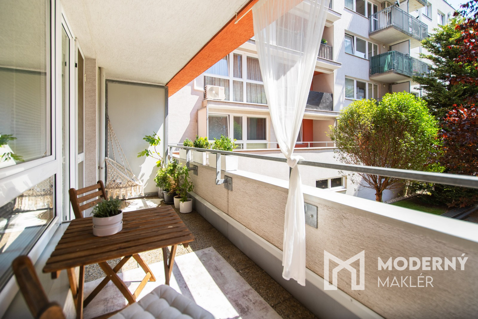 Nehnuteľnosť sa predáva kompletne zariadená vrátane nábytku vyrobeného na mieru. V hlavnej chodbe sa nachádzajú priestranné vstavané skrine s bohatým úložným priestorom, ktoré boli precízne zhotovené na mieru. Detská izba je kompletne zariadená vstavaným nábytkom taktiež vyrobeným na mieru. Hlavnú spálňu tvorí manželská posteľ s nočnými stolíkmi, vstavané skrine, komoda a klimatizačná jednotka.. Samostatná toaleta disponuje úložným priestorom, zatiaľ čo kúpeľňa ponúka rohovú vaňu, kúpeľňový nábytok, práčku so sušičkou, závesný radiátor a umývadlo so skrinkou. Dominantou nehnuteľnosti je priestranný a presvetlený denný priestor, ktorý spája kuchyňu s obývačkou. Kuchynská časť je vybavená veľkorysou kuchynskou linkou na mieru s kompletnými vstavanými elektrospotrebičmi, dostatkom pracovného aj odkladacieho priestoru. V jedálenskej časti sa nachádza rozkladací stôl so sedením pre šesť osôb. Obývacia časť pôsobí elegantne a útulne – vybavená je pohodlnou sedacou súpravou, nástenným nábytkom, televízorom, konferenčným stolíkom a obývacou stenou. Zo spoločnej obývacej zóny je priamy výstup na príjemnú terasu so závesnou hojdačkou, pohodlným sedením, priestorom pre deti, kvetinami a bylinkami. Terasa ponúka upokojujúci výhľad na zeleň vnútrobloku a stáva sa ideálnym miestom na relax.