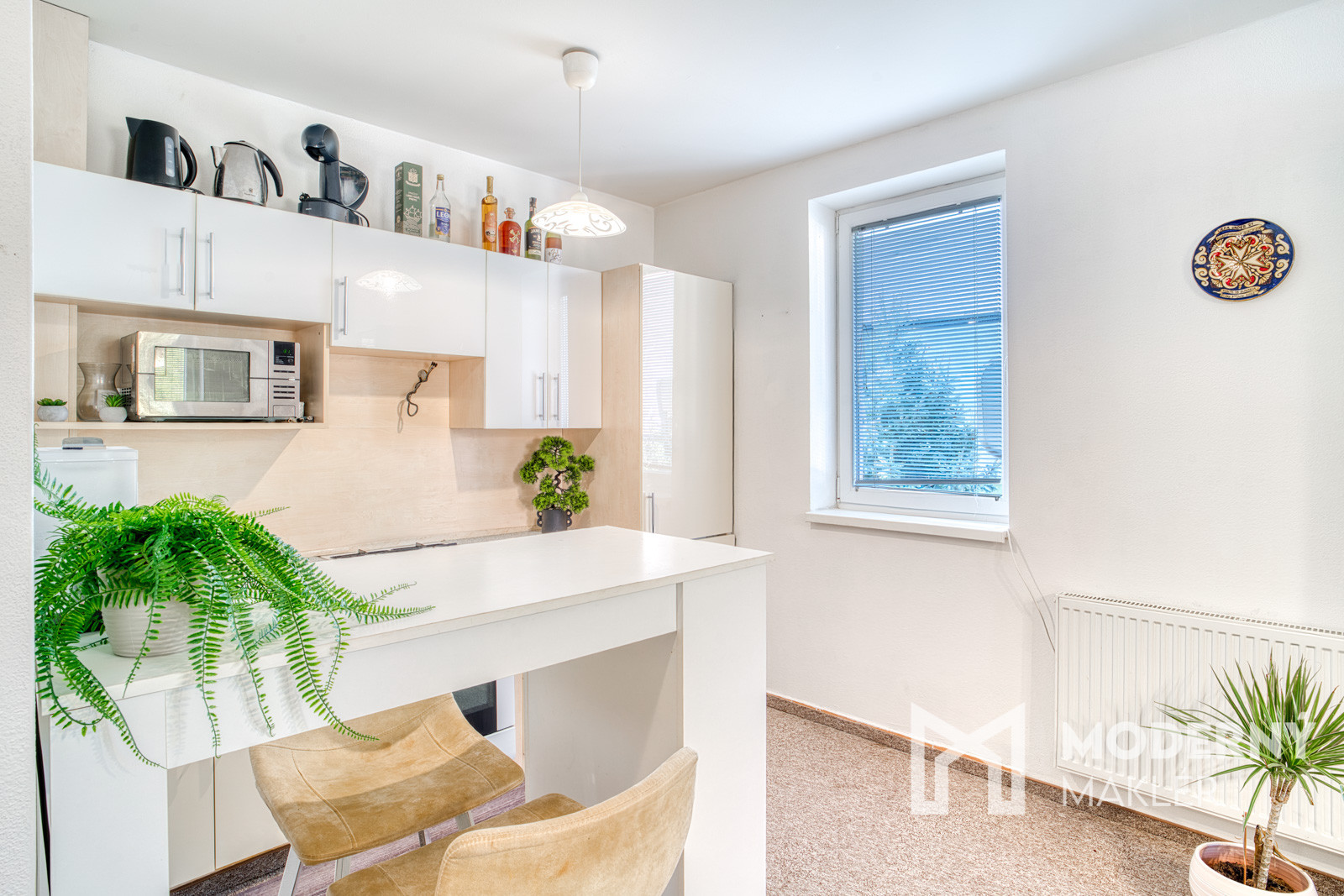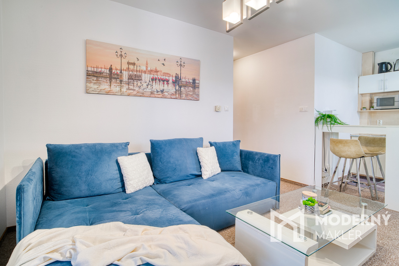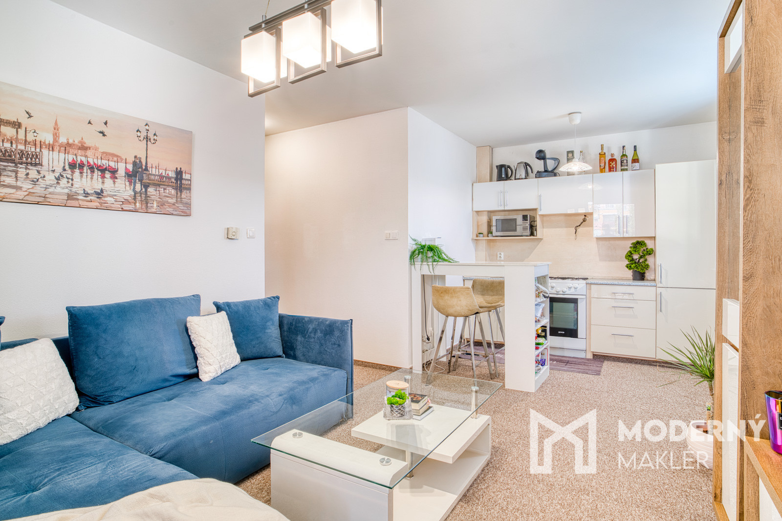 Nehnuteľnosť sa predáva čiastočne zariadená podľa dohody. V chodbe sa nachádza komoda pre praktické úložné riešenie. Kúpeľňa je vybavená sprchovým kútom a práčkou. Spálňa je zariadená manželskou posteľou pre pohodlný odpočinok. Obývacia izba ponúka kompletnú sedaciu súpravu s konferenčným stolíkom, TV zostavu pre relaxáciu a zábavu, ako aj 2 barové stoličky. Kuchyňa je vybavená kuchynskou linkou so spotrebičmi (plynový sporák s elektrickou rúrou) a barovým pultom na stolovanie. Ak byte potrebovali väčšiu kuchynskú časť je možnosť dobudovania do tvaru U.