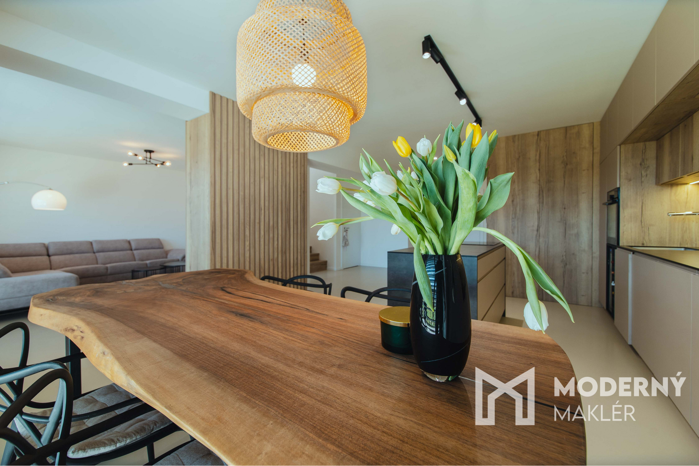 Dom sa predáva kompletne zariadený a pripravený na okamžité bývanie. Interiér je ladený do moderného, no zároveň útulného štýlu, s dôrazom na funkčnosť a dizajnovú čistotu. Obývacia časť ponúka pohodlnú sedaciu súpravu, konferenčný stolík a televízor . Vzdušná kuchyňa je vybavená kuchynskou linkou so vstavanými spotrebičmi, chladničkou na víno a dominantným jedálenským stolom z masívneho orechového dreva so stoličkami. Spálňa disponuje vstavanou skriňou a komodou, kúpeľne sú kompletne vybavené modernou sanitou a úložným nábytkom. Praktickou súčasťou domu je aj samostatná technická miestnosť s práčkou, sušičkou a vstavanou skriňou, ktorá poskytuje dostatok úložného priestoru. V predsieni sa nachádza vstavaná skriňa s botníkom. K dispozícii je tiež exteriérové sedenie. Všetok nábytok je vyrobený na mieru, čo zabezpečuje maximálne využitie priestoru a esteticky jednotný dizajn v celom dome.