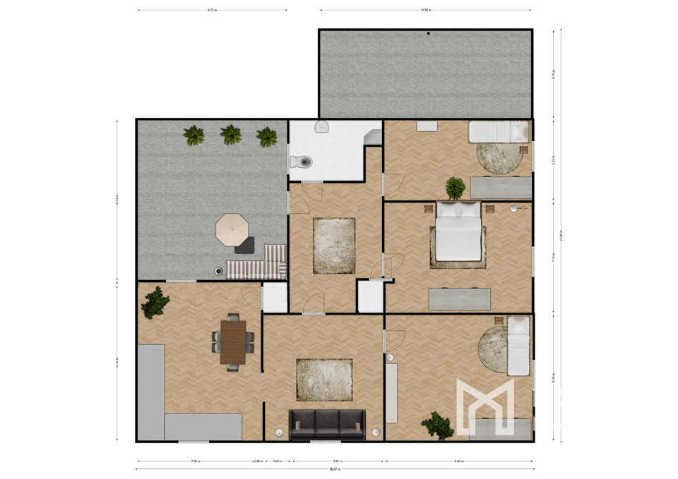 Dispozícia domu je funkčná a prehľadná, s centrálnou chodbou, ktorá tvorí srdce celého priestoru. Z chodby je vstup do dvoch detských izieb, technickej miestnosti, kúpeľne spojenej s WC a priestrannej obývacej izby s krbom, ktorá je prepojená s kuchyňou. Z obývačky vedie vstup do hlavnej spálne, čo vytvára praktické, no súkromné dispozičné riešenie. Z kuchyne je priamy výstup terasovými dverami na krytú terasu, ktorá rozširuje obytný priestor o vonkajšiu relaxačnú zónu. Dom pôsobí vzdušne a logické rozmiestnenie miestností poskytuje dostatok priestoru pre celú rodinu.