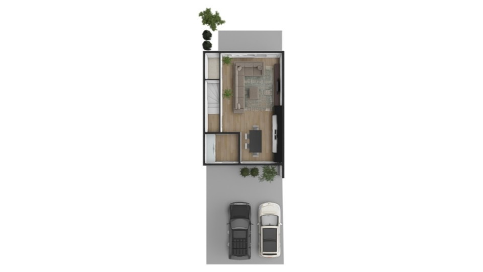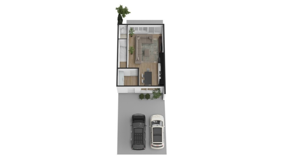 Na prízemí sa nachádza vstupná predsieň, priestranná obývacia izba prepojená s kuchyňou a jedálenskou časťou a samostatná toaleta s umývadlom. Poschodie tvorí hlavná spálňa so šatníkom, vlastnou kúpeľňou a francúzskym balkónom, dve samostatné izby – každá s francúzskym balkónom, kúpeľňa s WC a technická miestnosť. Exteriér ponúka priestrannú terasu, dve parkovacie miesta a upravenú záhradu. Dispozícia je navrhnutá prakticky a vzdušne, pričom dôraz bol kladený na súkromie a funkčnosť jednotlivých zón. Druhá časť dvojdomu ponúka rovnaké riešenie, zrkadlovo otočené, s totožnou kvalitou prevedenia