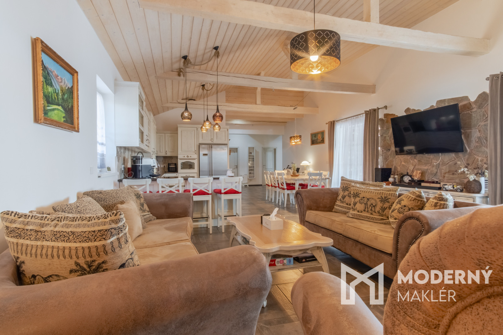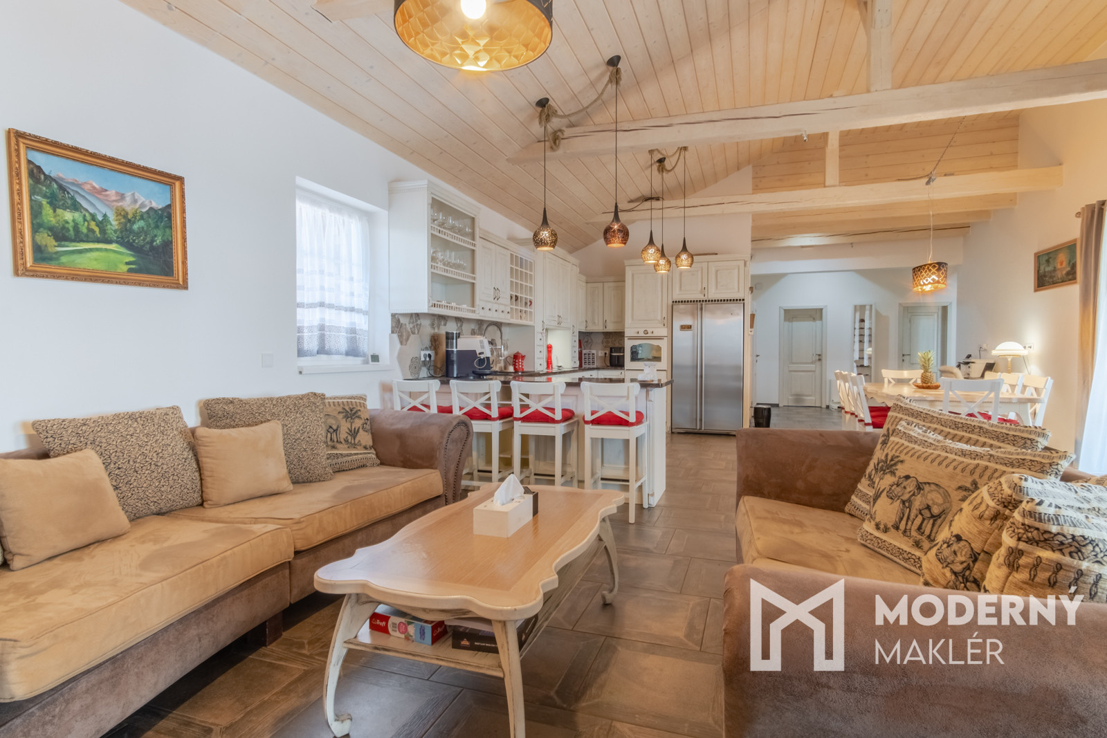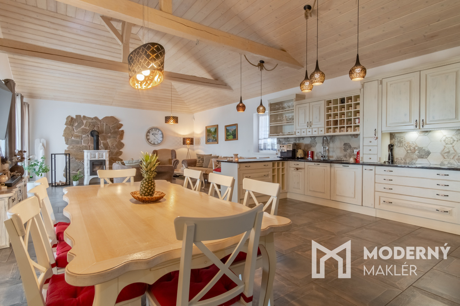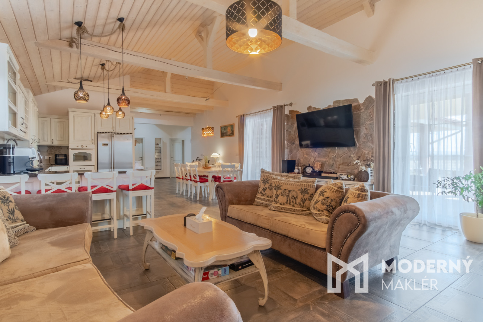 Dom je navrhnutý s dôrazom na pohodlie a funkčnosť. Priestranné zádverie vedie do veľkolepej dennej a oddychovej časti. Hlavným prvkom interiéru je elegantná obývacia hala, ktorá je prepojená s kuchyňou a jedálňou, čím vytvára vzdušný, harmonický priestor s krbovou pecou a provensálskym dizajnom. Vysoké stropy a autentické storočné trámy dodávajú priestoru charakter a luxusný nádych. Nehnuteľnosť disponuje ďalšími tromi izbami, pričom každá z nich má priamy vstup na rozľahlú terasu s panoramatickým výhľadom. K nadštandardnému vybaveniu patria dve elegantné kúpeľne, hosťovská toaleta a šatník. Priamo z dvojgaráže vedie pohodlný vstup do hlavnej chodby. Súčasťou pozemku je štýlový záhradný dom s ručne vyrábanou medenou kuchynskou linkou a s rozlohou vyše 70 m2. Priestranná terasa obklopená zeleňou ponúkne ideálne miesto na relax, šport či spoločenské stretnutia v úplnom súkromí. Nehnuteľnosť sa predáva kompletne zariadená, pričom každý detail bol starostlivo vybraný s dôrazom na prvotriednu kvalitu a jedinečný dizajn.