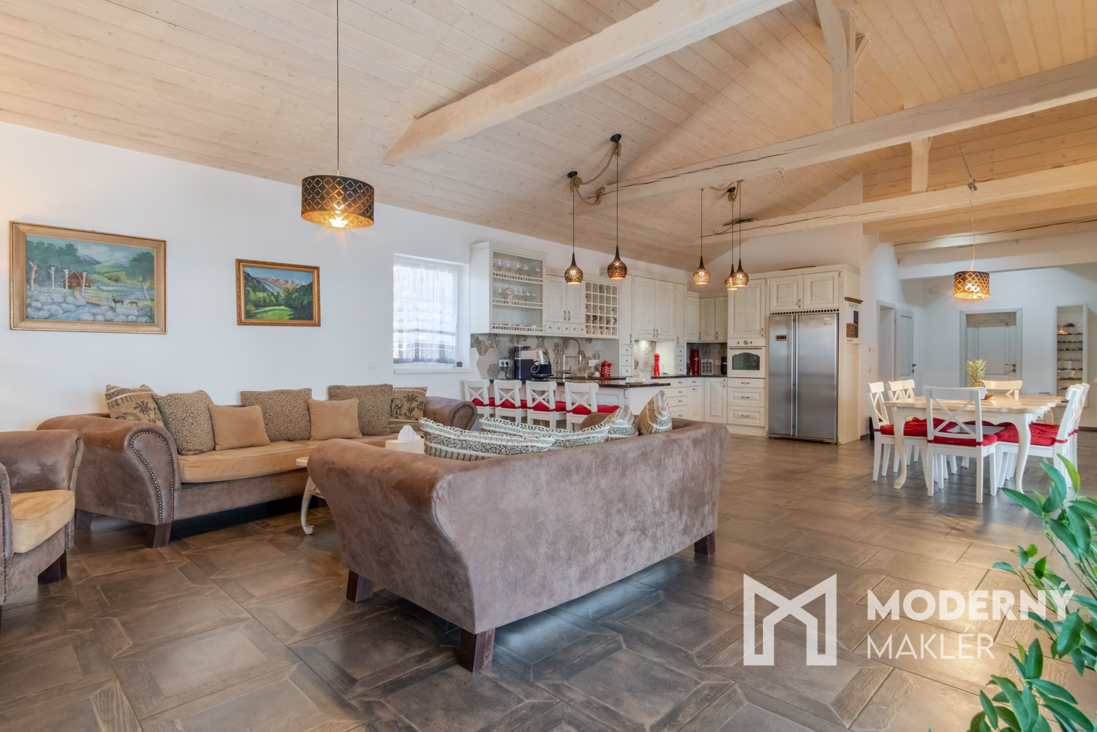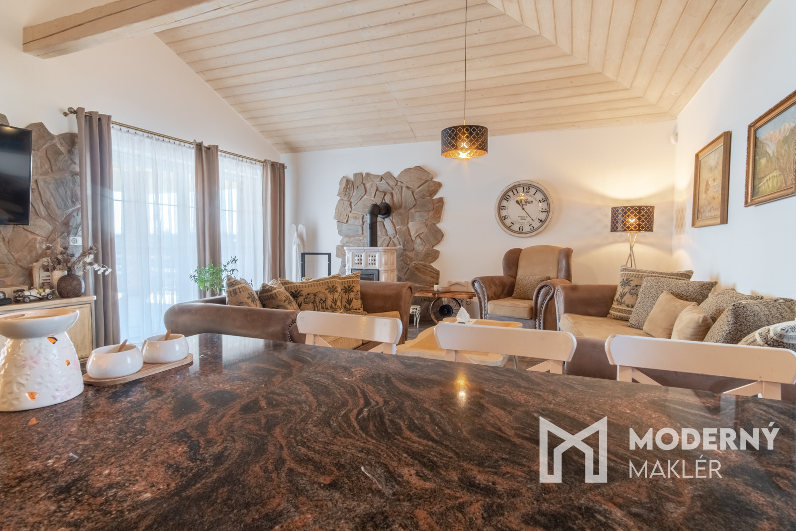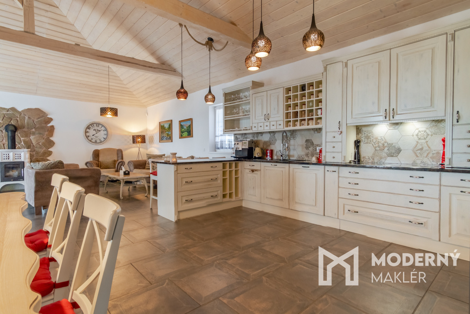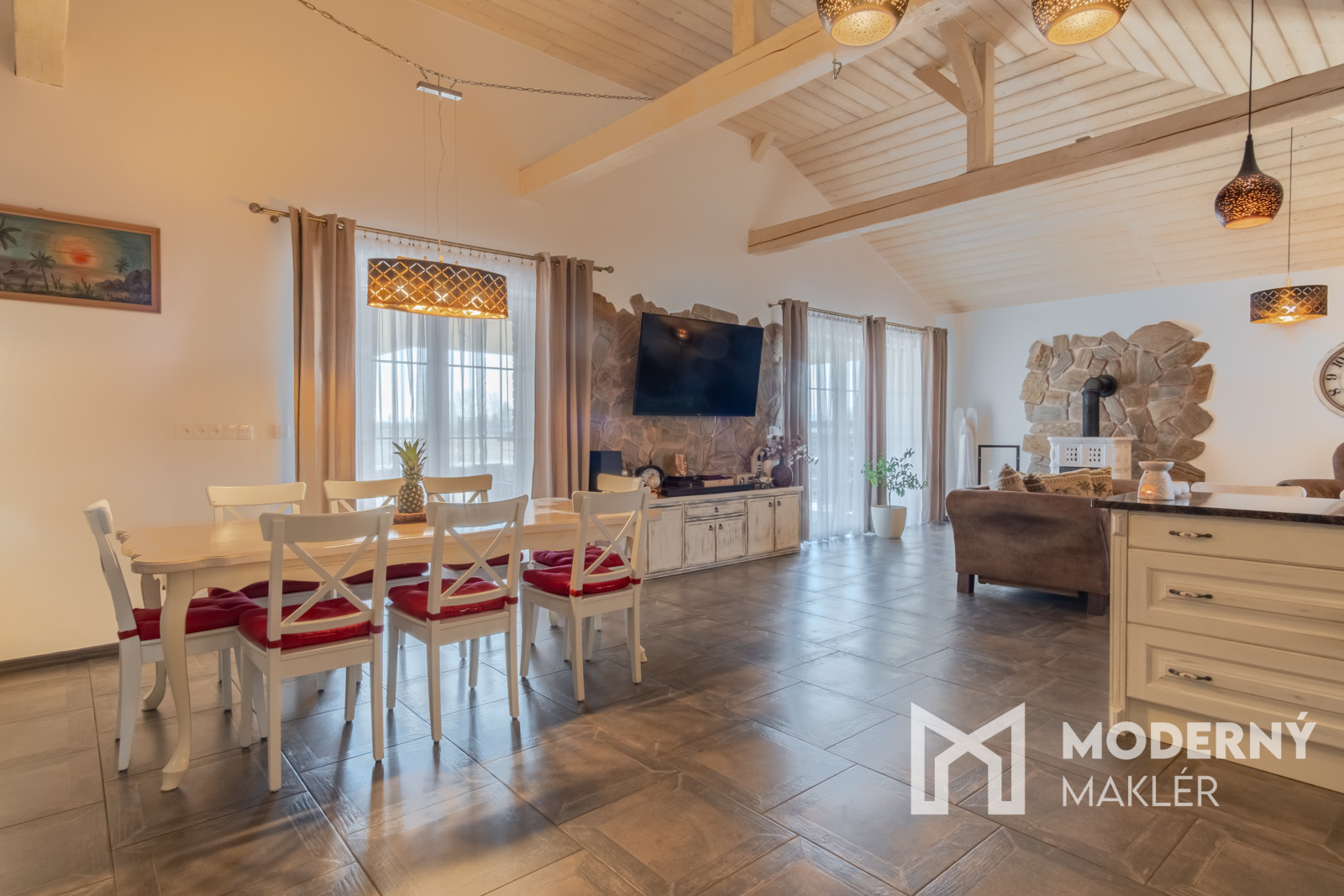 Dom je navrhnutý s dôrazom na pohodlie a funkčnosť. Priestranné zádverie vedie do veľkolepej dennej a oddychovej časti. Hlavným prvkom interiéru je elegantná obývacia hala, ktorá je prepojená s kuchyňou a jedálňou, čím vytvára vzdušný, harmonický priestor s krbovou pecou a provensálskym dizajnom. Vysoké stropy a autentické storočné trámy dodávajú priestoru charakter a luxusný nádych. Nehnuteľnosť disponuje ďalšími tromi izbami, pričom každá z nich má priamy vstup na rozľahlú terasu s panoramatickým výhľadom. K nadštandardnému vybaveniu patria dve elegantné kúpeľne, hosťovská toaleta a šatník. Priamo z dvojgaráže vedie pohodlný vstup do hlavnej chodby. Súčasťou pozemku je štýlový záhradný dom s ručne vyrábanou medenou kuchynskou linkou a s rozlohou vyše 70 m2. Priestranná terasa obklopená zeleňou ponúkne ideálne miesto na relax, šport či spoločenské stretnutia v úplnom súkromí. Nehnuteľnosť sa predáva kompletne zariadená, pričom každý detail bol starostlivo vybraný s dôrazom na prvotriednu kvalitu a jedinečný dizajn.