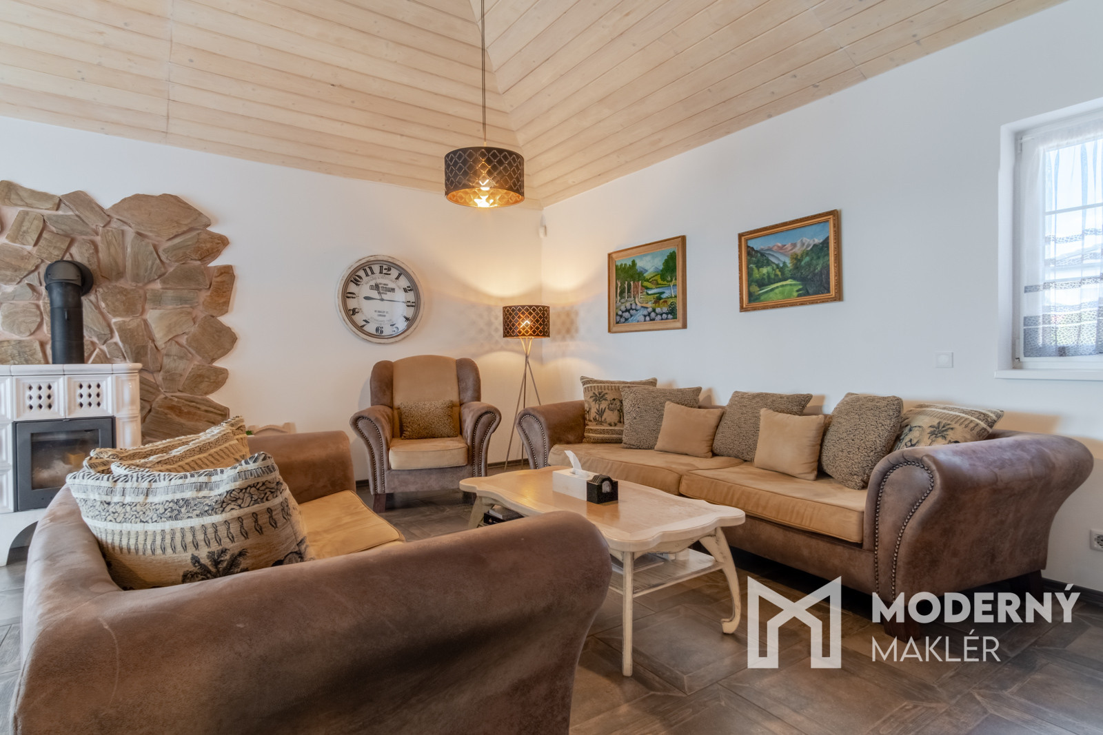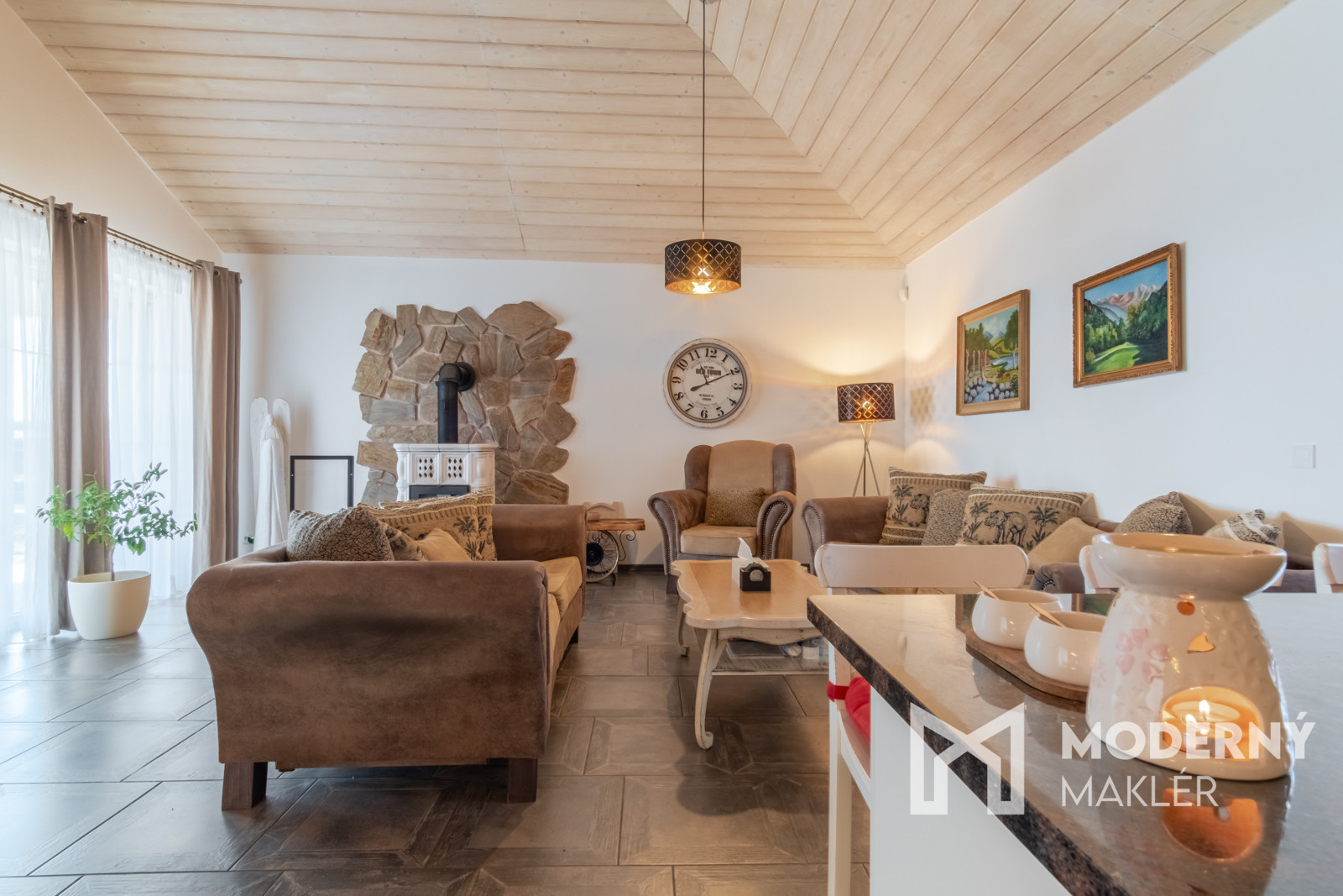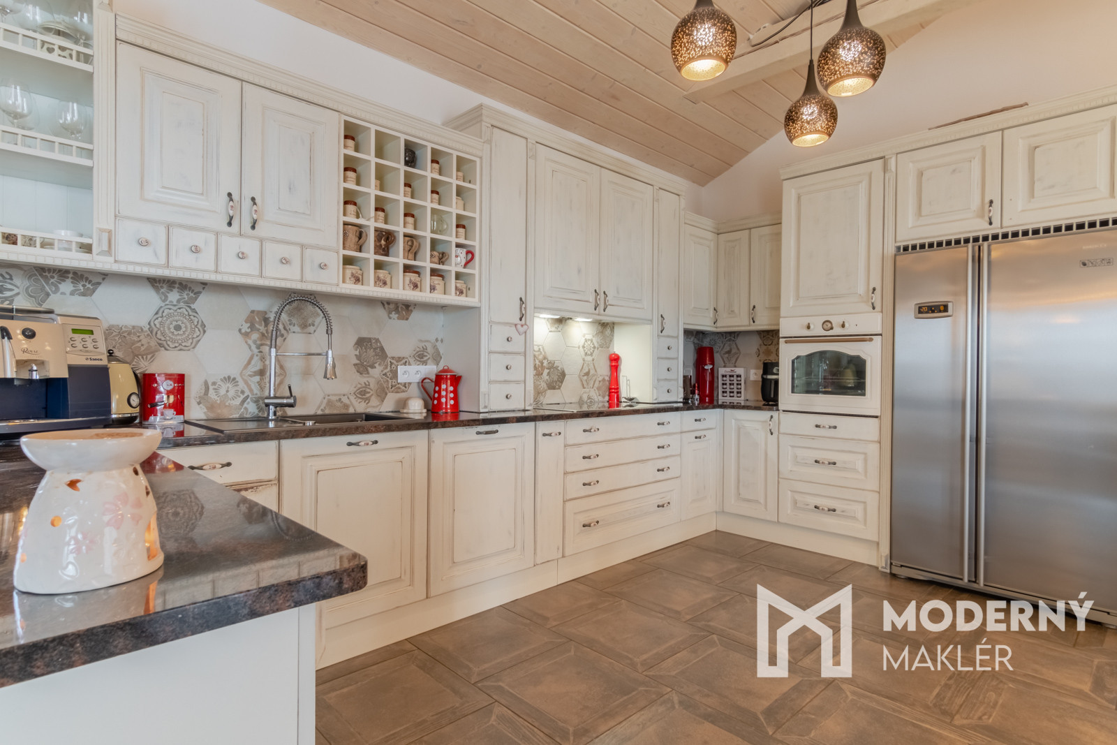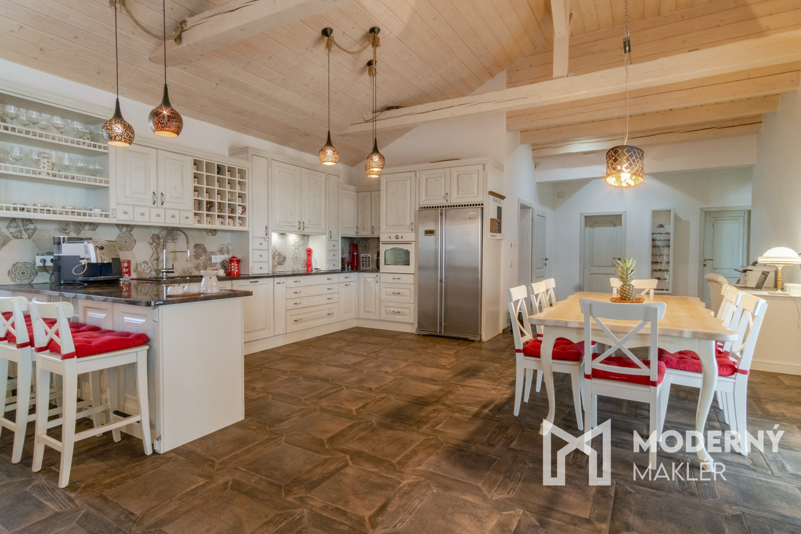 Dom je navrhnutý s dôrazom na pohodlie a funkčnosť. Priestranné zádverie vedie do veľkolepej dennej a oddychovej časti. Hlavným prvkom interiéru je elegantná obývacia hala, ktorá je prepojená s kuchyňou a jedálňou, čím vytvára vzdušný, harmonický priestor s krbovou pecou a provensálskym dizajnom. Vysoké stropy a autentické storočné trámy dodávajú priestoru charakter a luxusný nádych. Nehnuteľnosť disponuje ďalšími tromi izbami, pričom každá z nich má priamy vstup na rozľahlú terasu s panoramatickým výhľadom. K nadštandardnému vybaveniu patria dve elegantné kúpeľne, hosťovská toaleta a šatník. Priamo z dvojgaráže vedie pohodlný vstup do hlavnej chodby. Súčasťou pozemku je štýlový záhradný dom s ručne vyrábanou medenou kuchynskou linkou a s rozlohou vyše 70 m2. Priestranná terasa obklopená zeleňou ponúkne ideálne miesto na relax, šport či spoločenské stretnutia v úplnom súkromí. Nehnuteľnosť sa predáva kompletne zariadená, pričom každý detail bol starostlivo vybraný s dôrazom na prvotriednu kvalitu a jedinečný dizajn.