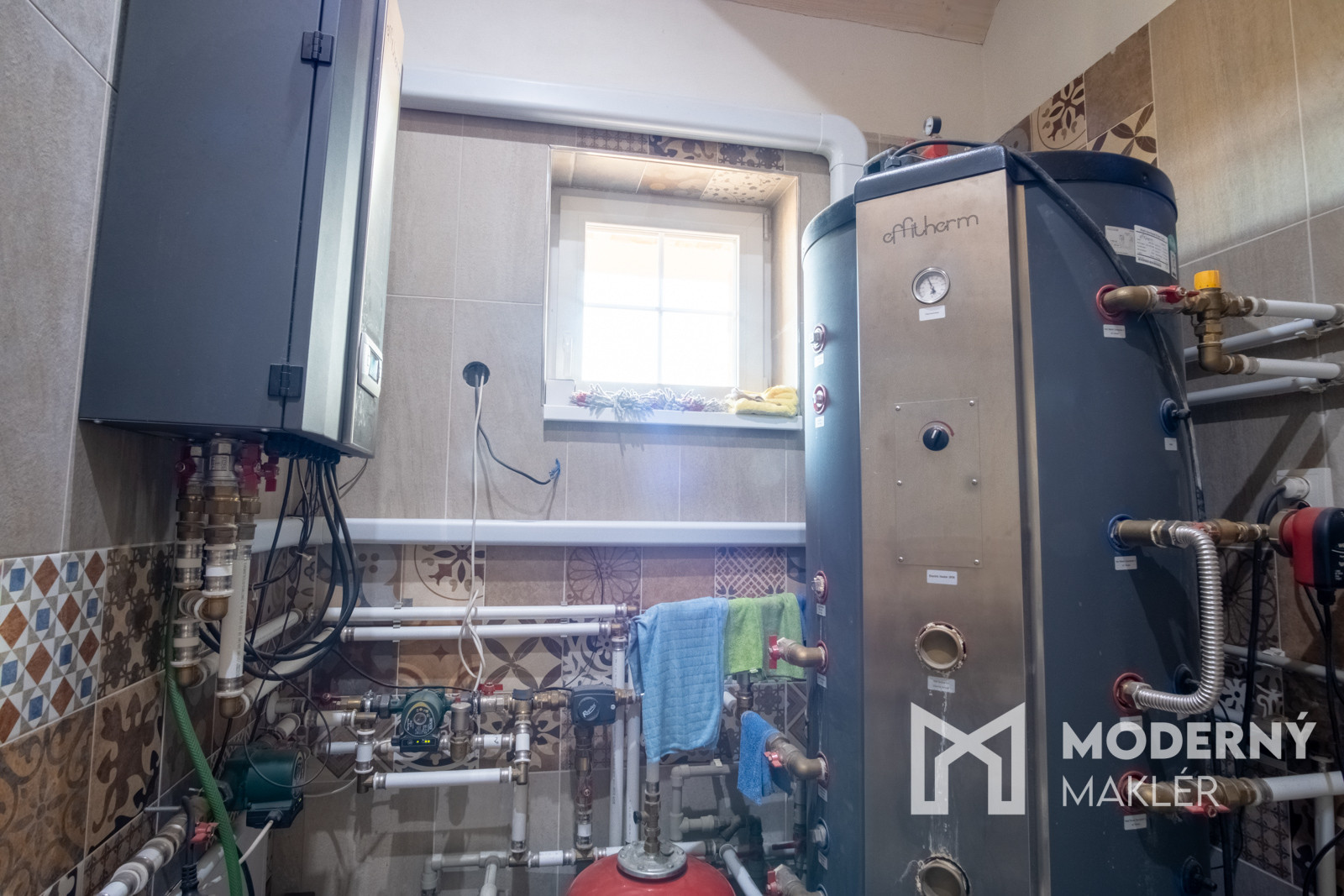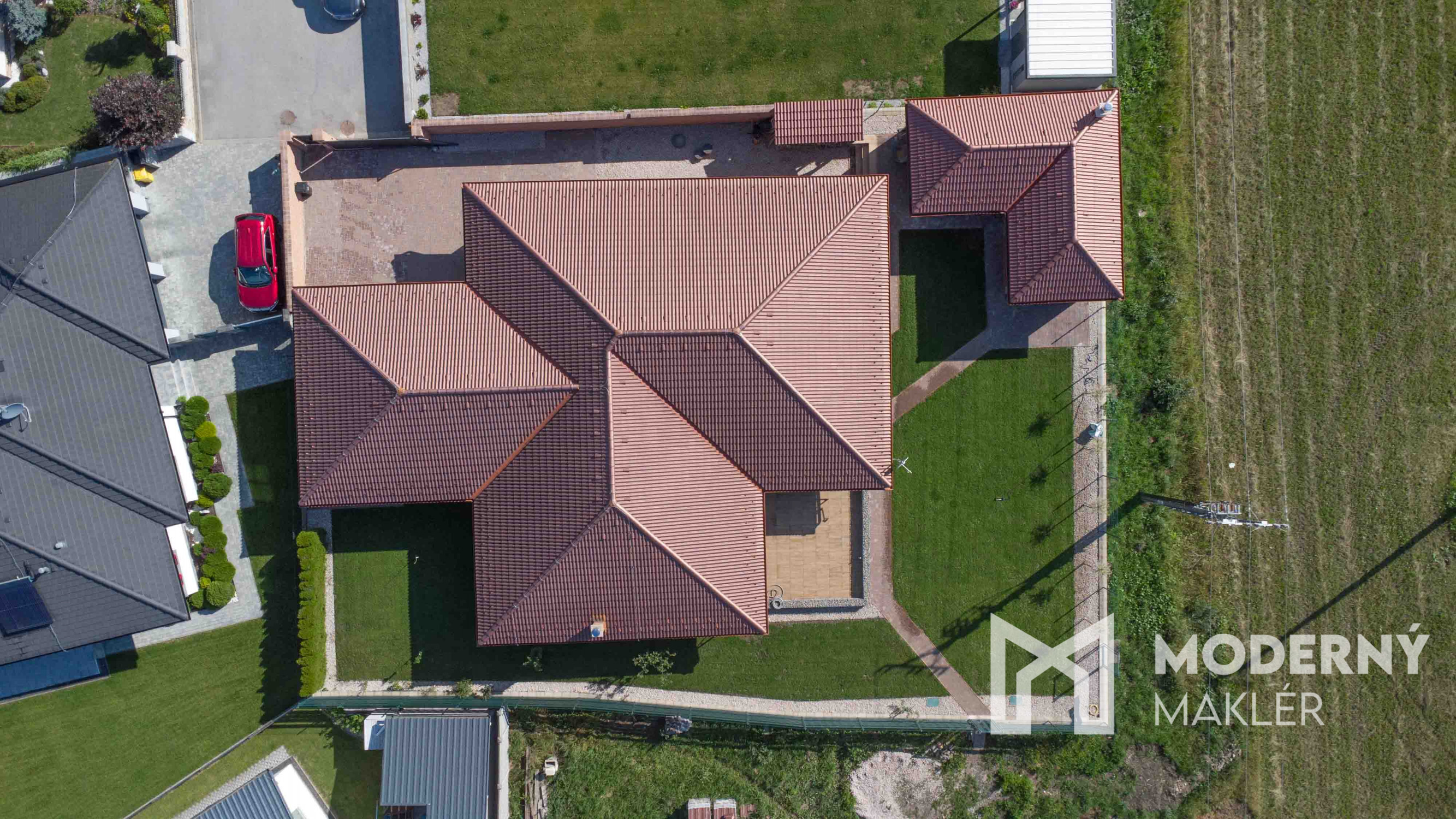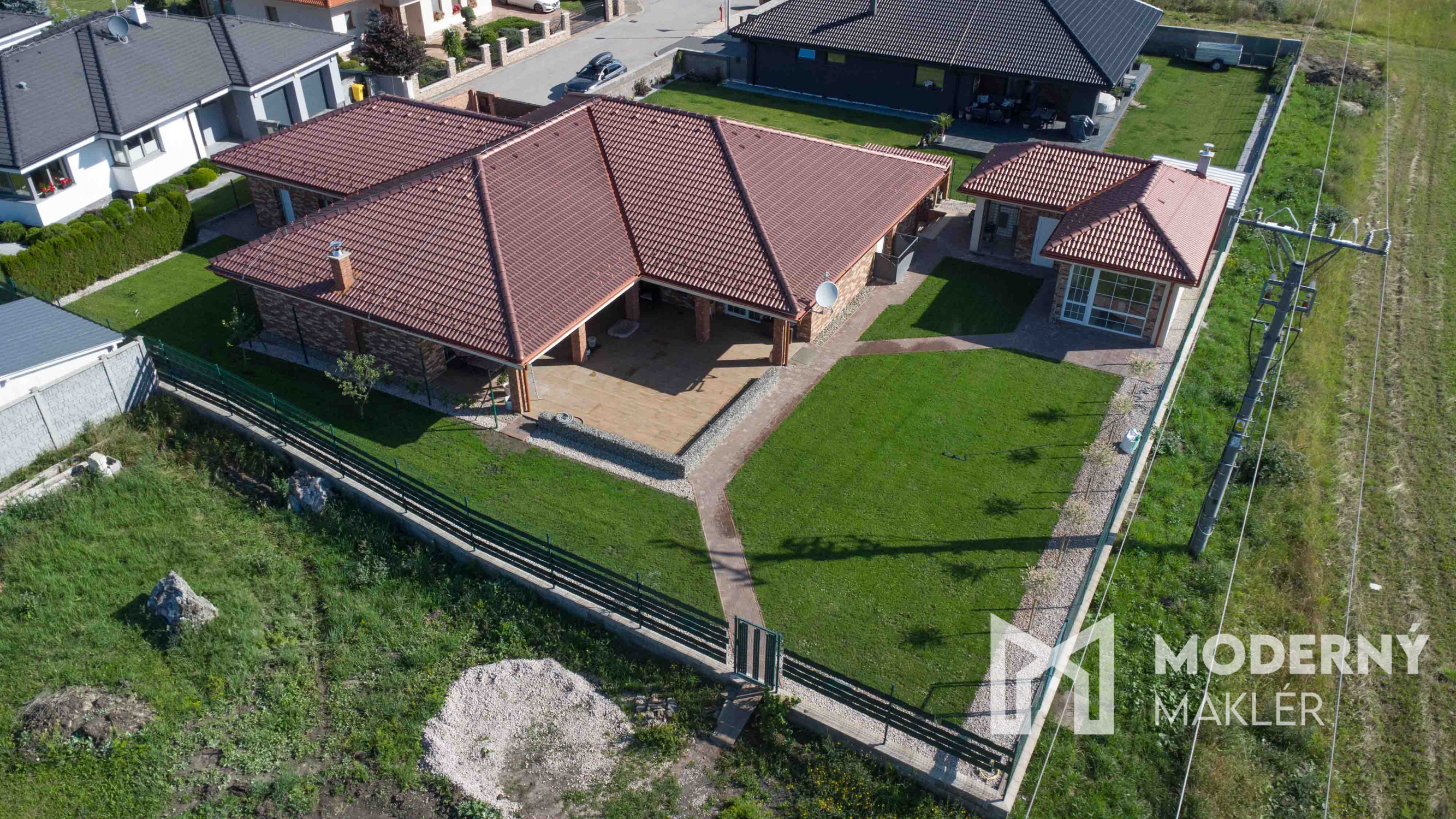 Dom je postavený z najmodernejších a energeticky efektívnych materiálov. Ytong Lambda 45 cm poskytuje vynikajúce tepelnoizolačné a zvukové vlastnosti, zatiaľ čo 10 cm hrubé zateplenie polystyrénom zaručuje nízke prevádzkové náklady a príjemnú klímu po celý rok. Fasádu zdobí elegantný tehlový obklad, ktorý podčiarkuje exkluzívny charakter stavby a zároveň ju chráni pred poveternostnými vplyvmi. Plastové okná s izolačným trojsklom zabezpečujú vynikajúcu tepelnú izoláciu, a vonkajšie bezpečnostné žalúzie s elektrickým ovládaním na všetkých oknách zabezpečujú súkromie. Vykurovanie je riešené teplovodným podlahovým systémom v kombinácii s moderným tepelným čerpadlom a zásobníkom vody s objemom 500 litrov. Dom je vybavený inteligentným systémom Loxone, ktorý umožňuje automatizované ovládanie osvetlenia, kúrenia a ďalších funkcií podľa individuálnych potrieb z mobilného zariadenia aj na diaľku. Predpríprava na kamerový systém už bola realizovaná. Budúci majiteľ sa môže tešiť na dokončený zavlažovací systém, výsadbu trávnika, okrasné dreviny, nový exteriérový obklad pred garážou a štýlové vonkajšie osvetlenie, ktoré bude dokončené pred predajom novému majiteľovi. Celý pozemok je oplotený a jeho exkluzivitu podčiarkuje ručne kovaná medená brána, ktorá je skutočným dizajnovým skvostom.