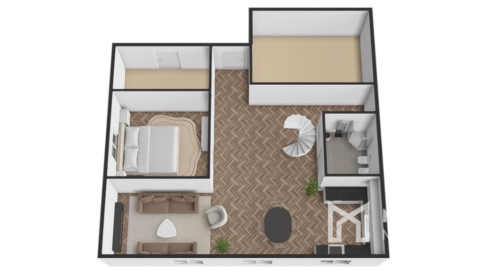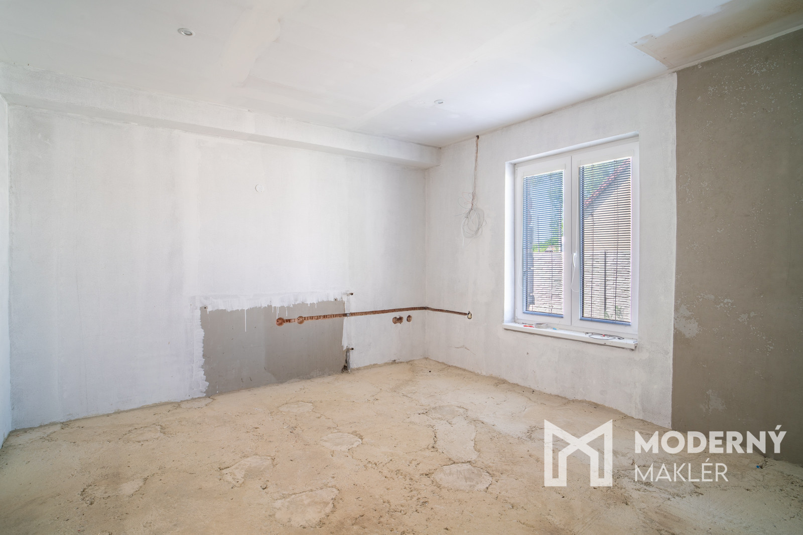 Rodinný dom má premyslenú dispozíciu, ktorá ponúka viacero možností využitia. Zo vstupnej haly vedie prístup do kúpeľne a samostatného WC na jednej strane, na opačnej strane sa nachádza nepriechodná izba vhodná ako spálňa, pracovňa či hosťovská izba. Zvyšok prízemia tvorí veľkorysý otvorený priestor, ktorý je pripravený na zariadenie kuchyne s jedálňou a obývacou časťou – ideálne miesto pre spoločné chvíle celej rodiny. Súčasťou domu je aj podkrovie, ktoré síce momentálne nemá zhotovené schodisko, no ponúka potenciál na vytvorenie ďalších obytných miestností podľa vlastných predstáv. K nehnuteľnosti navyše prislúchajú dve samostatné miestnosti, ktoré je možné funkčne prepojiť s hlavnou obytnou časťou a rozšíriť tak obytný priestor domu.