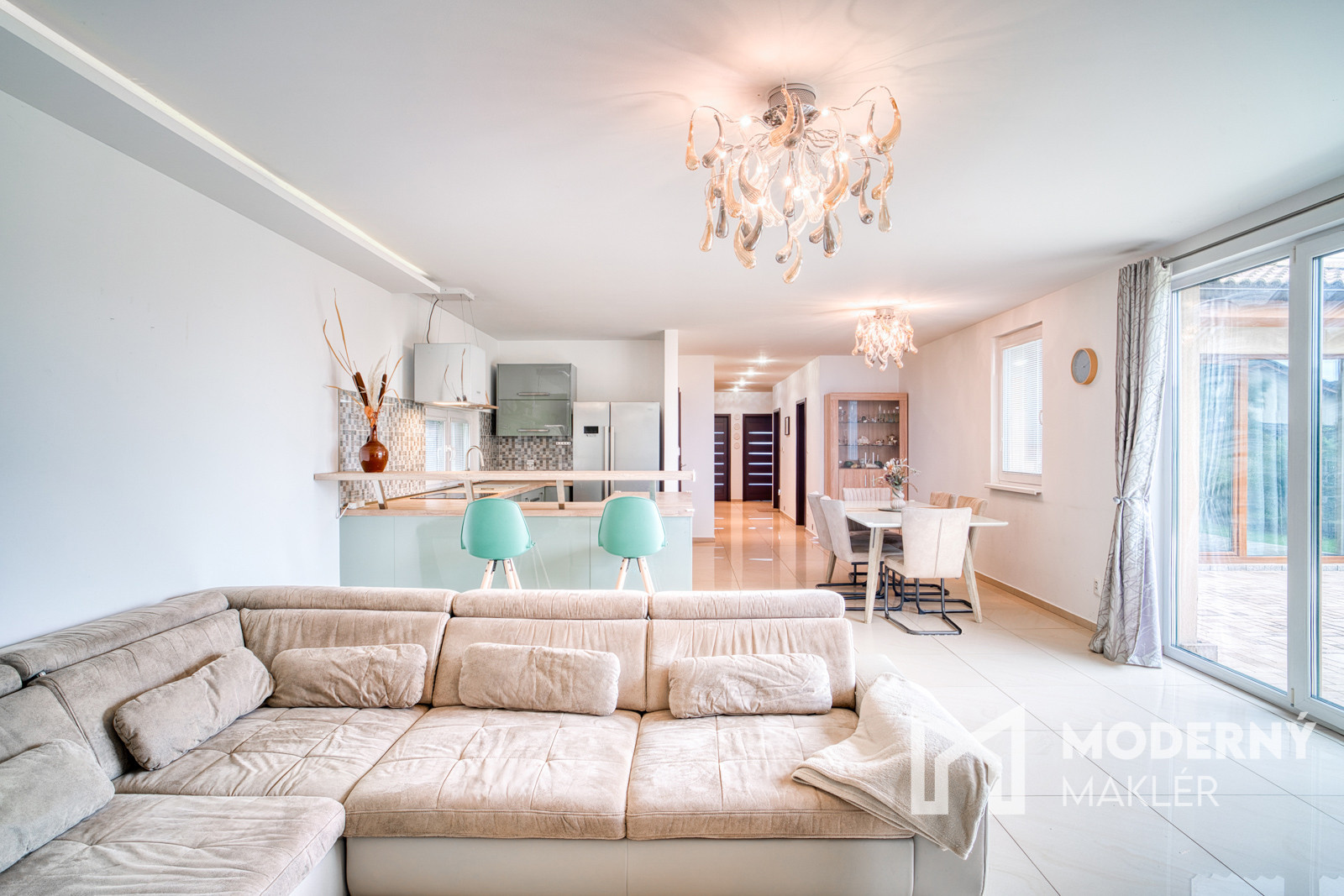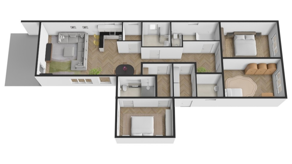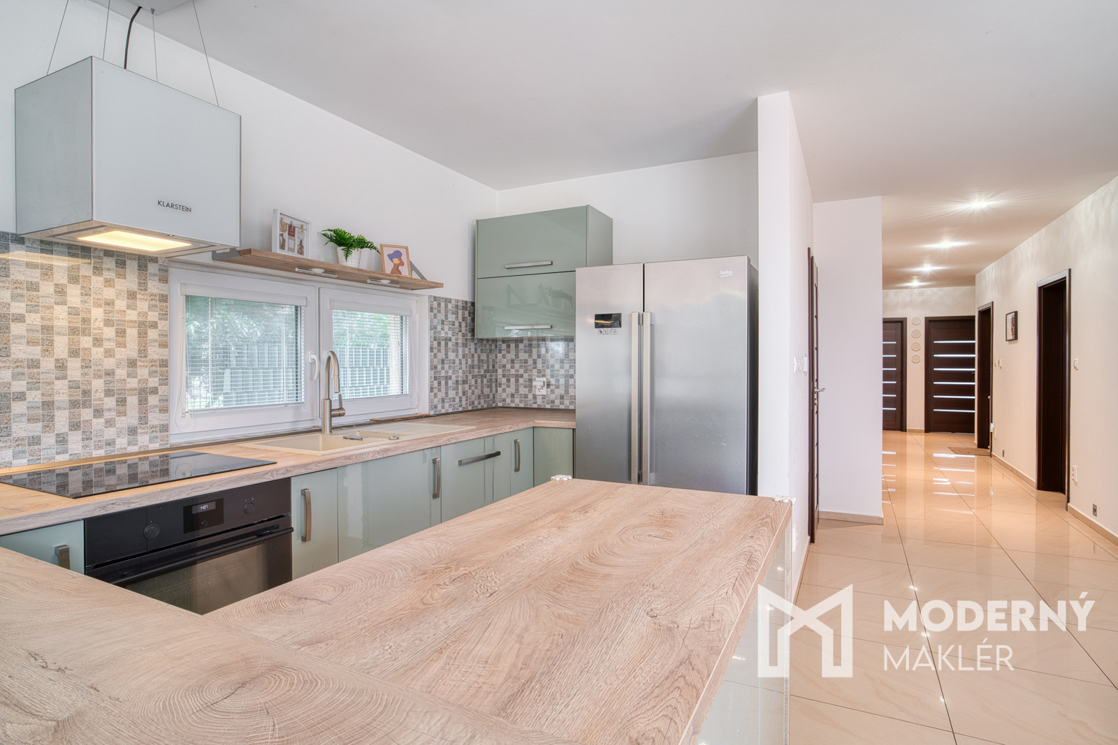 Za vstupnými dverami vás privíta praktická predsieň, odkiaľ sa vstupuje do samostatného WC a hlavnej chodby, ktorá prepája všetky časti domu. K dispozícii sú dve samostatné izby, kúpeľňa, technická miestnosť a praktická špajza – ideálna na každodenné uskladnenie potravín. Dominantou domu je spálňová časť, do hlavnej spálne sa vchádza cez priestranný šatník so vstavanou šatníkovou skriňou s posuvnými dverami. Bonusom je priľahlá menšia izba s možnosťou vybudovania vlastnej rodičovskej kúpeľne. Zo spálne vedie priamy výstup na terasu – ideálne miesto na oddych či rannú kávu. Srdcom domu je vzdušný, otvorený priestor kuchyne spojenej s jedálňou a obývacou izbou, ktorý prirodzene prepája rodinný život. Aj z tejto časti je možný priamy vstup na terasu, ktorá je orientovaná na juhovýchod – perfektná poloha na vychutnanie si prvých ranných lúčov pri šálke kávy.