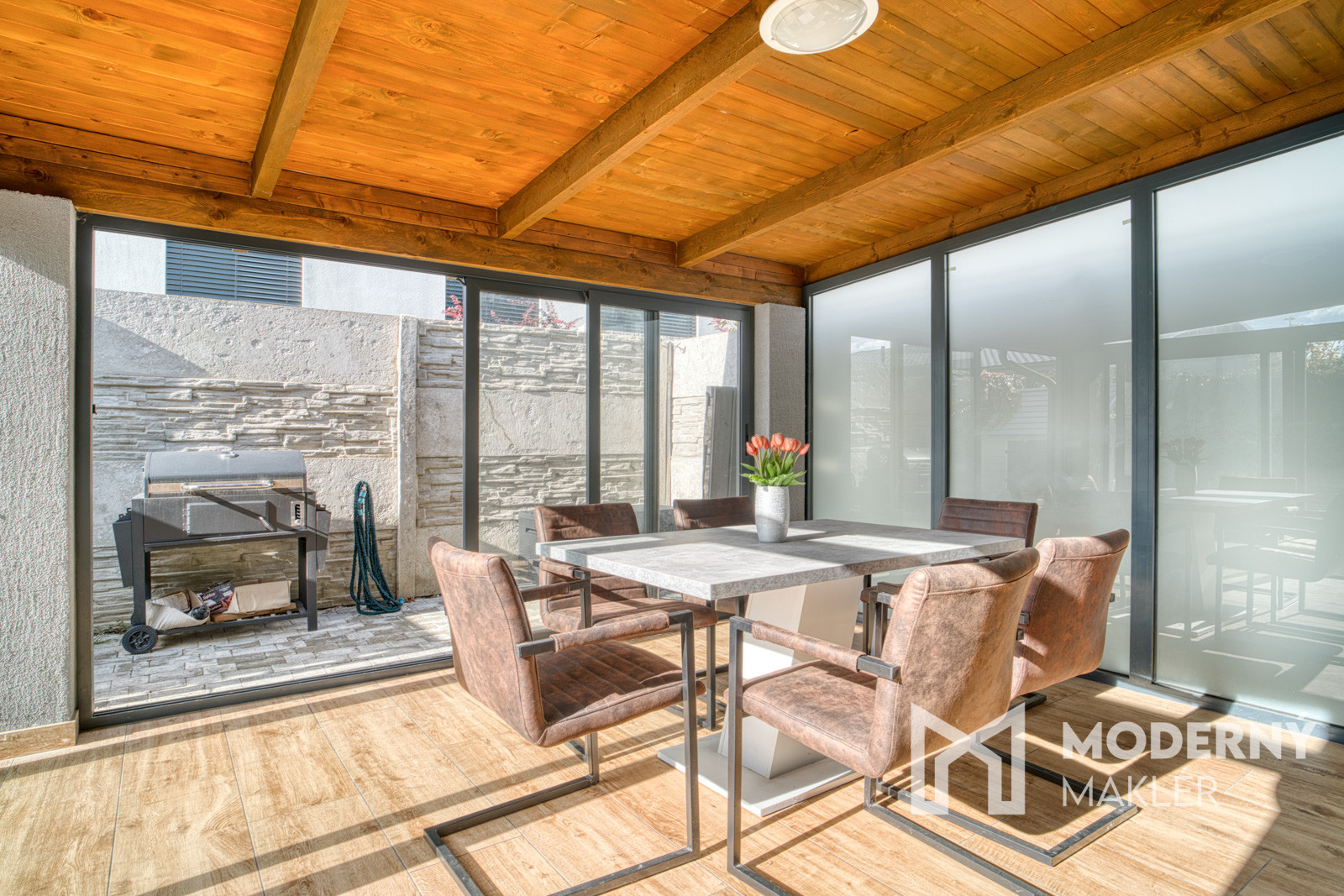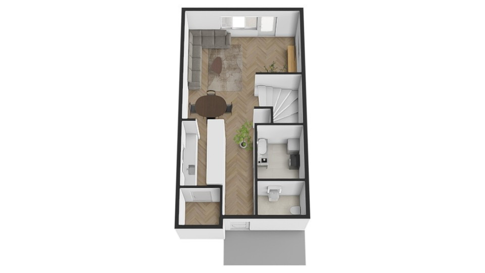 Na prízemí sa nachádza vstupná predsieň, kuchyňa spojená s obývacou izbou, praktická špajza v kuchyni, samostatná toaleta, odkladací priestor pod schodami a presklenená terasa, ktorá príjemne rozširuje obytný priestor o zónu na oddych a posedenie.