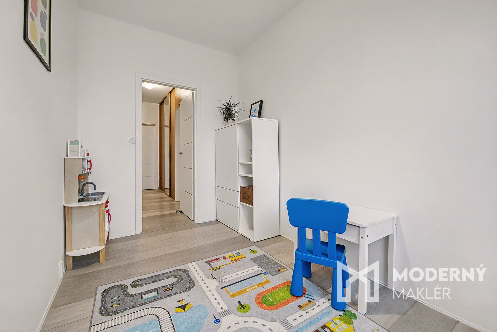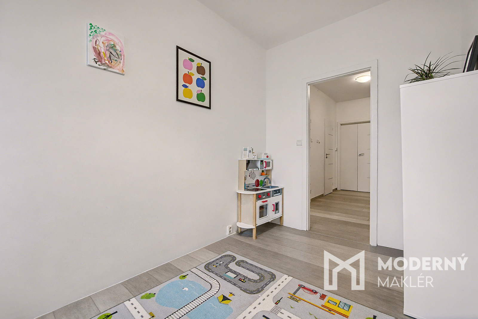 Byt sa skladá z priestrannej vstupnej chodby, ktorá je prepojená s hlavným vstupom do obývacej časti. V byte nájdete obývaciu izbu s výstupom na prvú loggiu, ktorá zabezpečuje prirodzené osvetlenie a príjemný kontakt s exteriérom. Zo vstupnej chodby pokračuje druhá chodba, z ktorej sú samostatné vstupy do jednotlivých miestností. Na ľavej strane sa nachádza detská izba, následne kuchyňa, ďalej samostatná toaleta a kúpeľňa. Na pravej strane je situovaný vstup do spálne s vlastným vstupom na druhú loggiu. Byt má západnú orientáciu a disponuje celkovo dvoma loggiami, ktoré poskytujú priestoru vzdušnosť a prirodzené svetlo.