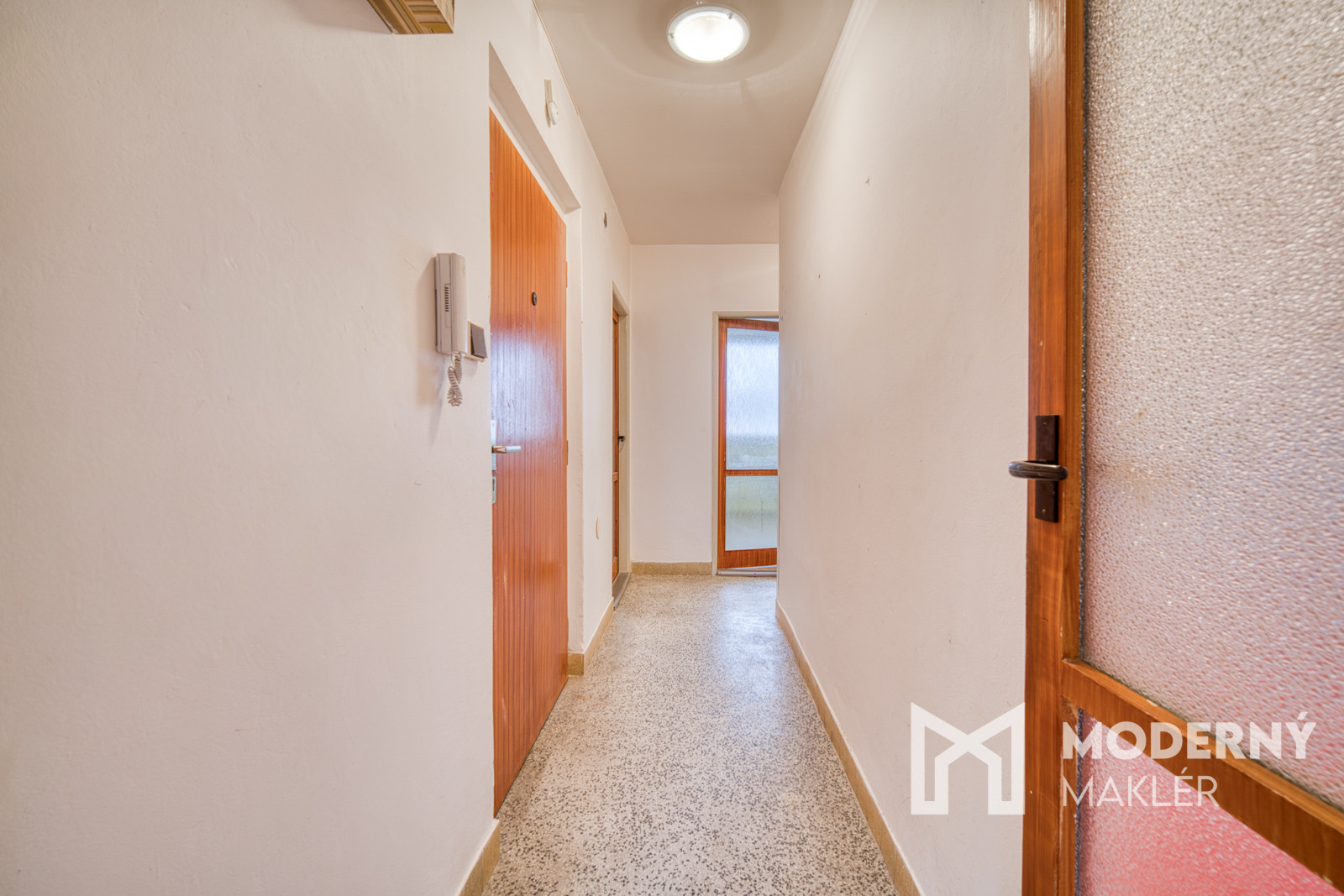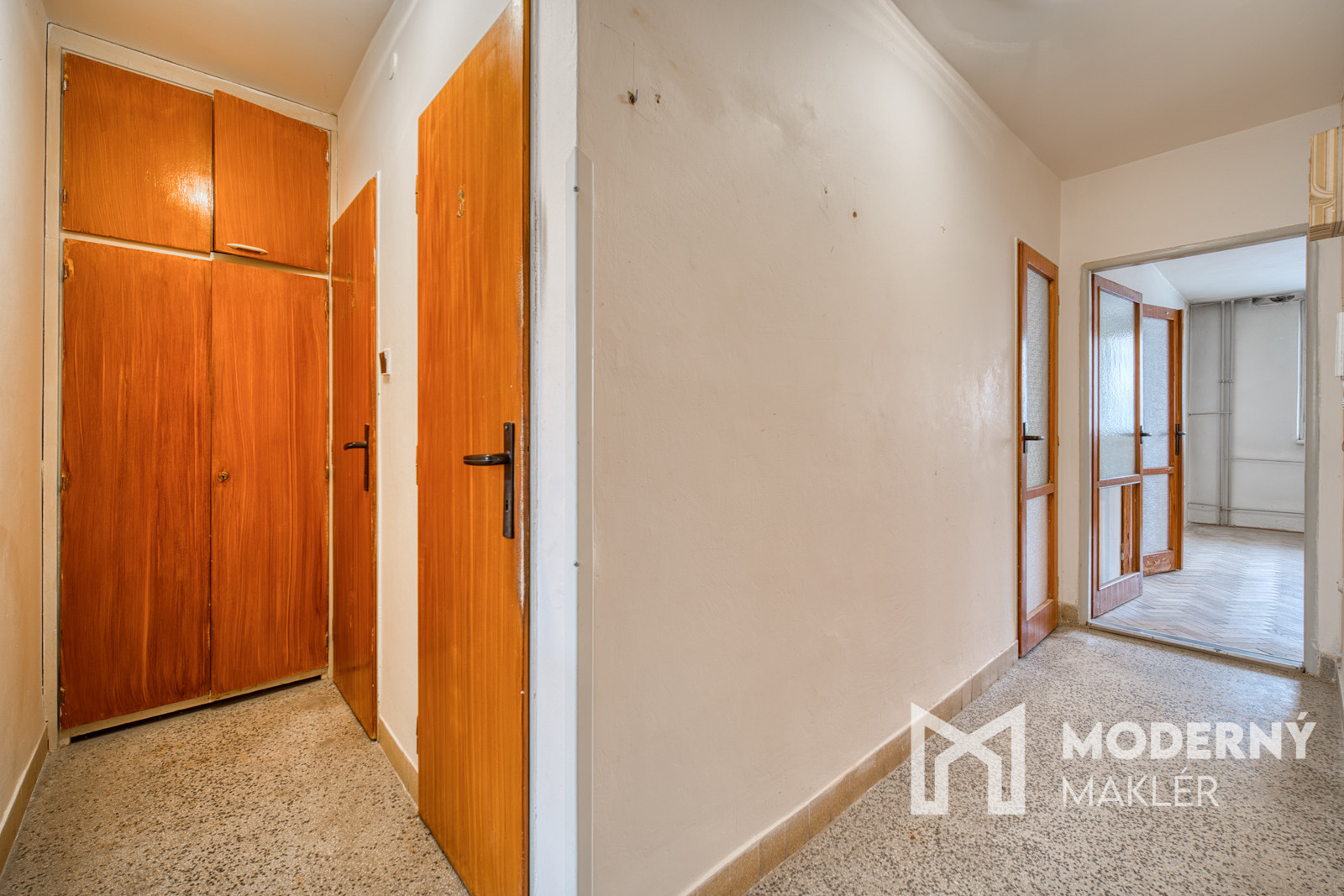 Byt pozostáva zo vstupnej chodby, z ktorej sa smerom doľava nachádza priestranná kuchyňa s výstupom na loggiu a do obývačky. Na pravej strane od vstupu sú dve samostatné izby, kúpeľňa a samostatné WC. Byt sa predáva nezariadený.
