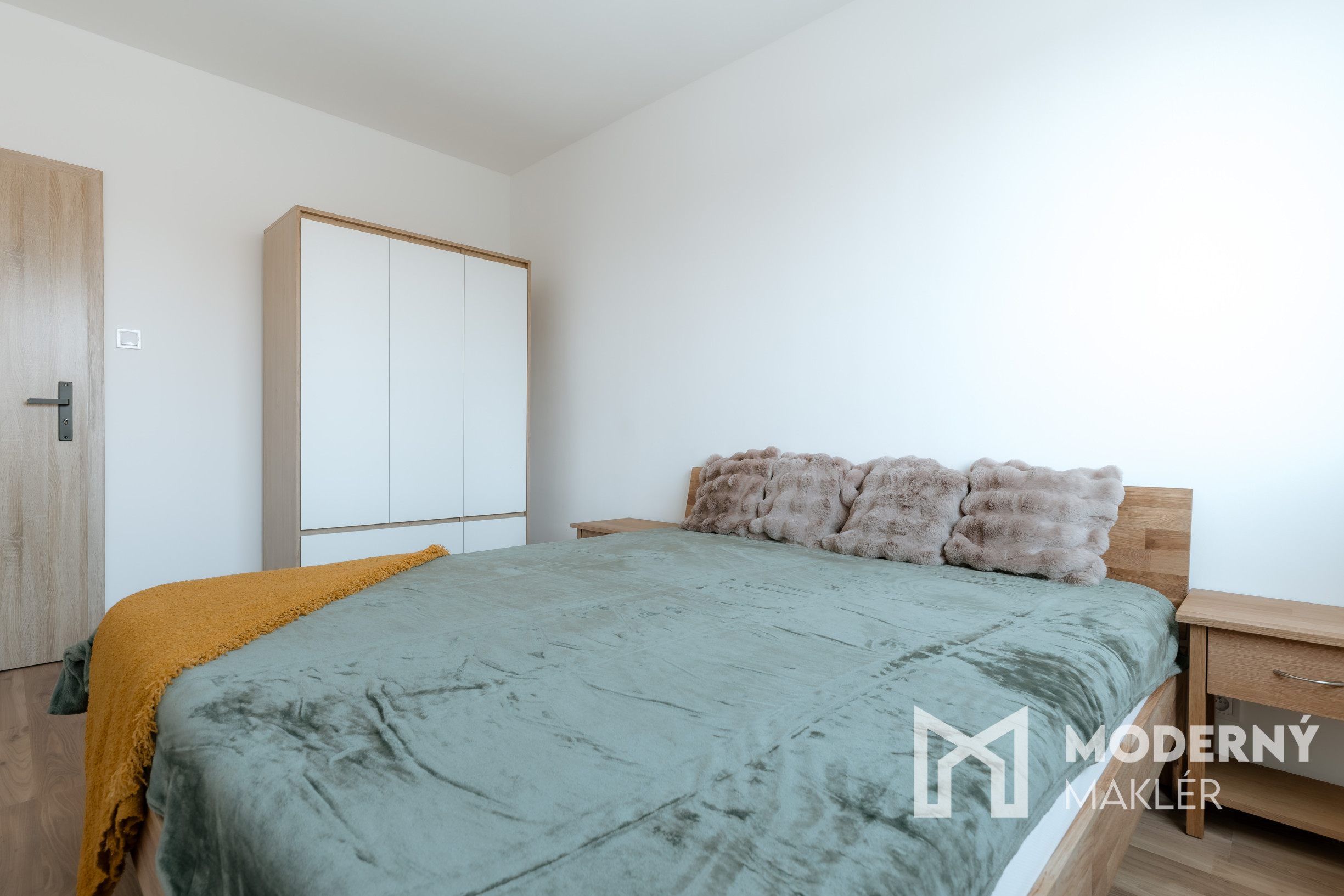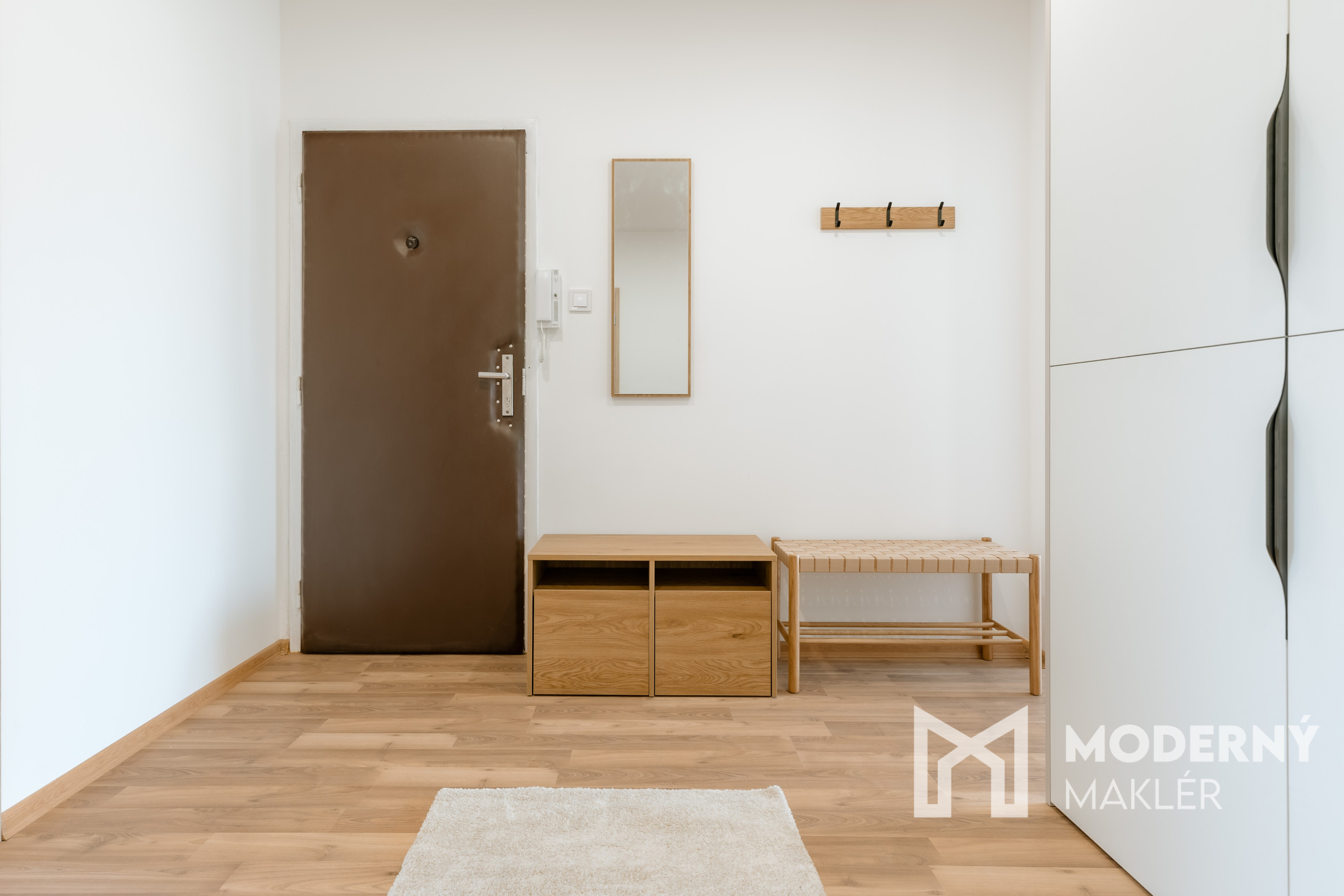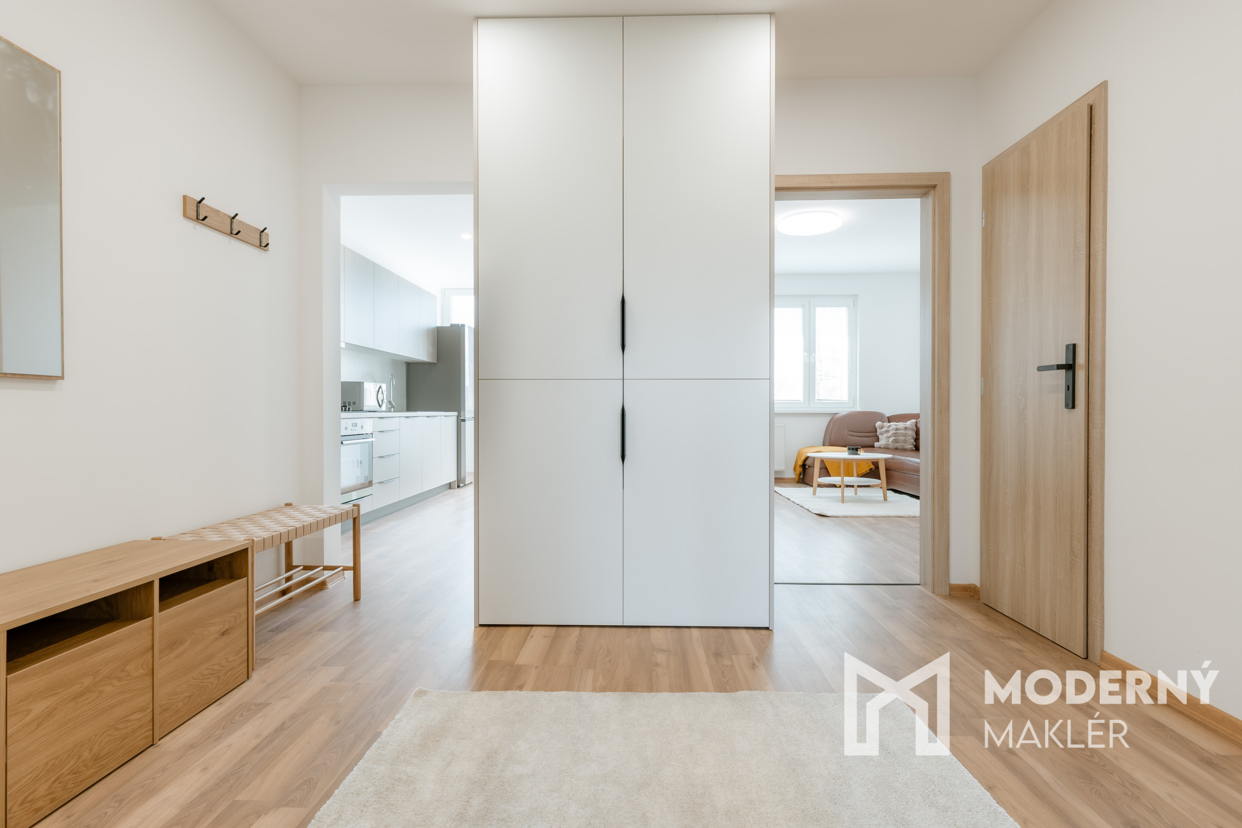 Byt sa prenajíma kompletne zariadený a ponúka praktické dispozičné riešenie. Vstupná chodba je vybavená priestrannou vstavanou skriňou. Srdcom bytu je nová kuchynská linka vyrobená na mieru, doplnená o novú chladničku, plynový sporák s elektrickou rúrou, jedálenský stôl a barové stoličky. Spálňa poskytuje komfort vďaka manželskej posteli a šatníkovej skrini, zatiaľ čo obývacia izba je zariadená pohodlným rohovým gaučom, konferenčným stolíkom a TV zostavou s úložným priestorom. V kúpeľni sa nachádza práčka. Detská izba je momentálne nezariadená, čo budúcemu nájomcovi umožňuje flexibilitu – konkrétne vybavenie je však možné dohodnúť podľa potrieb.