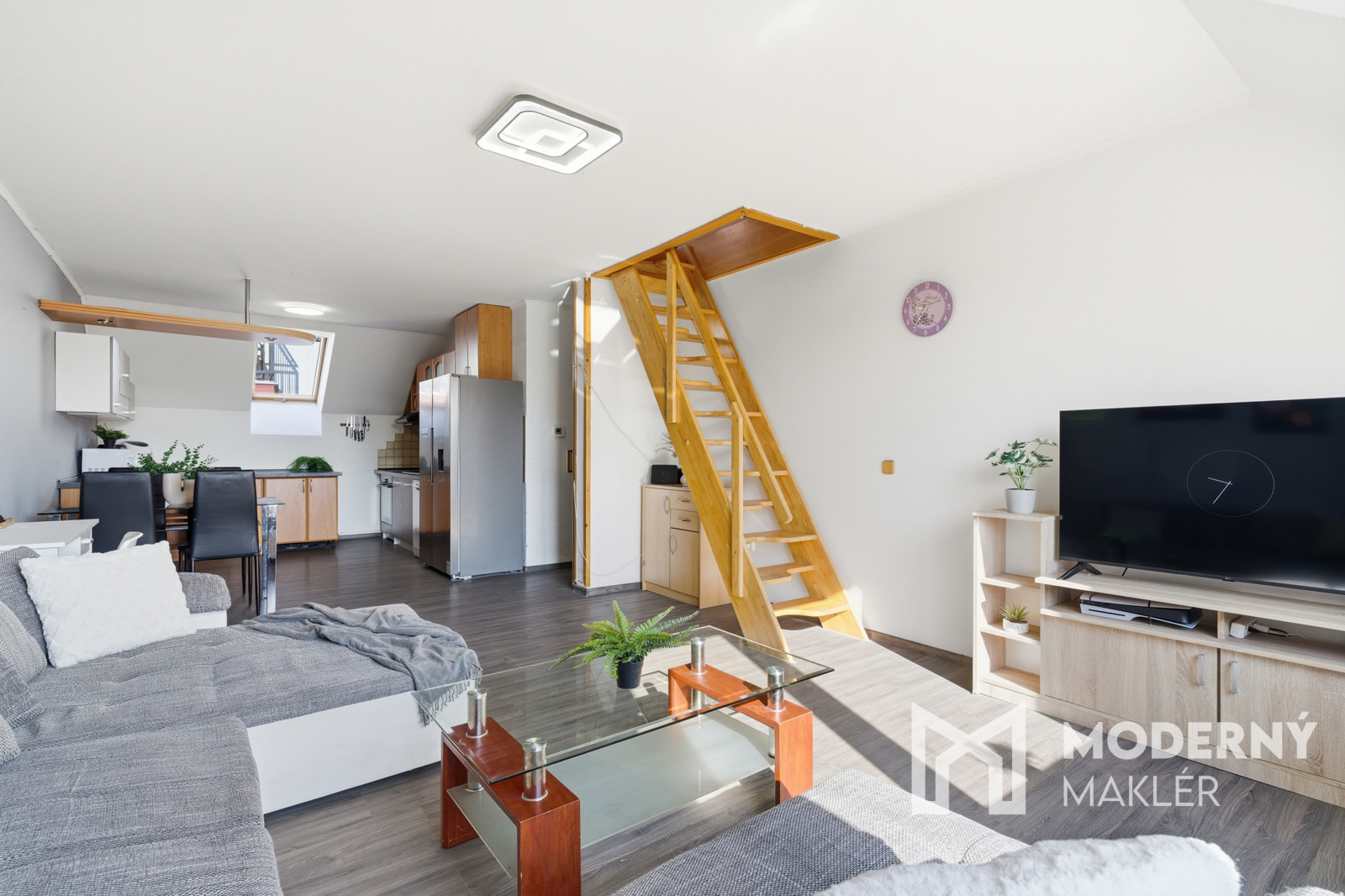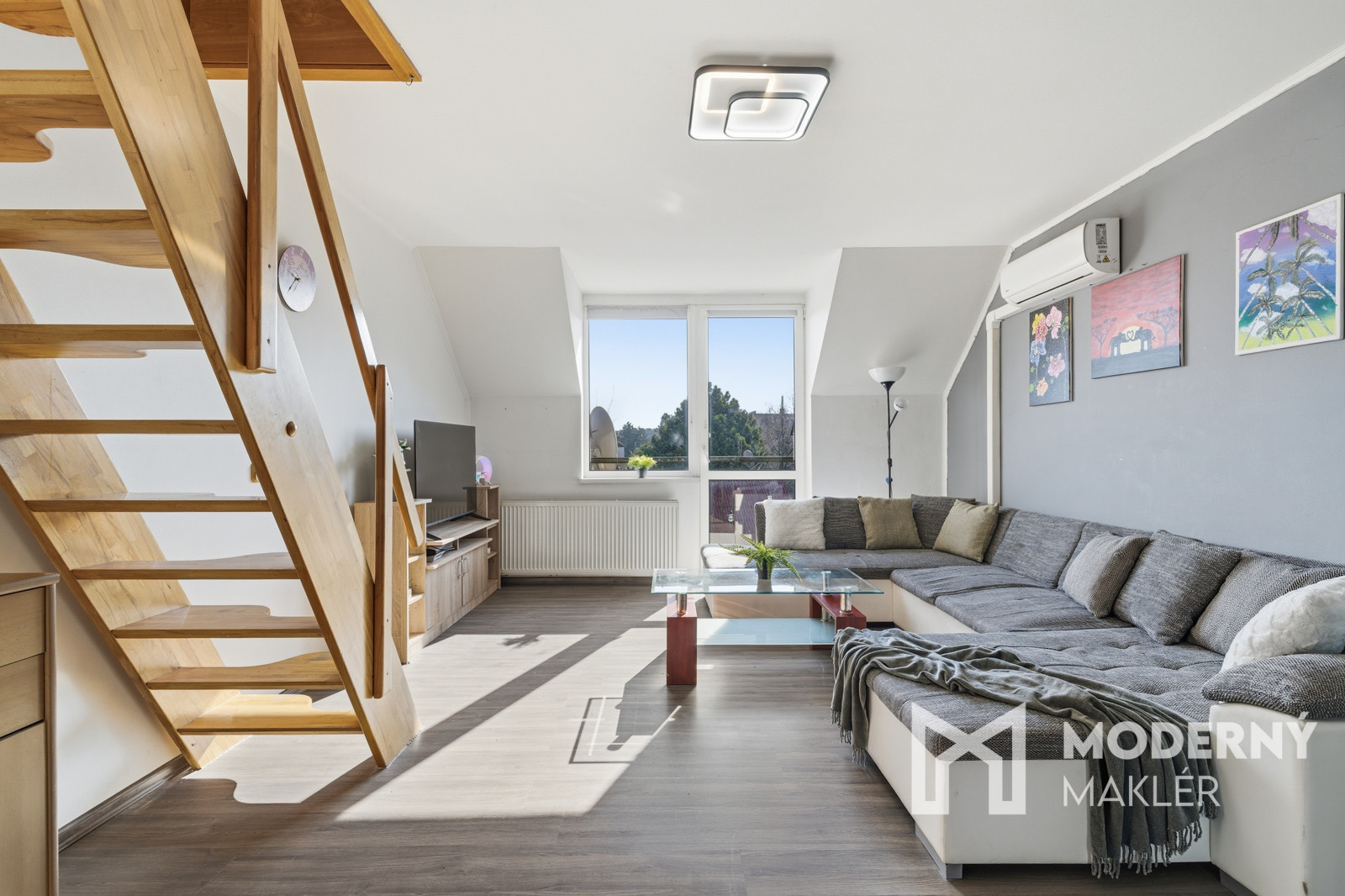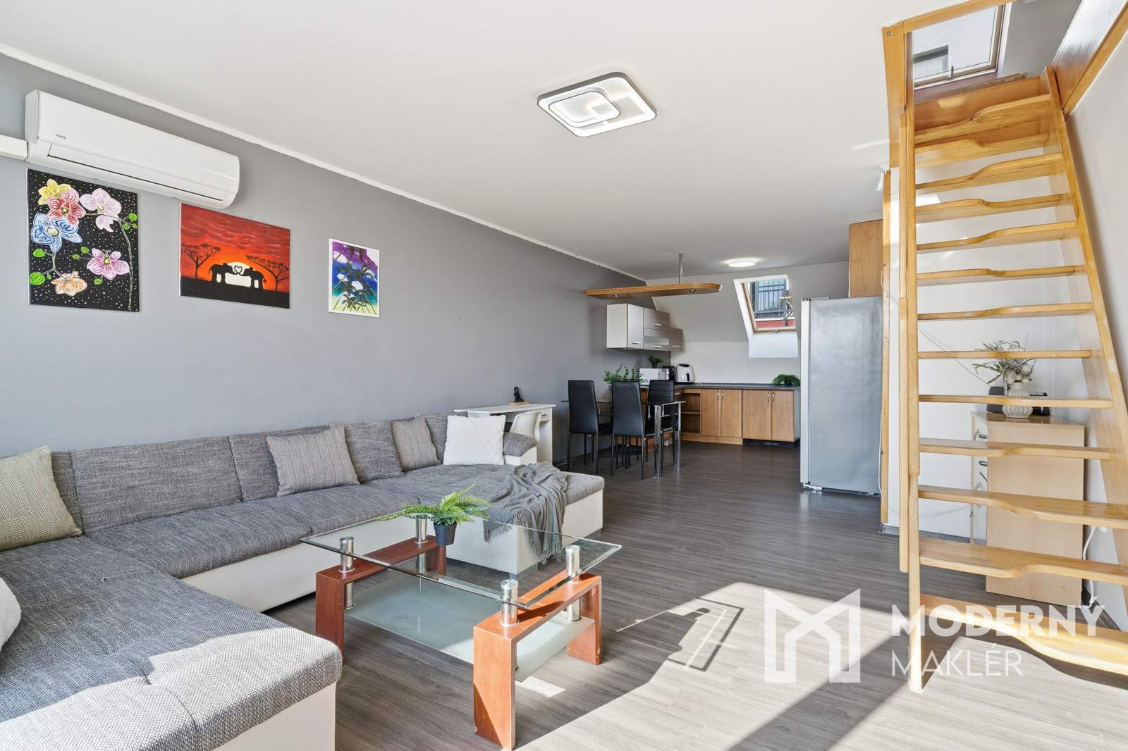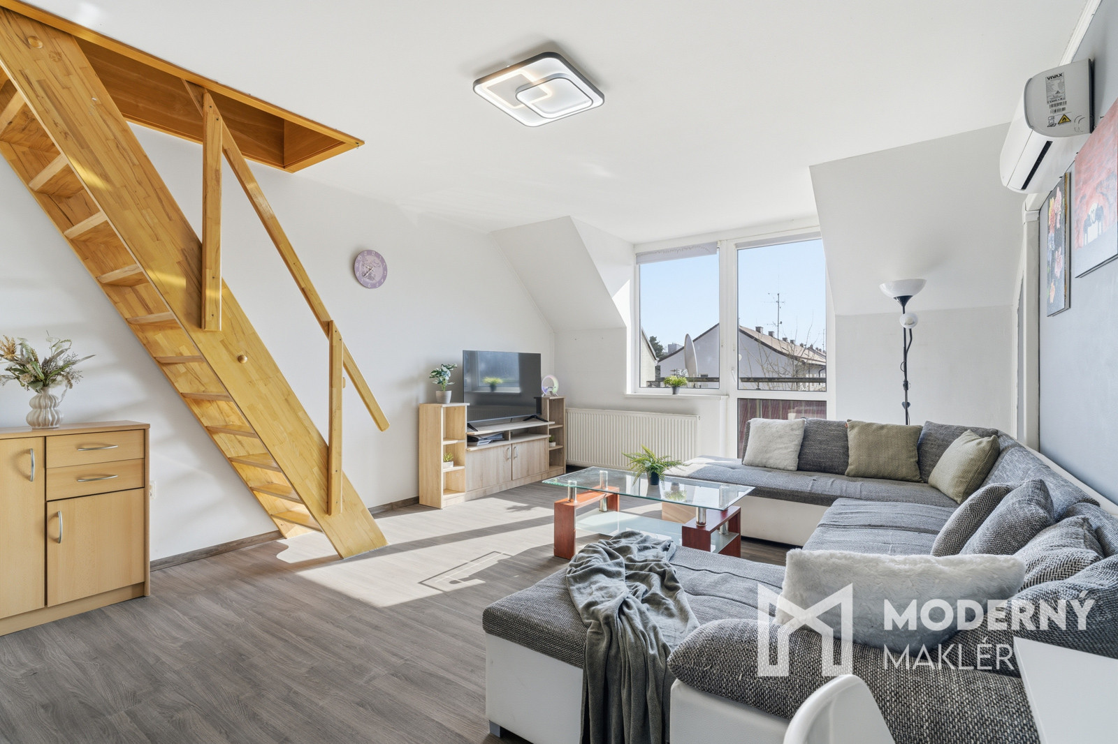 Byt sa rozprestiera na dvoch podlažiach a ponúka praktické riešenie bývania. Na prvom podlaží nájdete vstupnú chodbu, ktorá vás privíta pri vstupe do nehnuteľnosti. Ďalej sa nachádza samostatná toaleta pre dodatočné pohodlie a kúpeľňa so sprchovým kútom. Priestranná spálňa je vybavená vstavanou skriňou a balkónom, ktorý poskytuje príjemný vonkajší priestor. Centrálnym bodom prvého podlažia je kuchyňa spojená s obývačkou, ktorá je vybavená klimatizáciou a má výstup na 2. balkón. Z obývacej časti vedú schody na druhé podlažie, kde sa nachádza vstupná časť a dve samostatné podkrovné izby, ktoré možno využiť ako dodatočné spálne, pracovne alebo úložné priestory. Nehnuteľnosť je orientovaná na východ - západ, čo zabezpečuje príjemné ranné osvetlenie prirodzeným svetlom.
