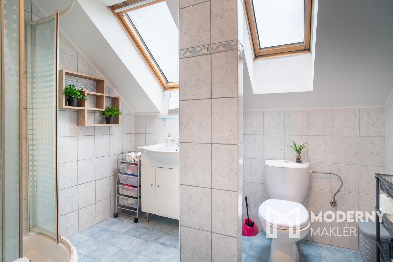 Na poschodí sa nachádza kúpeľňa a tri izby – dve za kúpeľňou a jedna na ľavej strane od schodiska. Podkrovie s rozlohou 30 m² je možné zobytnit. Celkovo dom ponúka štyri izby, dve kúpeľne, technickú miestnosť, priestrannú obývačku s kuchyňou a praktickú loggiu pri vstupe.