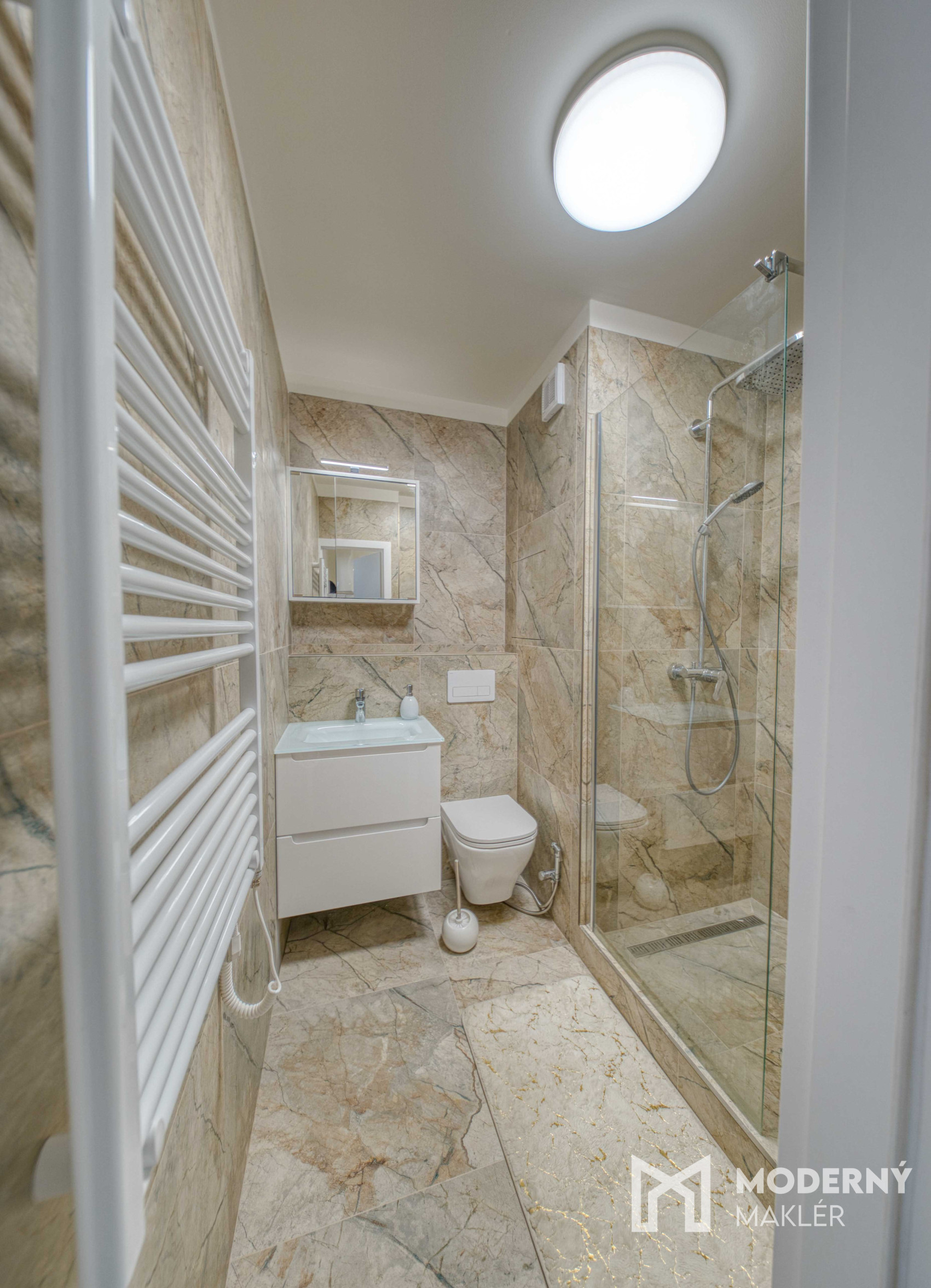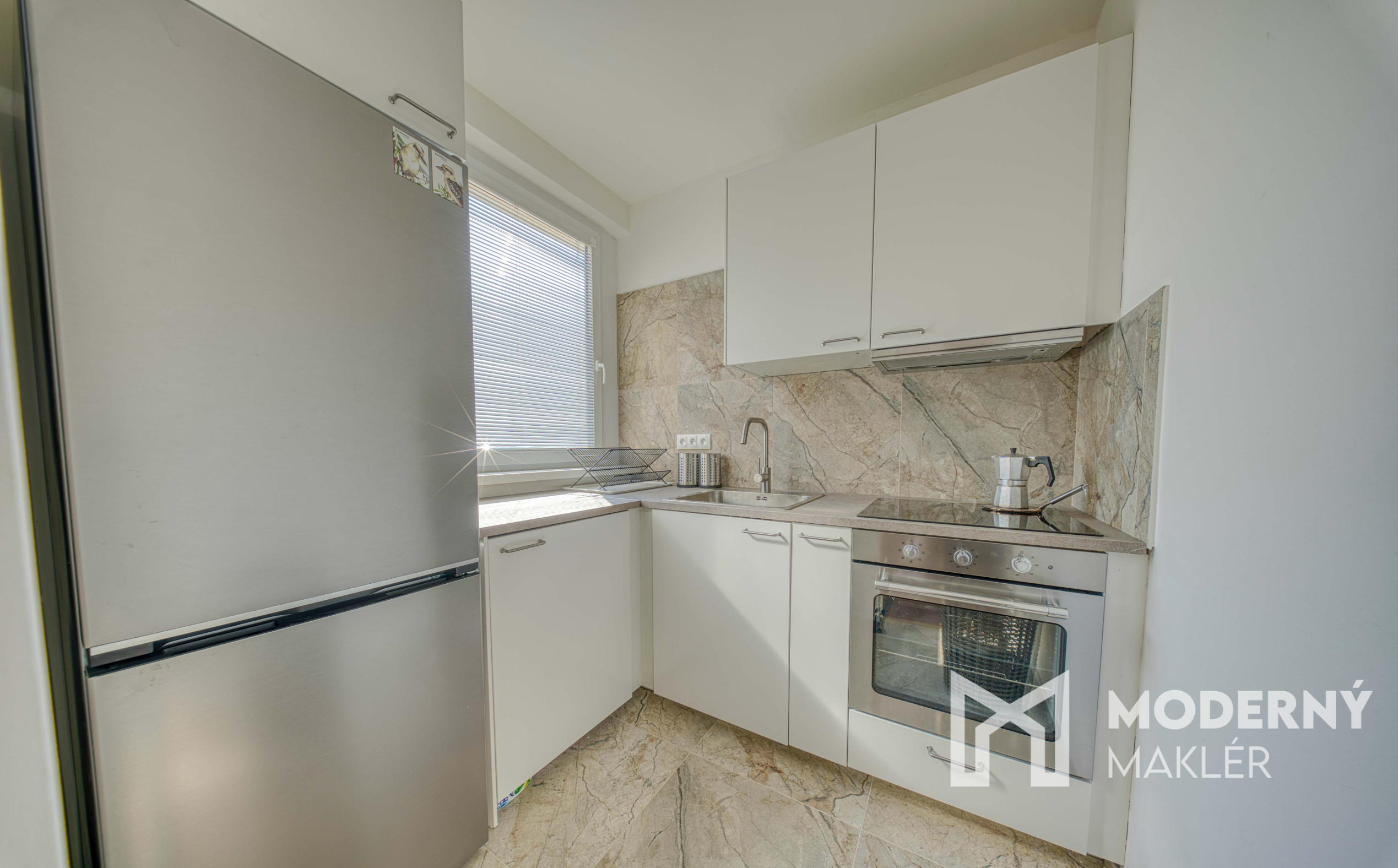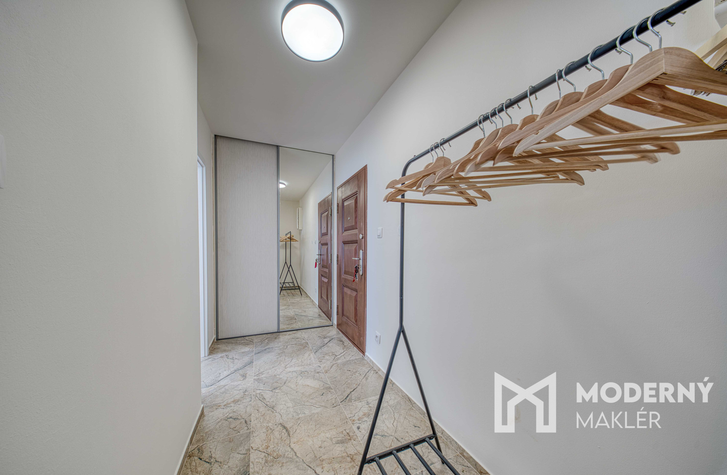 Nehnuteľnosť sa skladá zo vstupnej chodby so vstavanou skriňou, z ktorej máte priamy prístup do menšej spálne. Z chodby sa dostanete aj do krásnej kúpeľne vybavenej veľkou sprchou, WC a umývadlom. Chodba ďalej vedie do priestrannej obývacej miestnosti, z ktorej máte vstup na loggu a do kuchyne.