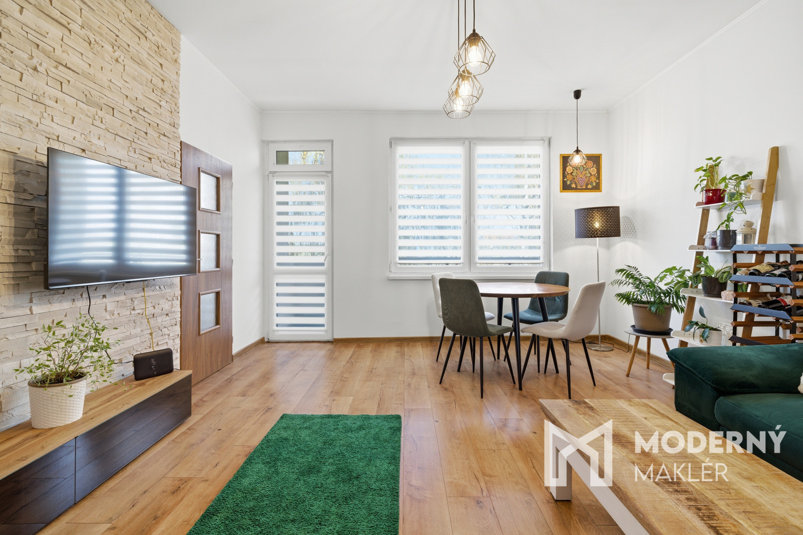 Obývacia izba je zariadená sedacou súpravou, konferenčným stolíkom, dizajnovým jedálenským stolom so stoličkami, knižnicou a TV stolíkom s televízorom. Priestor dopĺňa biokrb, ktorý vytvára príjemný vizuálny aj pocitový komfort.
