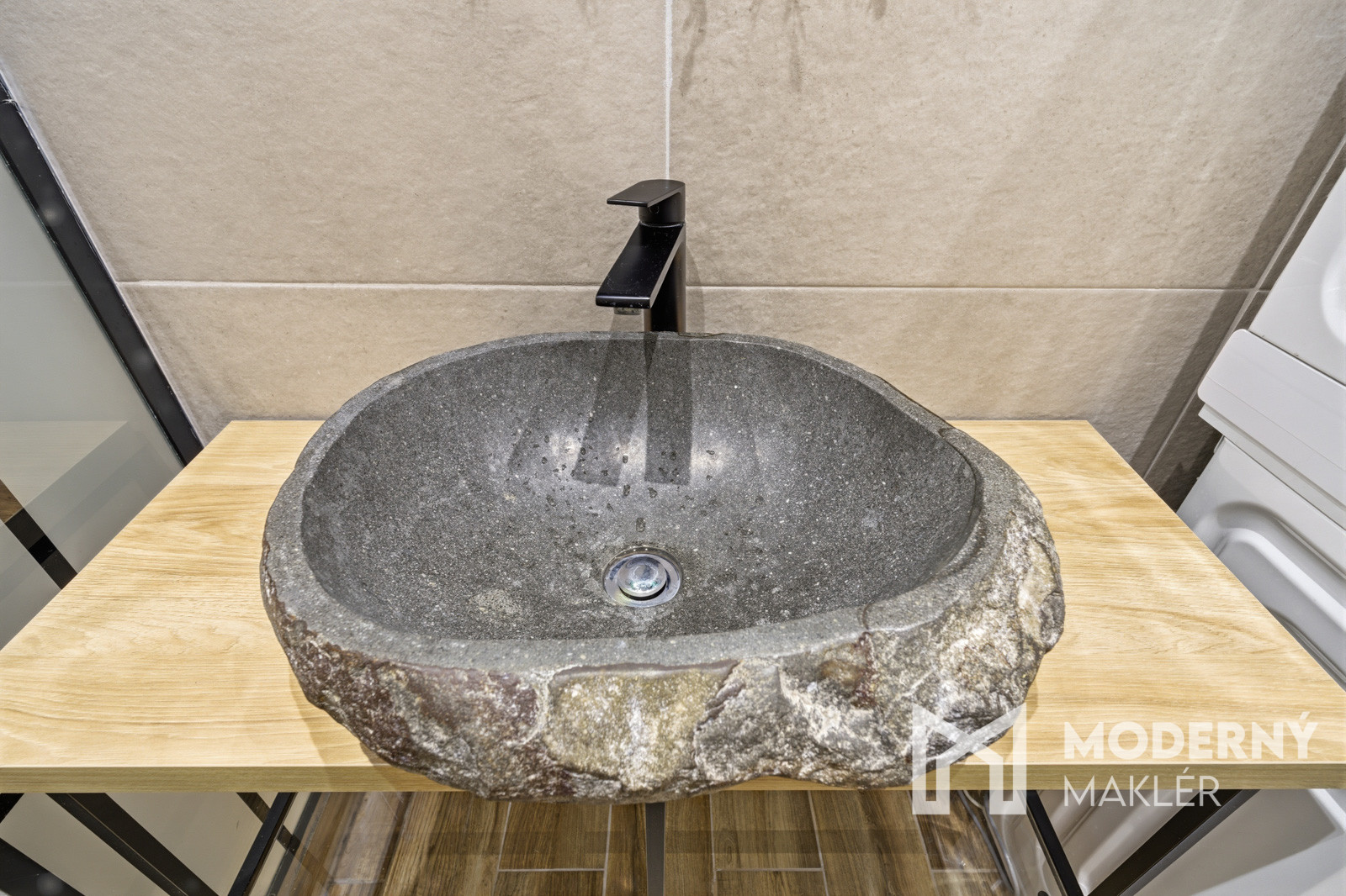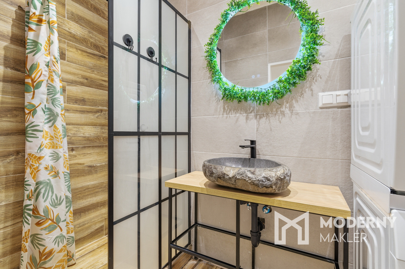 Kúpeľňa je vybavená sprchovým kútom a úplne novou práčkou so sušičkou, ktoré sú súčasťou predaja.