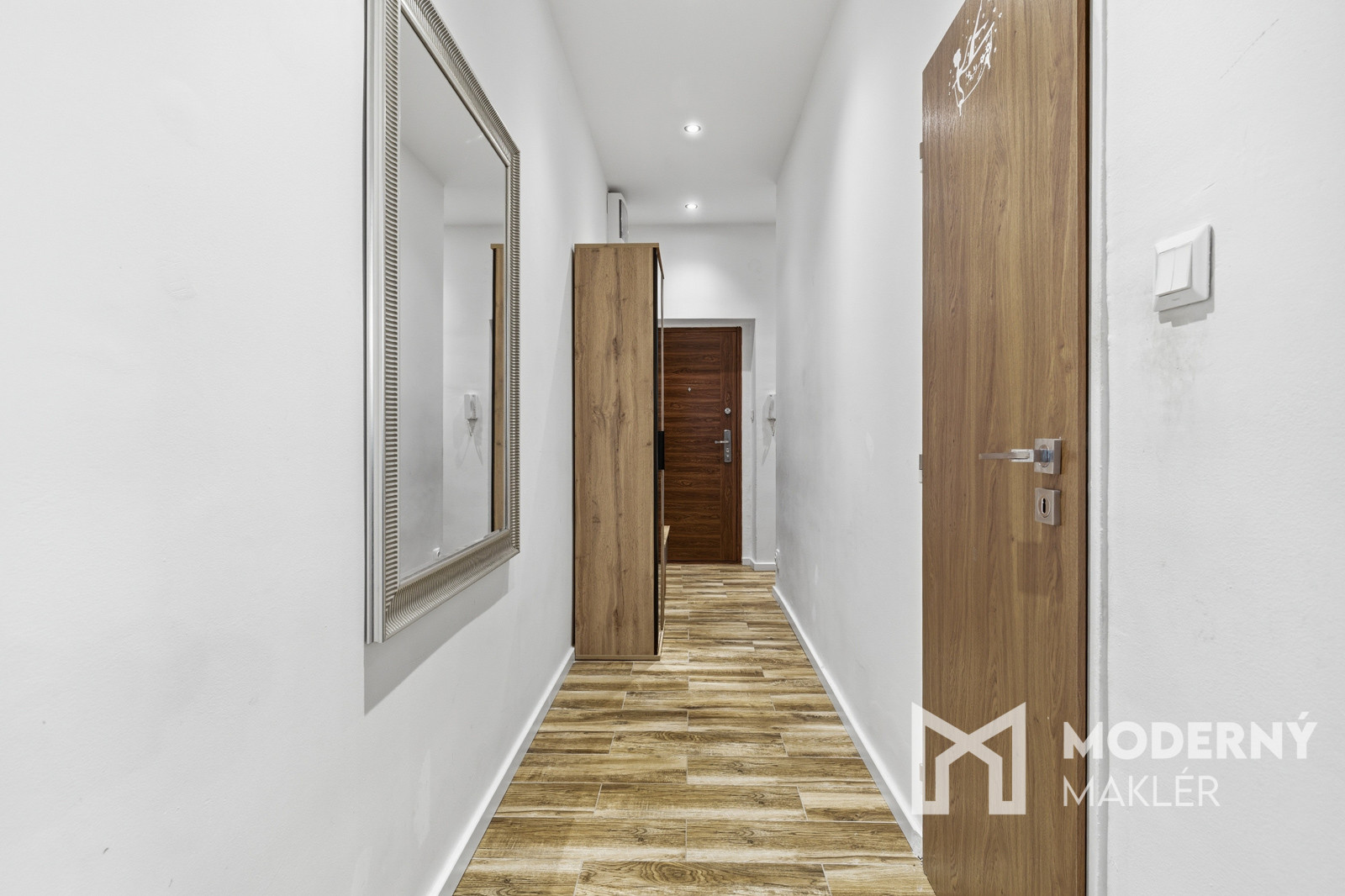 Vstupná chodba je riešená prakticky so šatníkovou zostavou a botníkom, ktoré poskytujú dostatok miesta na odkladanie vecí a udržiavanie poriadku.