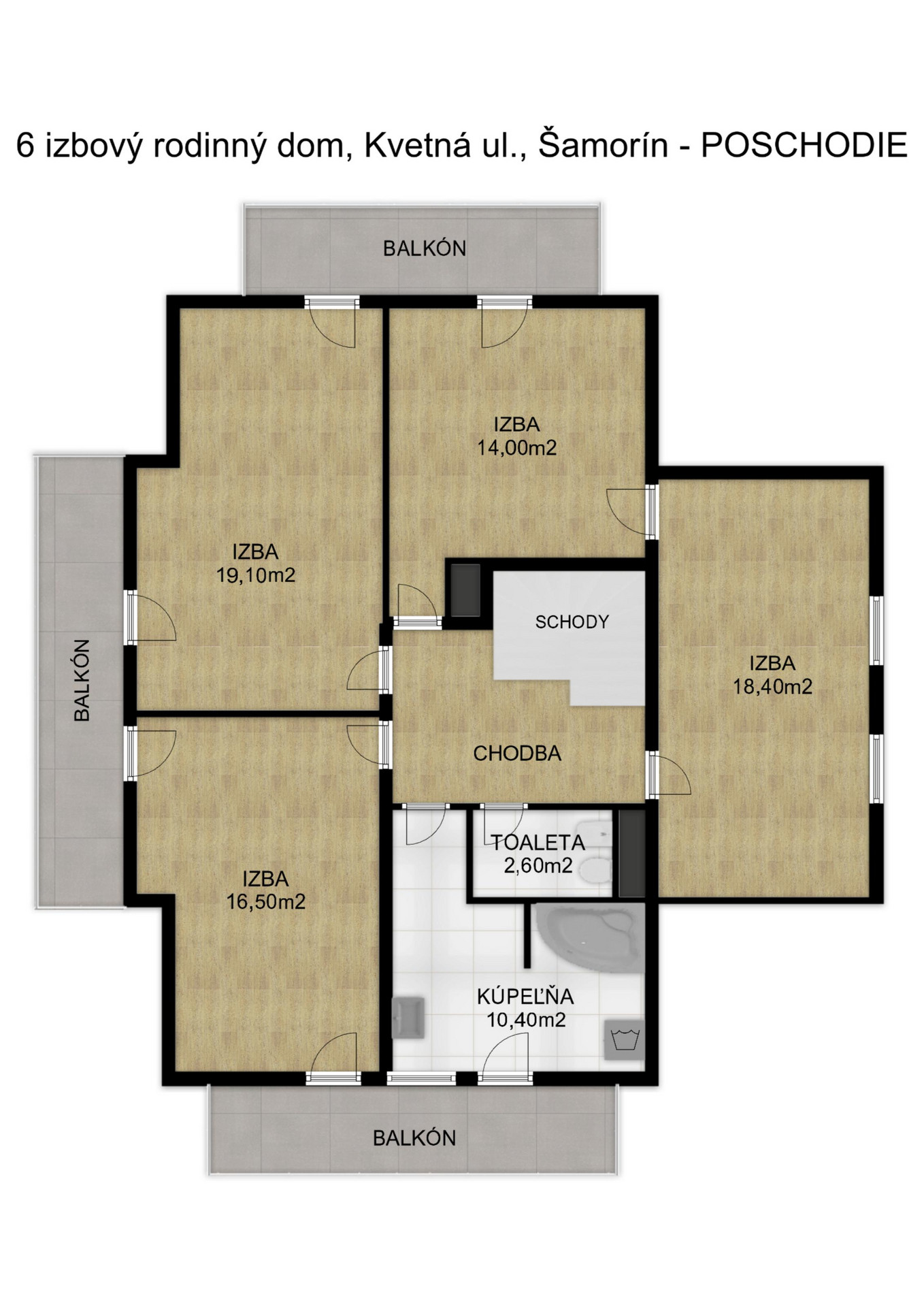 Na poschodí nájdete štyri samostatné izby, pričom až z troch z nich je zabezpečený priamy výstup na balkón. Dominantou poschodia je veľká kúpeľňa s vaňou, prípravou na sprchovací kút a dvoj umývadlom, doplnená o samostatné WC s bidetom. Všetky izby pôsobia vzdušne a priestranne s dostatkom denného svetla, čo podčiarkuje príjemnú atmosféru celého domu.