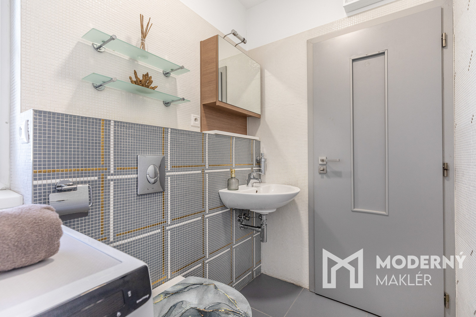 Po vstupe do nehnuteľnosti sa dostanete do priestrannej obývacej izby prepojenej s jedálenskou časťou, ktorá pôsobí mimoriadne vzdušne vďaka svojej veľkorysej rozlohe. Z obývacieho priestoru je priamy výstup na priestranný balkón, ktorý prirodzene rozširuje dennú zónu. Na dennú časť nadväzuje samostatná kuchyňa vybavená kuchynskou linkou vyrobenou na mieru a vstavanými spotrebičmi (sklo keramická varná doska, elektrická rúra, umývačka riadu a digestor). Pri kuchyni sa nachádza praktická komora pre dodatočné úložné priestory. Spodné podlažie dopĺňa samostatná toaleta spojená s práčovňou, ktorá ponúka dostatočný priestor pre umiestnenie práčky, sušičky a ďalšieho vybavenia.