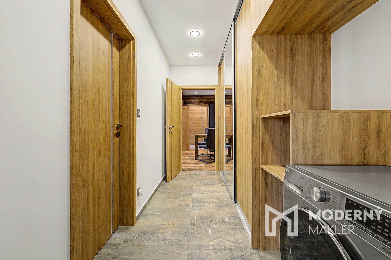 Nehnuteľnosť sa predáva kompletne zariadená vrátane nábytku vyrobeného na mieru. Vstupná chodba je vybavená zásuvným systémom s množstvom úložného priestoru. Z chodby je priamy vstup do kuchyne s úplne novou kuchynskou linkou vrátane spotrebičov a rozsiahlym úložným priestorom. Obývacia izba je zariadená jedálenským sedením, sedacou súpravou, kreslom, vkusnou nábytkovou zostavou vyrobenou na mieru, televízorom a konferenčným stolíkom. Z obývacej izby je východ na prvý balkón s výhľadom do zelene. Chodba je vybavená vstavanými skriňami a priestorom pre pračku so sušičkou. Detská izba je bez zariadenia. Hlavná spálňa obsahuje manželskú posteľ, vstavaný skriňový systém a televízor. Zo spálne je prístup na veľký balkón s možnosťou sedenia a úložným priestorom. Byt je doplnený samostatným WC pre hostí na chodbe a hlavnou kúpeľňou so sprchovým kútom, závesným umývadlom, kúpeľňovou nábytková zostavou a ďalším WC.