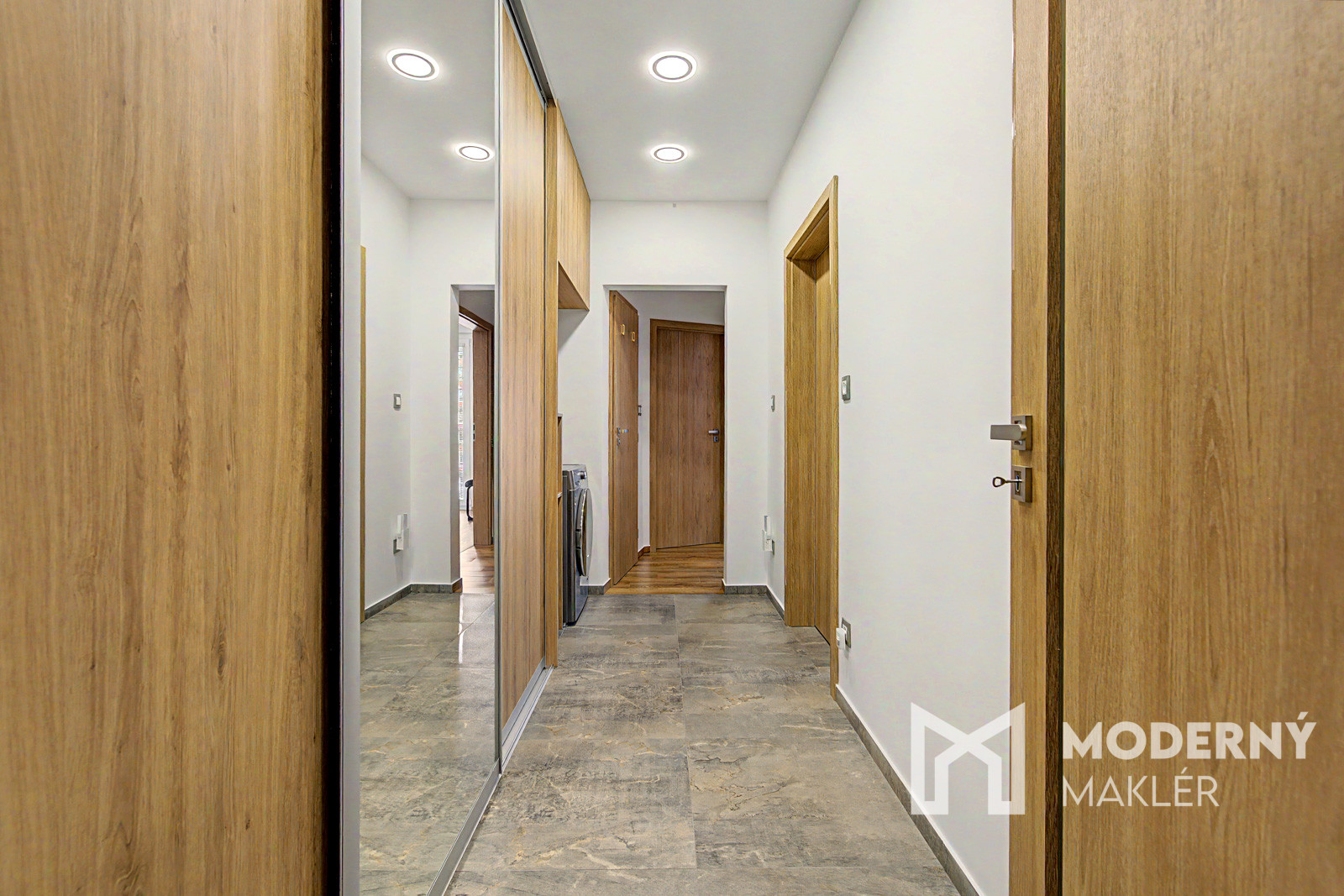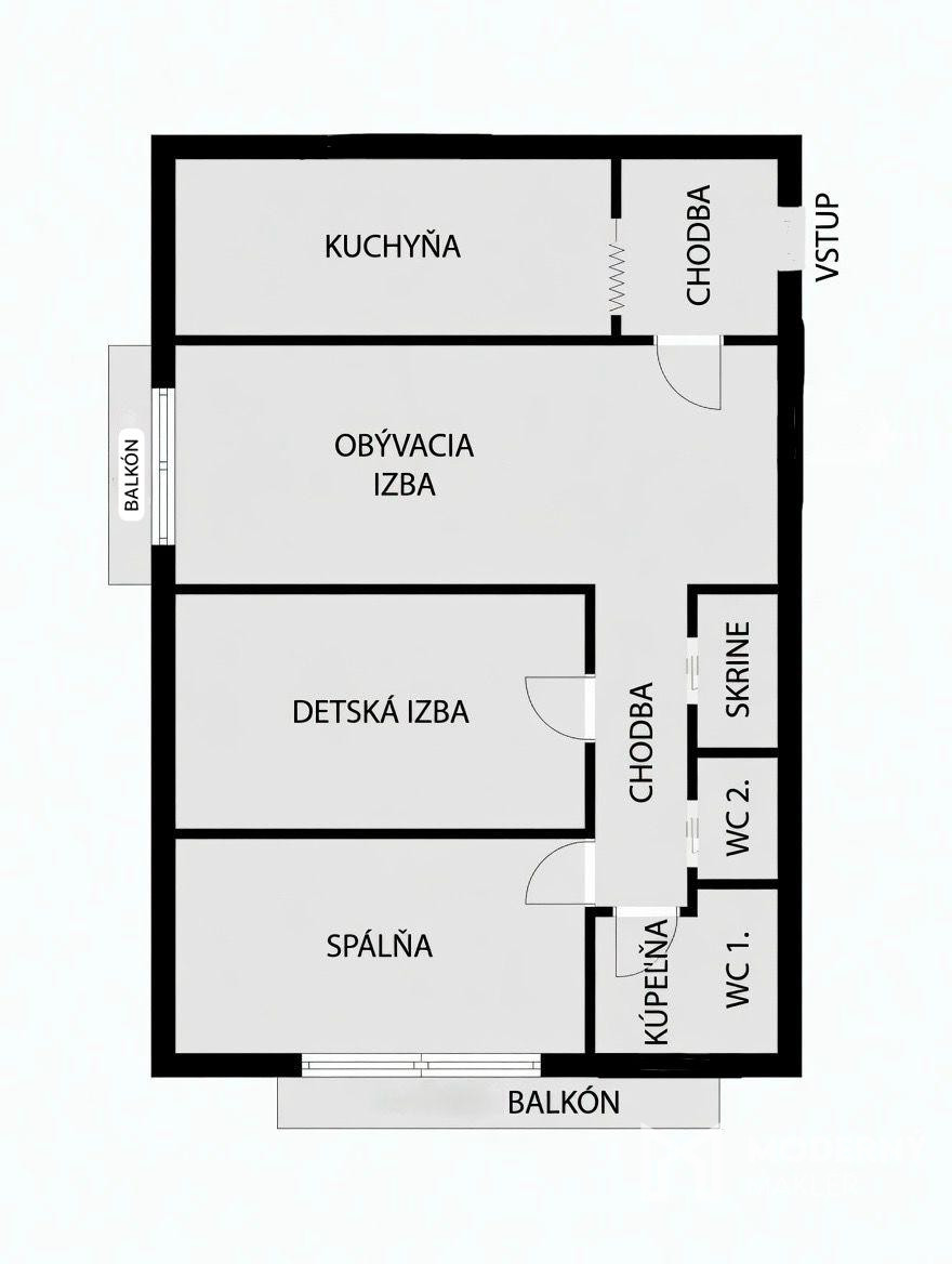 Byt sa skladá zo vstupnej chodby, z ktorej máte priamy vstup do kuchyne a po ľavej strane vstup do obývacej izby. Z obývacej izby pokračujete do zadnej chodby bytu, odkiaľ sú samostatné vstupy do detskej izby, hlavnej spálne a kúpeľne s WC. Na chodbe nájdete ďalšie samostatné WC pre väčšie pohodlie. Byt je orientovaný na juhozápad, čo zabezpečuje príjemné prirodzené osvetlenie počas celého dňa.