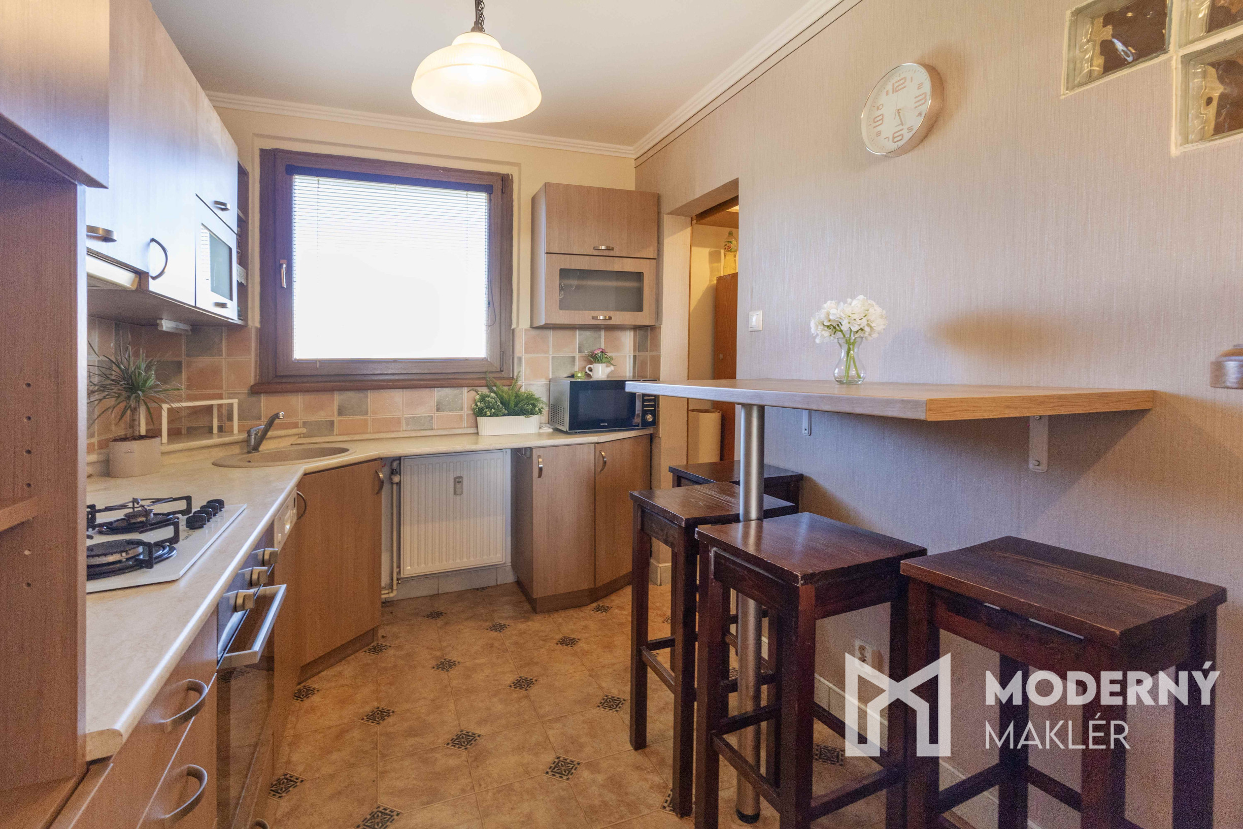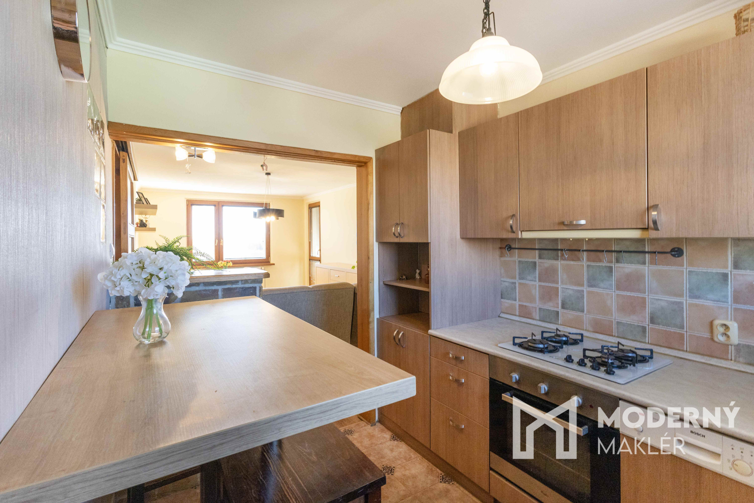 Obývacia izba je prepojená s kuchynskou časťou, kde sa nachádza barový pult s barovými stoličkami, čo vytvára ďalší komfortný priestor na stolovanie. Kuchyňa je priestranná a prakticky riešená.