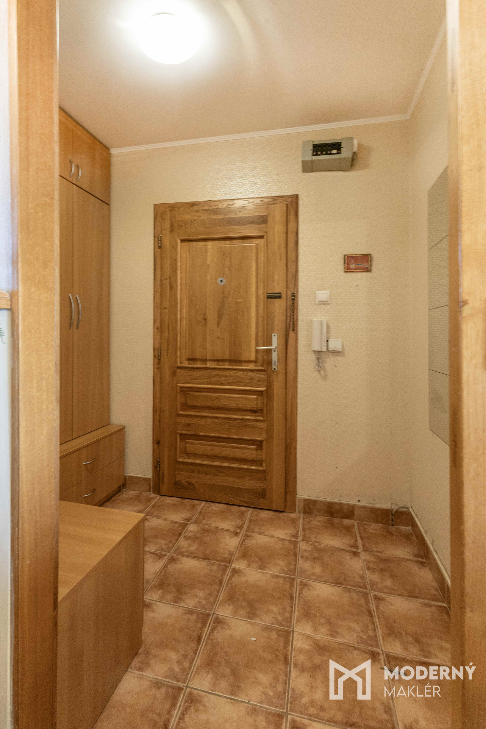 Byt pozostáva z veľkej vstupnej haly so zabudovaným šatníkom, ktorá prirodzene prepája jednotlivé časti bytu. Dominantou je priestranná obývacia izba zariadená rozkladacou sedacou súpravou, konferenčným stolíkom, TV stolíkom a komodou, doplnená o jedálenský stôl so štyrmi stoličkami, ideálny na spoločné chvíle s rodinou či priateľmi.