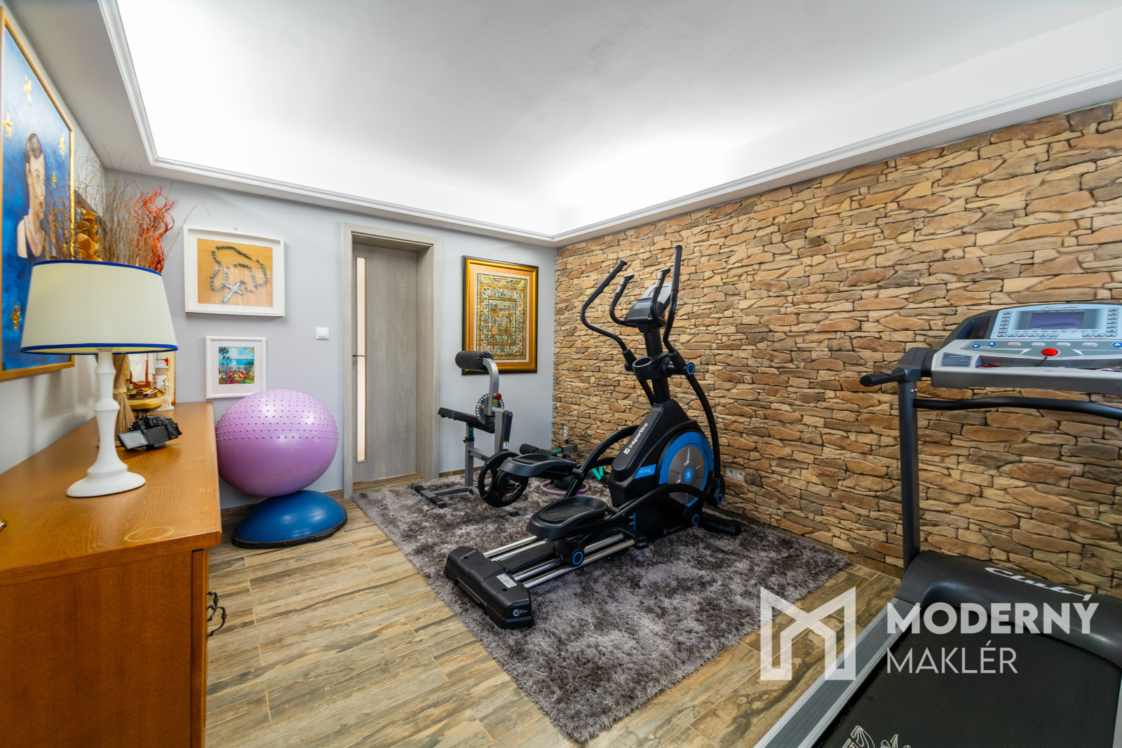 Nehnuteľnosť je zariadená kvalitnými materiálmi, ktoré spájajú nadštandard s pohodlím. Podlahy kombinujú drevo, laminát a keramickú dlažbu. Na prízemí sa nachádza pracovňa s rustikálnym nábytkom a pracovným stolom, obývacia izba s gaučom, konferenčným stolíkom a krbom, prepojená s kuchyňou z masívu so vstavanými spotrebičmi a praktickým ostrovom. Kúpeľne sú vybavené modernou sanitou vrátane vaní, sprchových kútov, umývadiel a bidetu. Hosťovská izba na poschodí je kompletne novo zariadená. Veľkým benefitom sú dve sauny, prvá je súčasťou kúpeľne s práčovňou, druhá sa nachádza v samostatnom domčeku prerobenom na súkromné fitness so sprchou a oddychovou časťou.