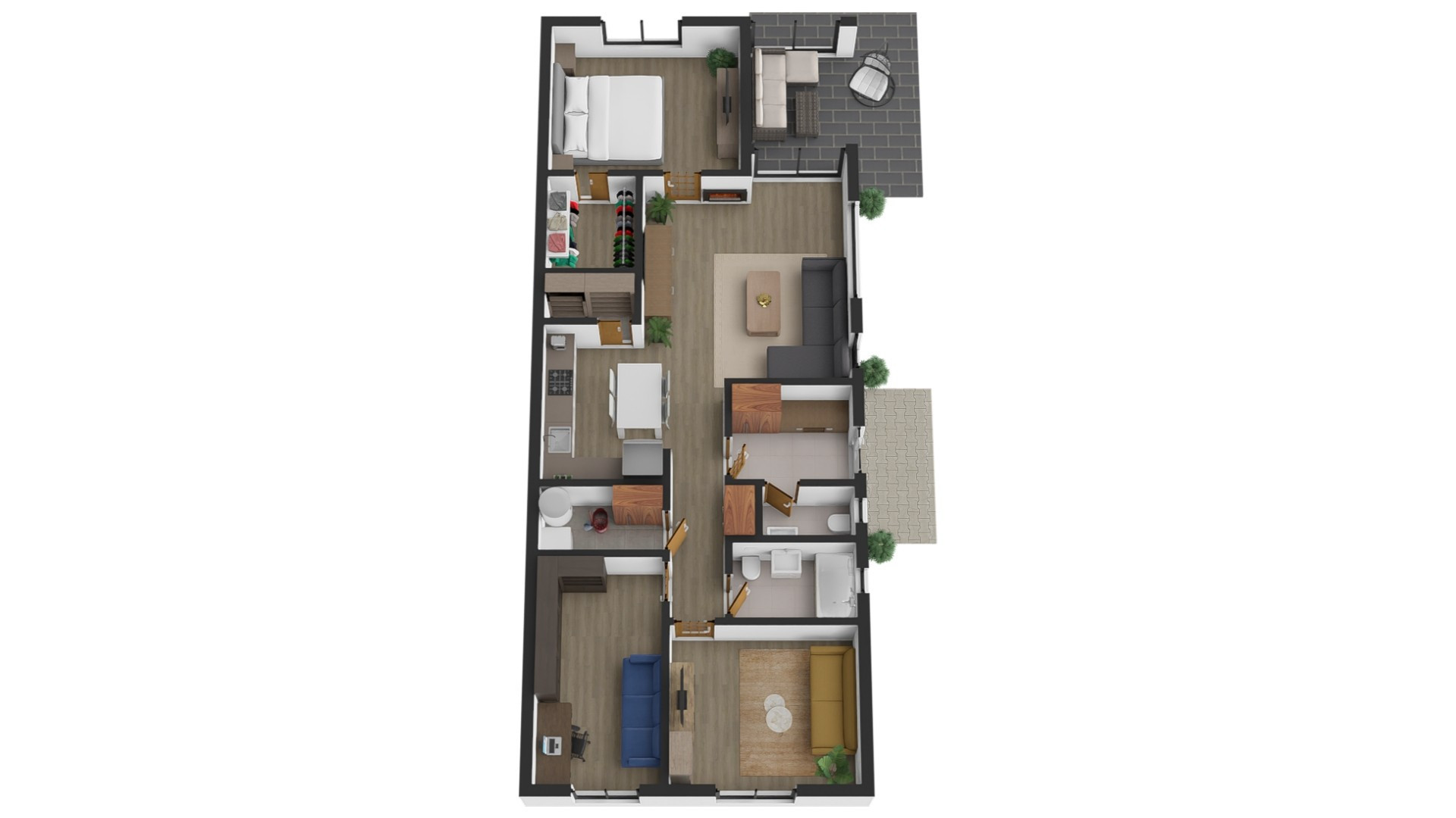 Nehnuteľnosť sa predáva čiastočne zariadená. V kuchyni sa nachádza vstavaná kuchynská linka vybavená spotrebičmi a jedálenský stôl so stoličkami, ktorý prirodzene nadväzuje na obývaciu časť. V spálni je zabudovaný šatník, ktorý poskytuje dostatok úložného priestoru. Ďalší praktický úložný priestor ponúka vstavaná skriňa umiestnená v chodbe. Pracovňa je zariadená obývačkovou zostavou, ktorá môže slúžiť aj ako doplnková izba pre hostí alebo druhá obývačka. Na terase sa nachádza pohodlné terasové sedenie, ideálne na relax a posedenie s rodinou či priateľmi. K nehnuteľnosti prislúcha montovaný záhradný domček a dve parkovacie miesta na vlastnom pozemku. Pri predaji zostáva v dome aj praktický biokrb.