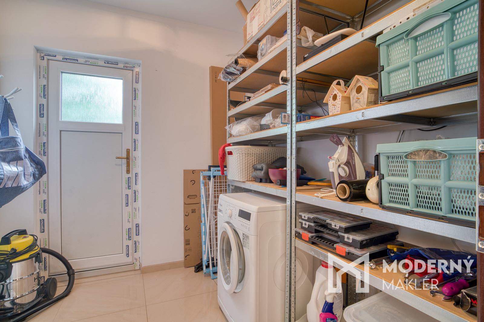 Za vstupnými dverami vás privíta praktická predsieň, odkiaľ sa vstupuje do samostatného WC a hlavnej chodby, ktorá prepája všetky časti domu. K dispozícii sú dve samostatné izby, kúpeľňa, technická miestnosť a praktická špajza – ideálna na každodenné uskladnenie potravín. Dominantou domu je spálňová časť, do hlavnej spálne sa vchádza cez priestranný šatník so vstavanou šatníkovou skriňou s posuvnými dverami. Bonusom je priľahlá menšia izba s možnosťou vybudovania vlastnej rodičovskej kúpeľne. Zo spálne vedie priamy výstup na terasu – ideálne miesto na oddych či rannú kávu. Srdcom domu je vzdušný, otvorený priestor kuchyne spojenej s jedálňou a obývacou izbou, ktorý prirodzene prepája rodinný život. Aj z tejto časti je možný priamy vstup na terasu, ktorá je orientovaná na juhovýchod – perfektná poloha na vychutnanie si prvých ranných lúčov pri šálke kávy.