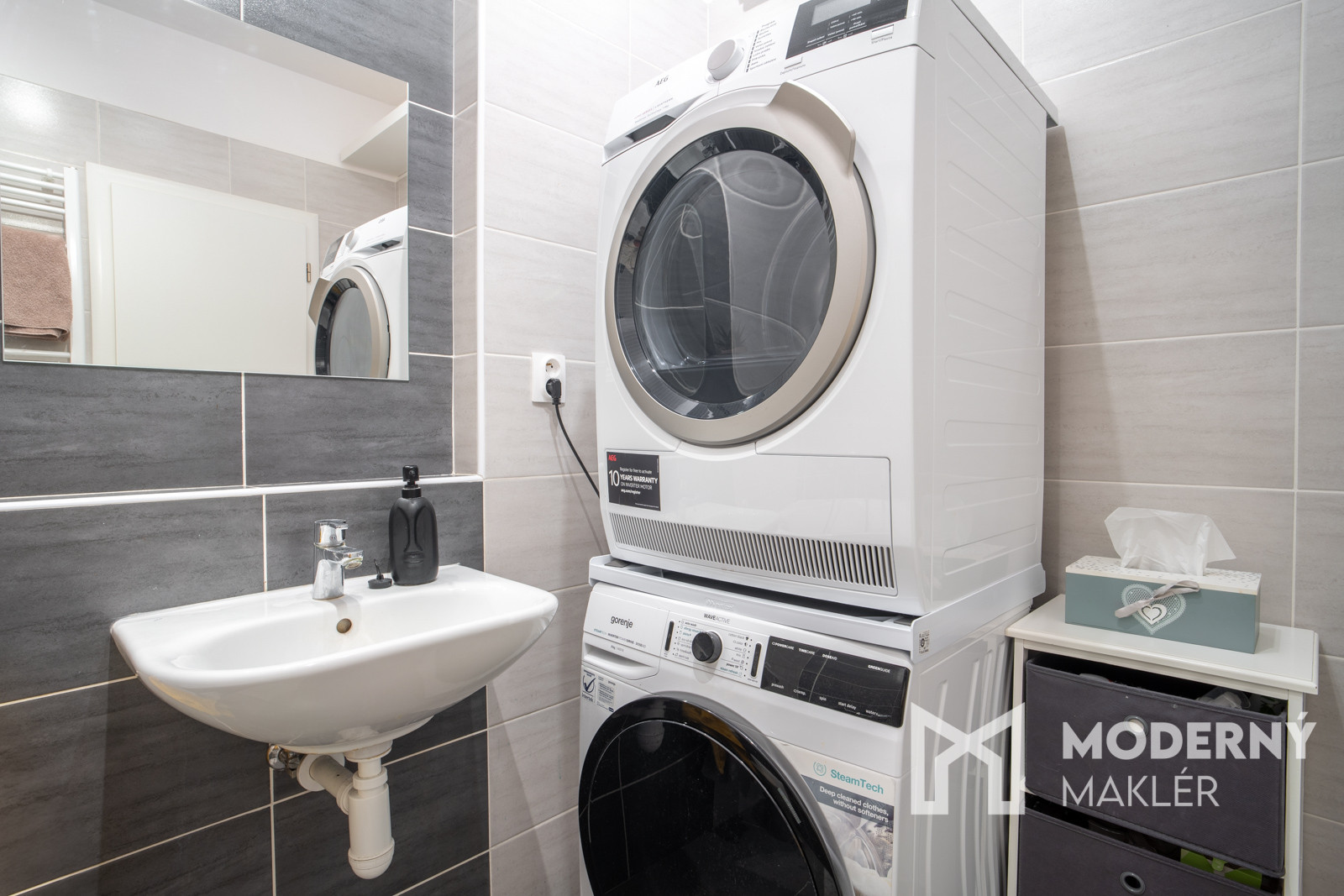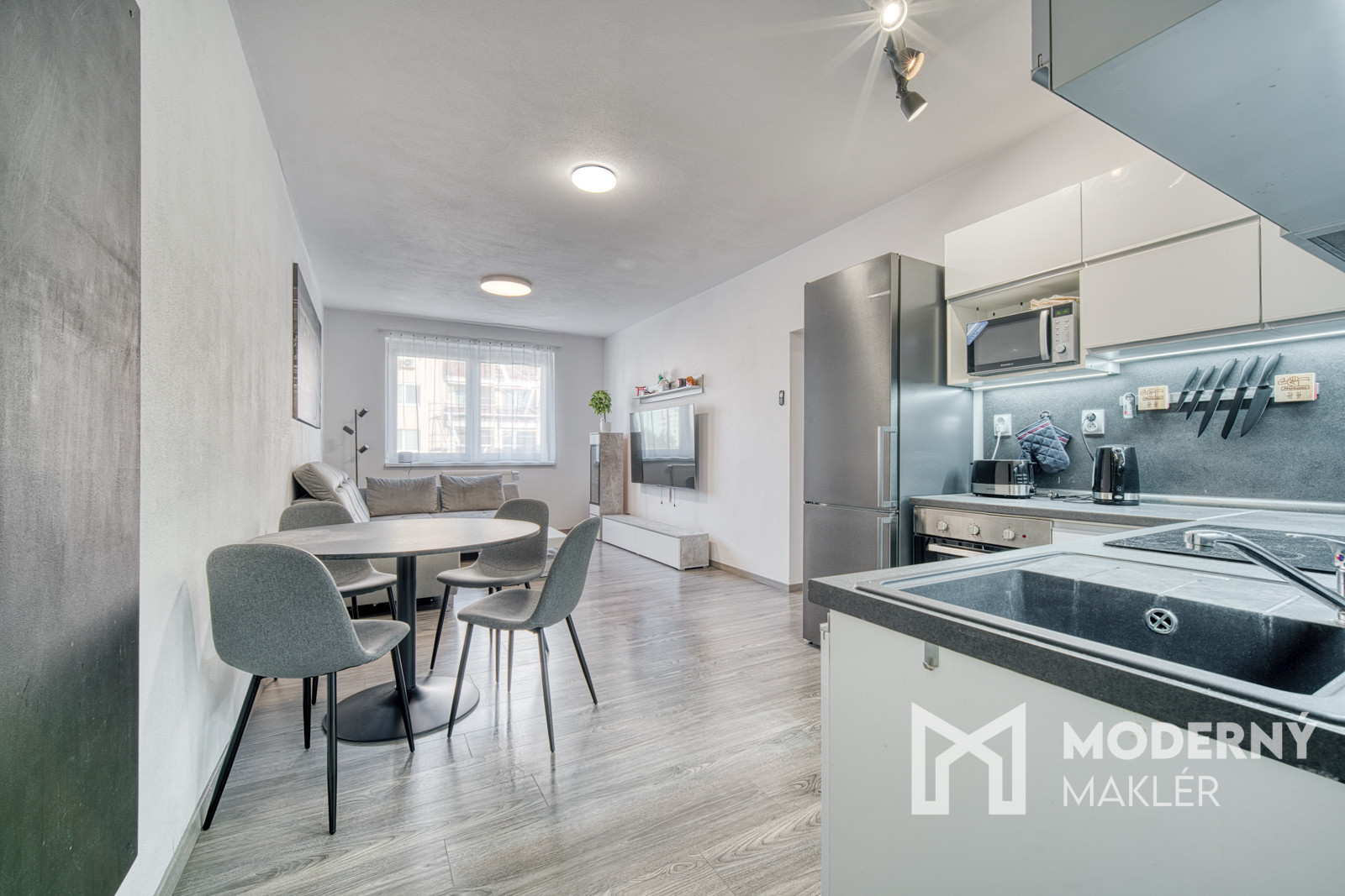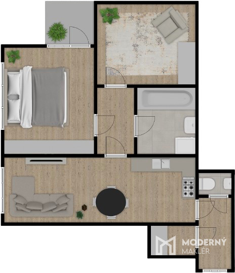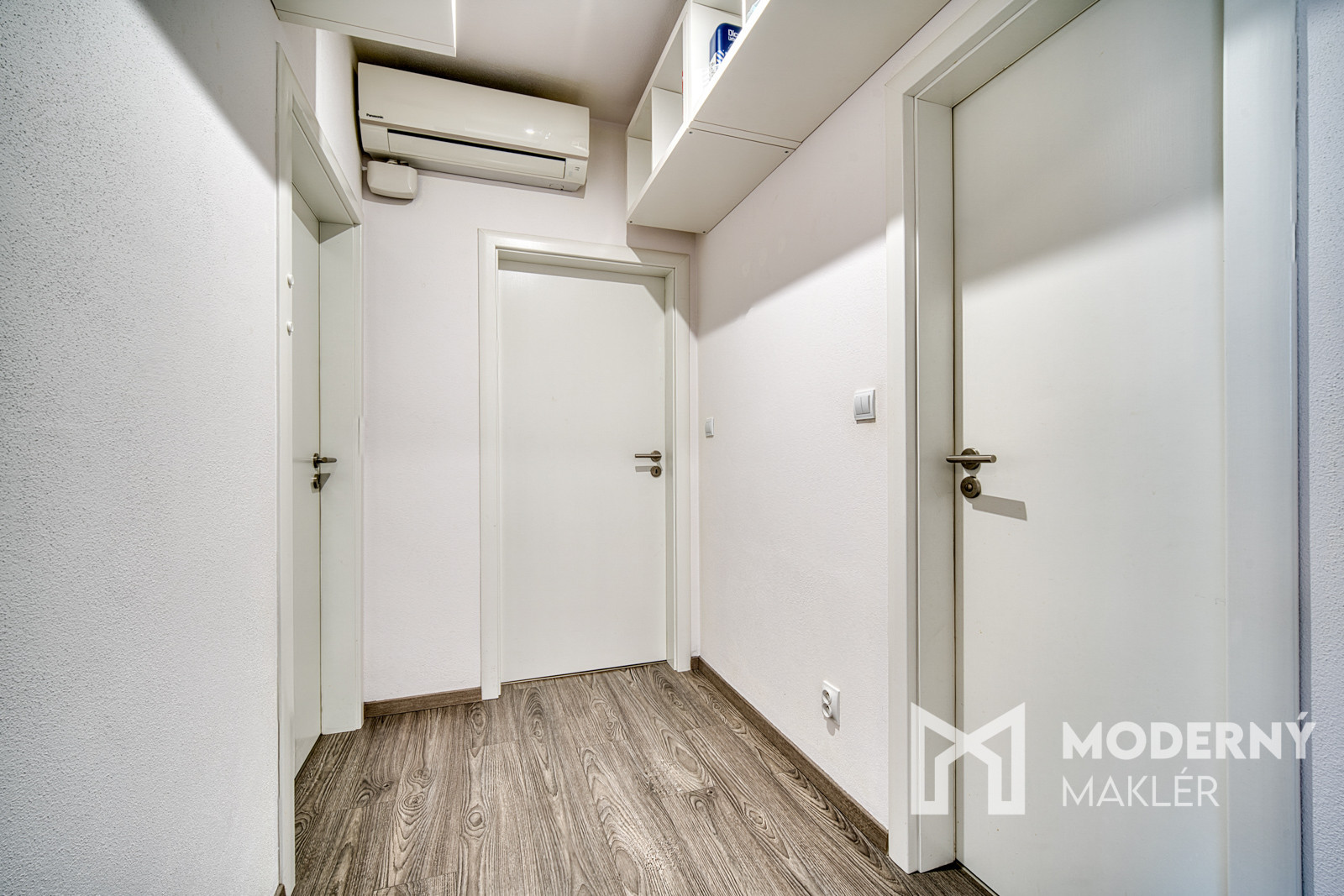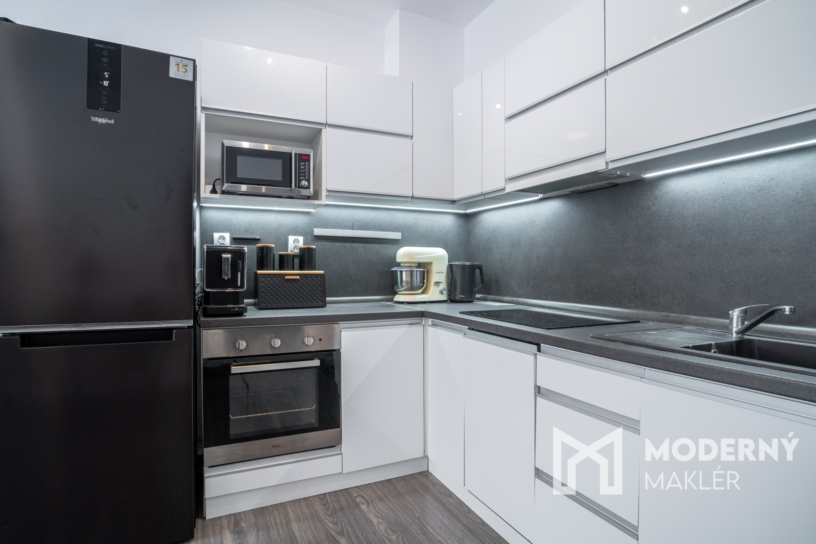 Kuchyňa je vybavená vkusnou kuchynskou linkou so spotrebičmi (mikrovlnná rúra, vstavaná elektrická varná doska, vstavaný odsávač pár, vstavaná elektrická rúra). V spálni sa nachádza elegantná biela vstavaná skriňa a ďalší úložný priestor ponúka priestranný šatník s praktickým vstavaným riešením, ktorý je umiestnený na chodbe. Komfort bývania zvyšuje aj klimatizácia, ktorá zabezpečuje príjemnú teplotu počas celého roka.