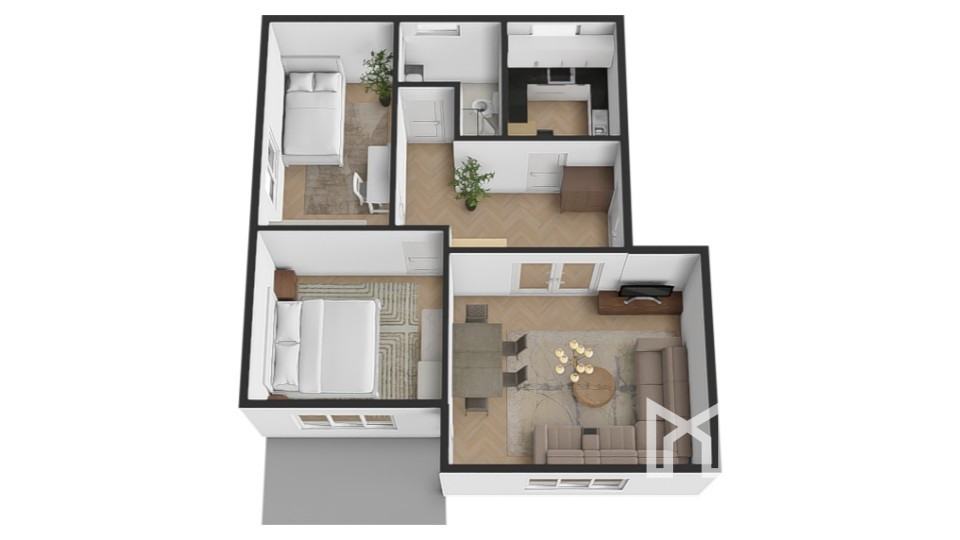Dispozičné riešenie bytu zahŕňa vstupnú chodbu, priestrannú obývaciu izbu s jedálenskou časťou a priamym vstupom na loggiu, samostatnú kuchyňu, dve nepriechodné izby, kúpeľňu a samostatné WC. Obývacia izba s jedálňou je orientovaná na juh, čo zabezpečuje dostatok prirodzeného svetla počas celého dňa. Spálňa je orientovaná na juh, detská izba na západ, kuchyňa a kúpeľňa na sever.