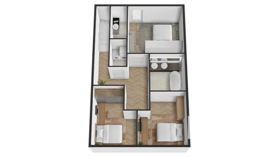 Na prízemí sa nachádza vstupná predsieň, priestranná obývacia izba prepojená s kuchyňou a jedálenskou časťou a samostatná toaleta s umývadlom. Poschodie tvorí hlavná spálňa so šatníkom, vlastnou kúpeľňou a francúzskym balkónom, dve samostatné izby – každá s francúzskym balkónom, kúpeľňa s WC a technická miestnosť. Exteriér ponúka priestrannú terasu, dve parkovacie miesta a upravenú záhradu. Dispozícia je navrhnutá prakticky a vzdušne, pričom dôraz bol kladený na súkromie a funkčnosť jednotlivých zón. Druhá časť dvojdomu ponúka rovnaké riešenie, zrkadlovo otočené, s totožnou kvalitou prevedenia