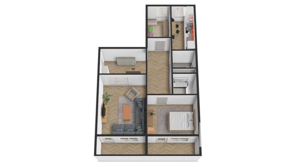 Byt sa skladá z priestrannej vstupnej chodby, ktorá je prepojená s hlavným vstupom do obývacej časti. V byte nájdete obývaciu izbu s výstupom na prvú loggiu, ktorá zabezpečuje prirodzené osvetlenie a príjemný kontakt s exteriérom. Zo vstupnej chodby pokračuje druhá chodba, z ktorej sú samostatné vstupy do jednotlivých miestností. Na ľavej strane sa nachádza detská izba, následne kuchyňa, ďalej samostatná toaleta a kúpeľňa. Na pravej strane je situovaný vstup do spálne s vlastným vstupom na druhú loggiu. Byt má západnú orientáciu a disponuje celkovo dvoma loggiami, ktoré poskytujú priestoru vzdušnosť a prirodzené svetlo.