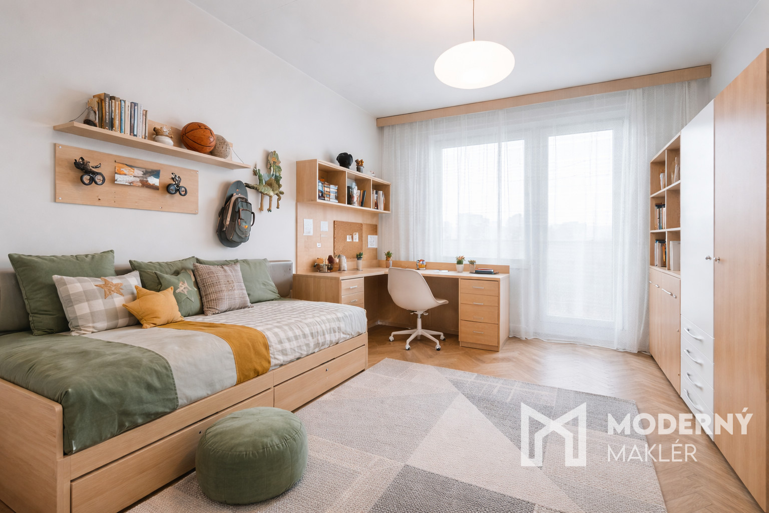 Byt pozostáva z priestrannej vstupnej chodby, ktorá vedie do jednotlivých miestností. Nájdete tu samostatné WC, detskú izbu s výstupom na loggiu, obývaciu izbu takisto s výstupom na loggiu, spálňu, kuchyňu s výstupom na balkón, samostatnú kúpeľňu s vaňou a špajzu, ktorá poskytuje praktický úložný priestor.