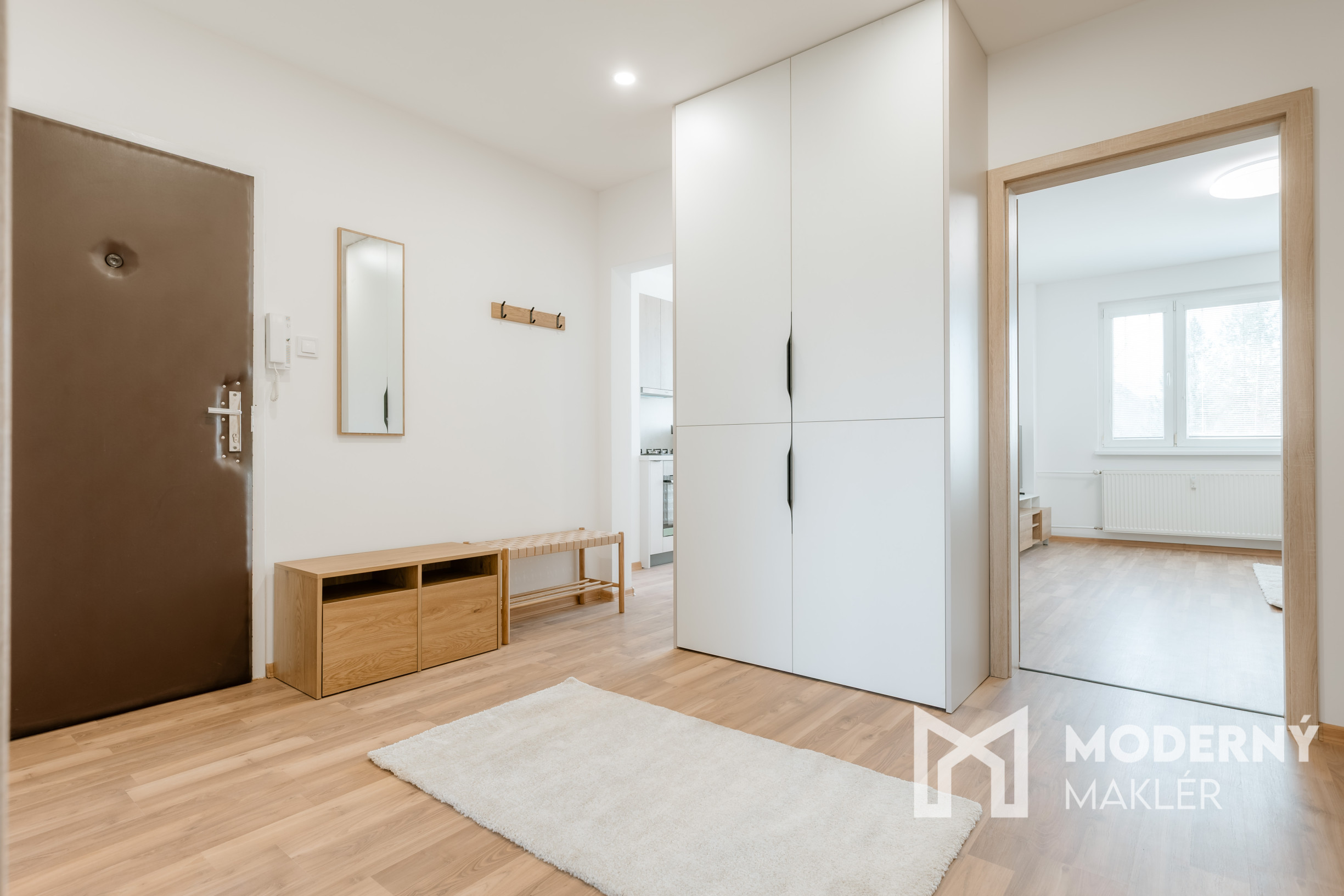 Byt sa prenajíma kompletne zariadený a ponúka praktické dispozičné riešenie. Vstupná chodba je vybavená priestrannou vstavanou skriňou. Srdcom bytu je nová kuchynská linka vyrobená na mieru, doplnená o novú chladničku, plynový sporák s elektrickou rúrou, jedálenský stôl a barové stoličky. Spálňa poskytuje komfort vďaka manželskej posteli a šatníkovej skrini, zatiaľ čo obývacia izba je zariadená pohodlným rohovým gaučom, konferenčným stolíkom a TV zostavou s úložným priestorom. V kúpeľni sa nachádza práčka. Detská izba je momentálne nezariadená, čo budúcemu nájomcovi umožňuje flexibilitu – konkrétne vybavenie je však možné dohodnúť podľa potrieb.
