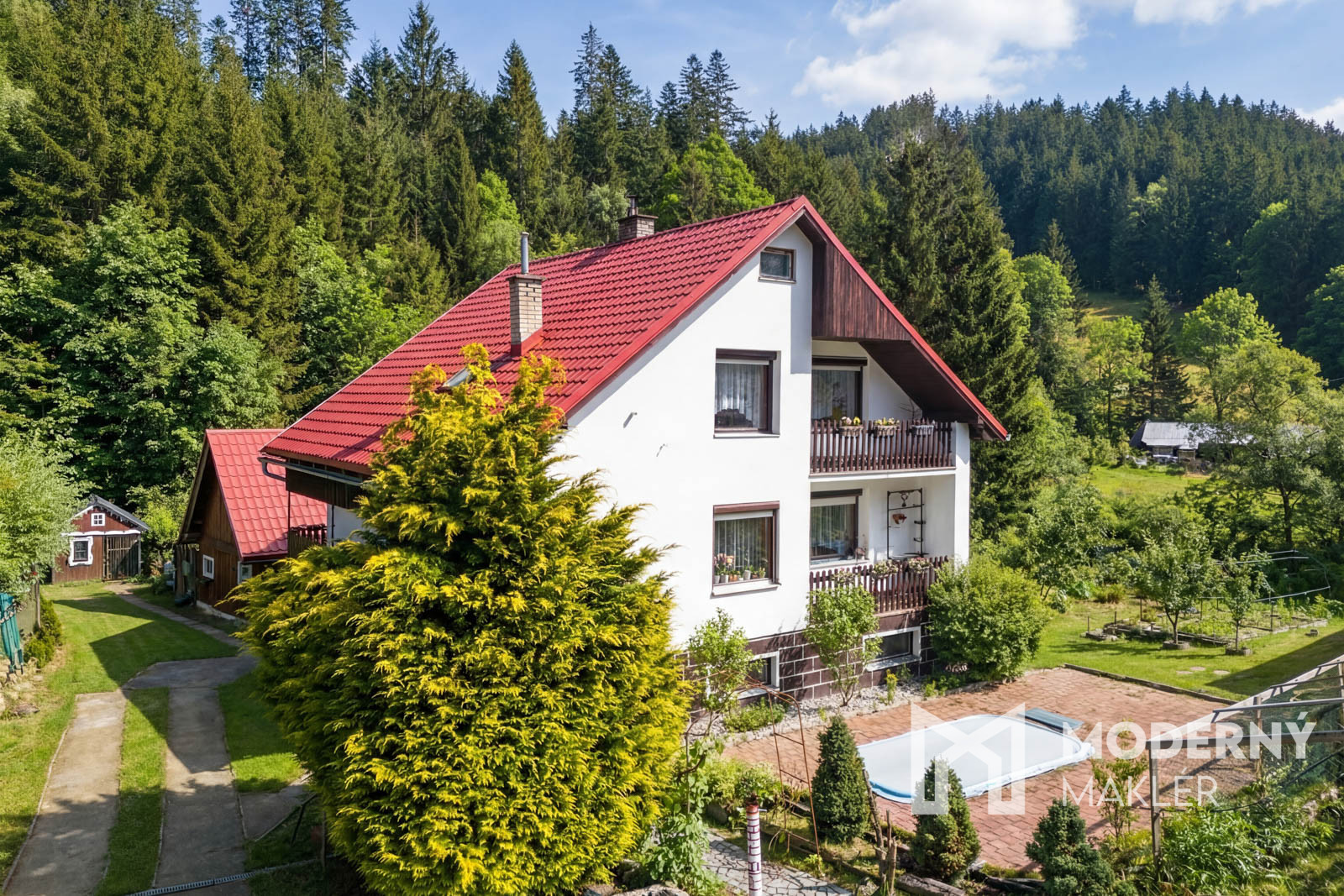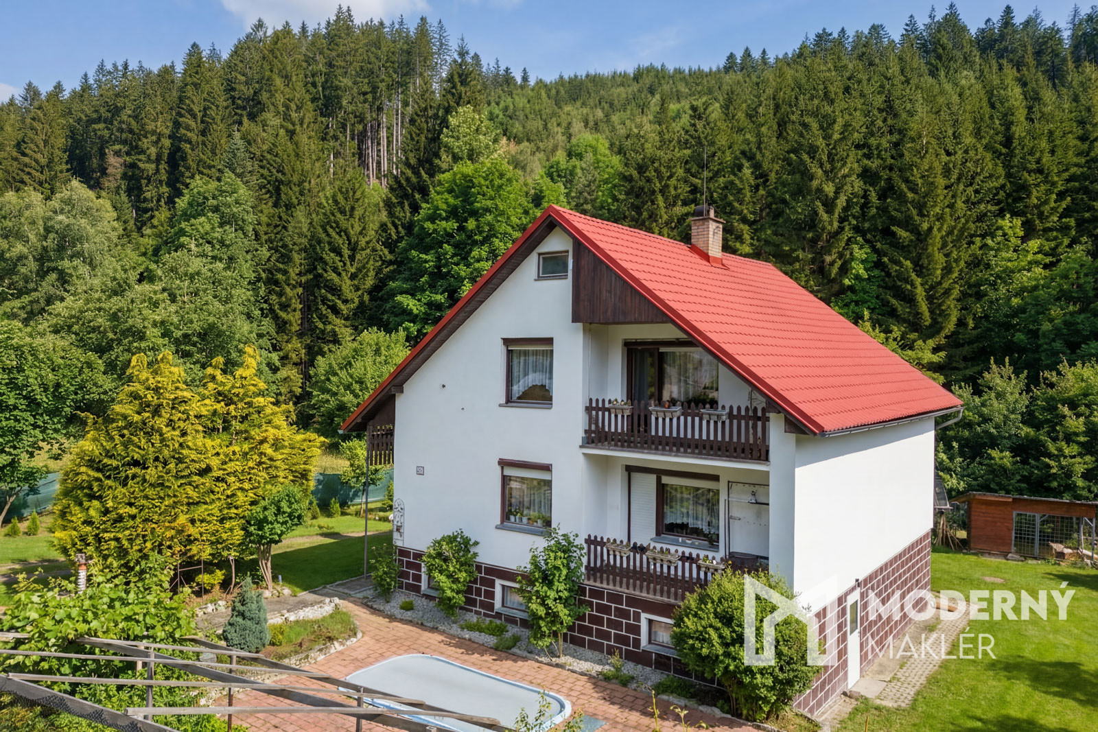 Suterén: Ponúka rozsiahle možnosti využitia vrátane garáže, spoločenskej miestnosti s umývadlom, vstavanou pecou a malou údiarňou, kotolne s výstupom na záhradu, dielne, práčovne s kúpeľňou a WC, vstupnej chodby a pivnice na uskladnenie zeleniny. Dom má optimálnu orientáciu - denné miestnosti a oba balkóny smerujú na juhovýchod, čím zabezpečujú príjemné ranné svetlo, zatiaľ čo nočné miestnosti sú orientované na severozápad pre prirodzene chladnejšie a tichšie prostredie na spánok. Exteriér dopĺňa vonkajší bazén 2×4 m, hospodárska budova, záhon s kanadskými čučoriedkami a rozsiahla záhrada s priamym napojením na les a potok.