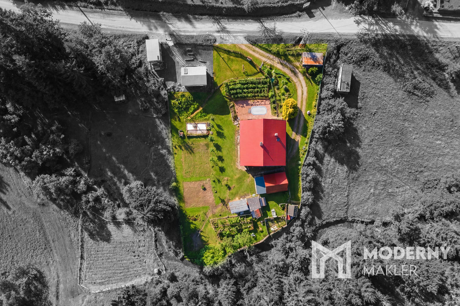 Súčasťou nehnuteľnosti je veľký slnečný pozemok s výmerou 1 752 m², ktorý ponúka široké možnosti využitia. Nachádza sa tu súkromný rybníček napájaný z potoka vhodný na chov rýb, vonkajší bazén s rozmermi 2 × 4 m na letnú rekreáciu, hospodárska budova s rozmermi 5 × 5 m s možnosťou prestavby na sklad, wellness alebo menší apartmán a úrodný záhon s kanadskými čučoriedkami.