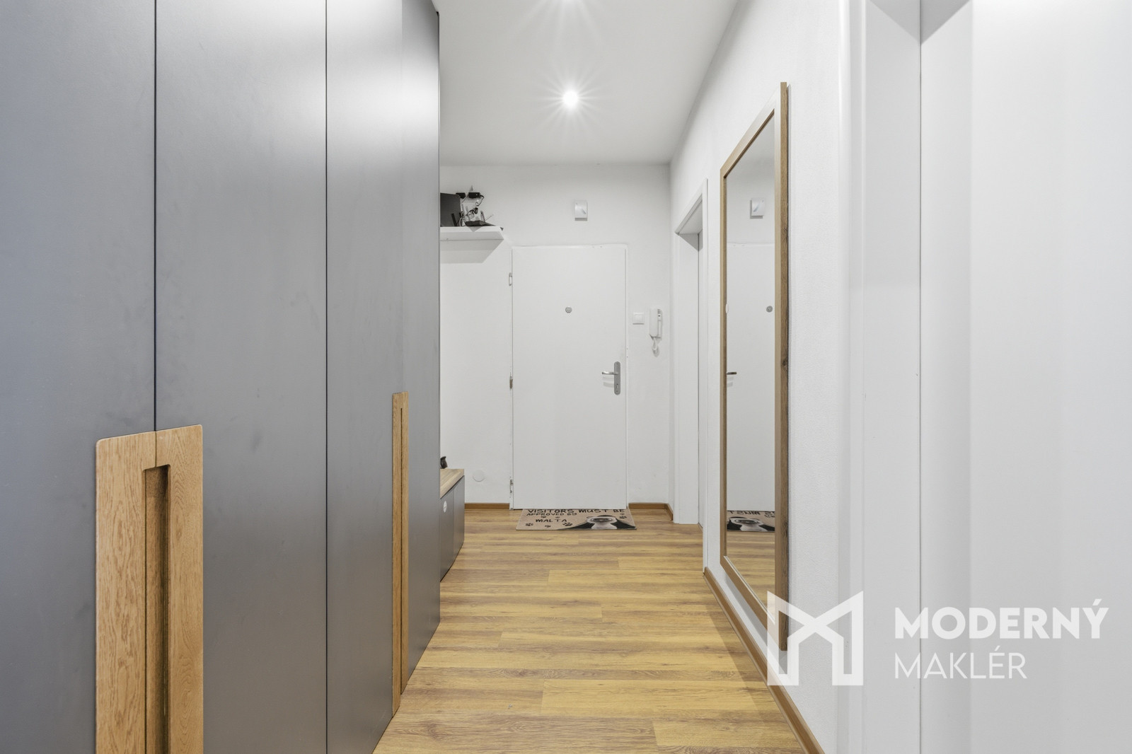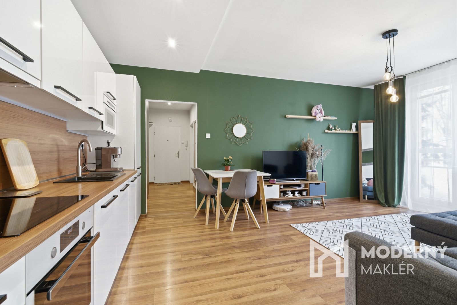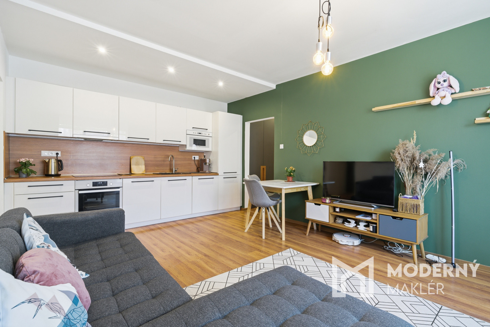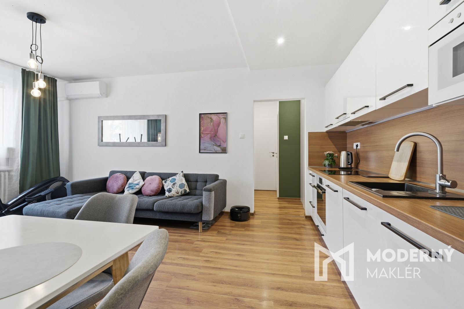 Interiér bytu je navrhnutý veľmi prakticky a účelne, pričom vás privíta vstupná chodba vybavená štedrými vstavanými úložnými priestormi. Srdcom domova je priestranná obývacia izba, ktorá je moderne prepojená s kuchyňou a ponúka priamy výstup na balkón, ideálny na rannú kávu. Nočnú časť bytu tvorí útulná detská izba a hlavná spálňa, ktorej veľkým bonusom je vlastný šatník. Komfort bývania dopĺňa kúpeľňa s vaňou a praktické, samostatne oddelené WC.