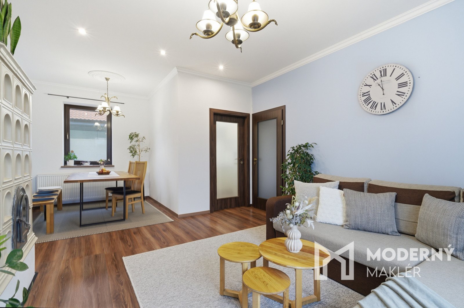 Interiér je ladený v príjemnom nadčasovom štýle s kvalitnými interiérovými dverami a zárubňami. V obytných miestnostiach sa nachádzajú parkety, samozrejmosťou sú kvalitné eurookná s esteticky zladenými parapetmi. Celkový dojem dotvárajú čisté stierky, maľovka a vkusne zvolené svietidlá. Dominantou obývacej časti sú štýlové kachle, ktoré vytvárajú jedinečnú atmosféru a zároveň slúžia ako plnohodnotný doplnkový zdroj vykurovania počas zimných mesiacov. O tepelný komfort sa stará výkonný kotol značky Buderus riadený centrálnym termostatom. Nehnuteľnosť je vybavená alarmom a videovrátnikom, čo zvyšuje bezpečnosť bývania.