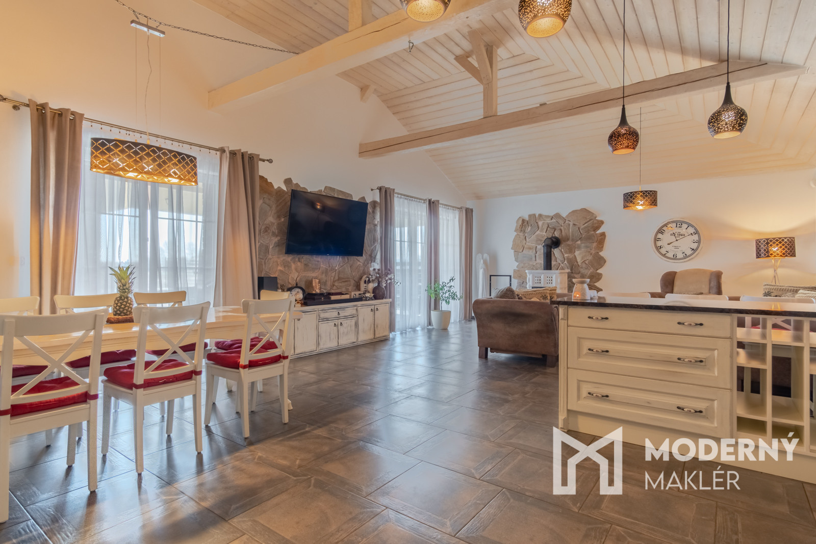 Dom je navrhnutý s dôrazom na pohodlie a funkčnosť. Priestranné zádverie vedie do veľkolepej dennej a oddychovej časti. Hlavným prvkom interiéru je elegantná obývacia hala, ktorá je prepojená s kuchyňou a jedálňou, čím vytvára vzdušný, harmonický priestor s krbovou pecou a provensálskym dizajnom. Vysoké stropy a autentické storočné trámy dodávajú priestoru charakter a luxusný nádych. Nehnuteľnosť disponuje ďalšími tromi izbami, pričom každá z nich má priamy vstup na rozľahlú terasu s panoramatickým výhľadom. K nadštandardnému vybaveniu patria dve elegantné kúpeľne, hosťovská toaleta a šatník. Priamo z dvojgaráže vedie pohodlný vstup do hlavnej chodby. Súčasťou pozemku je štýlový záhradný dom s ručne vyrábanou medenou kuchynskou linkou a s rozlohou vyše 70 m2. Priestranná terasa obklopená zeleňou ponúkne ideálne miesto na relax, šport či spoločenské stretnutia v úplnom súkromí. Nehnuteľnosť sa predáva kompletne zariadená, pričom každý detail bol starostlivo vybraný s dôrazom na prvotriednu kvalitu a jedinečný dizajn.