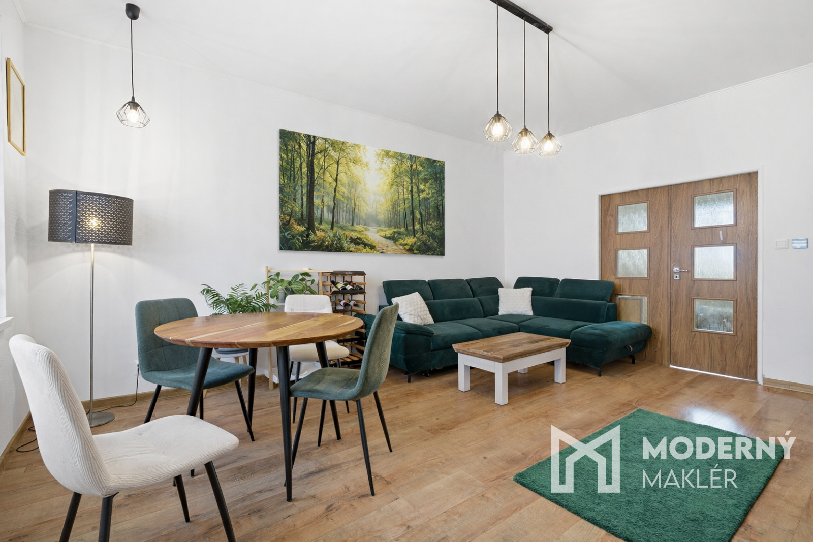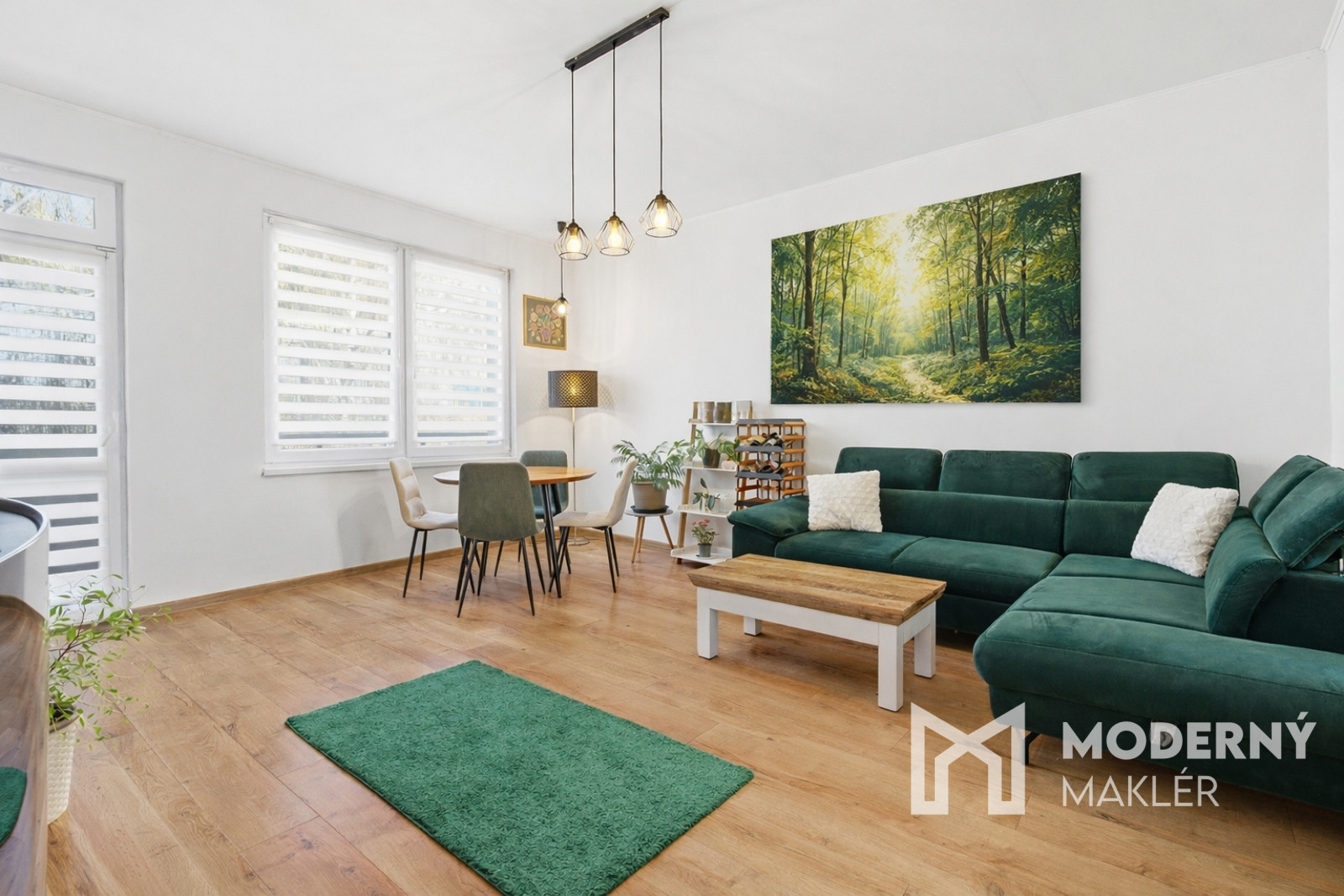 Obývacia izba je zariadená sedacou súpravou, konferenčným stolíkom, dizajnovým jedálenským stolom so stoličkami, knižnicou a TV stolíkom s televízorom. Priestor dopĺňa biokrb, ktorý vytvára príjemný vizuálny aj pocitový komfort.