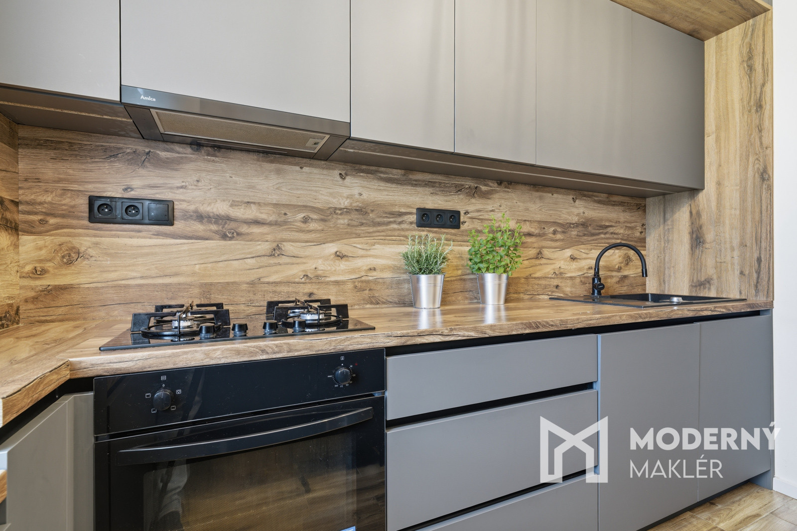Kuchynská časť obsahuje vstavané spotrebiče (plynová varná doska, elektrická rúra, veľká umývačka riadu, digestor a mikrovlnná rúra). Samostatne stojacu chladničku s mrazničkou dopĺňa dostatočný úložný priestor pre každodenné fungovanie.