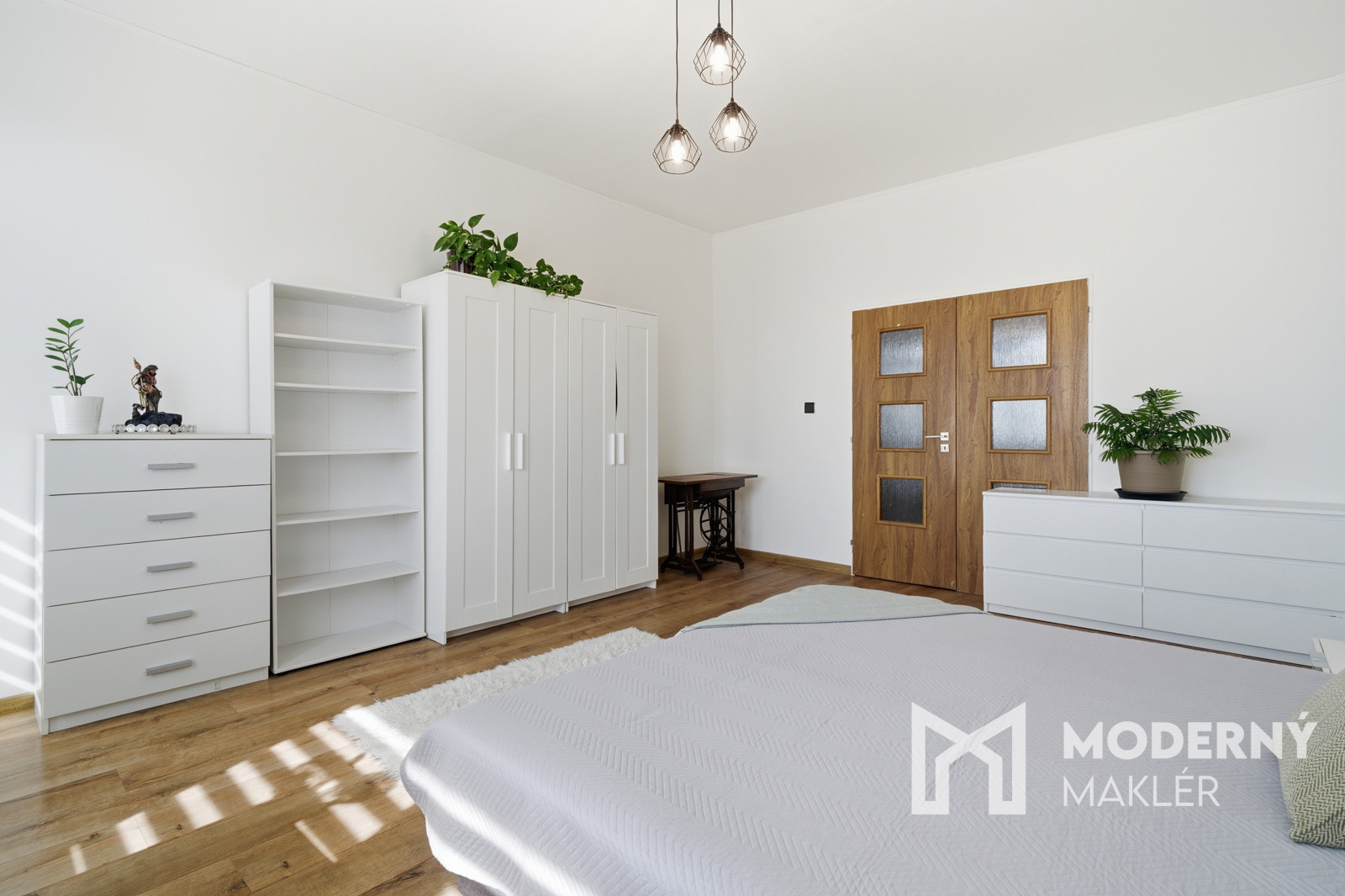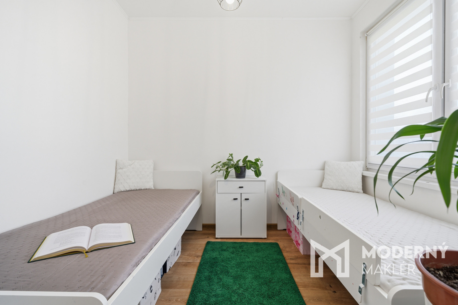 Spálňa ponúka pokojné zázemie s manželskou posteľou, nočnými stolíkmi, komodami a knižnicou. Detská izba je riešená prakticky s dvoma samostatnými posteľami, čo umožňuje flexibilné využitie priestoru podľa potrieb majiteľa.