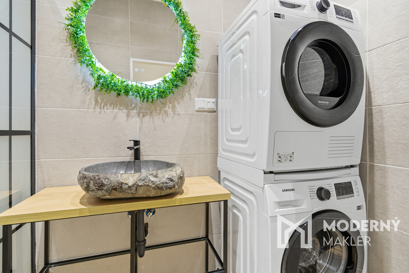 Kúpeľňa je vybavená sprchovým kútom a úplne novou práčkou so sušičkou, ktoré sú súčasťou predaja.