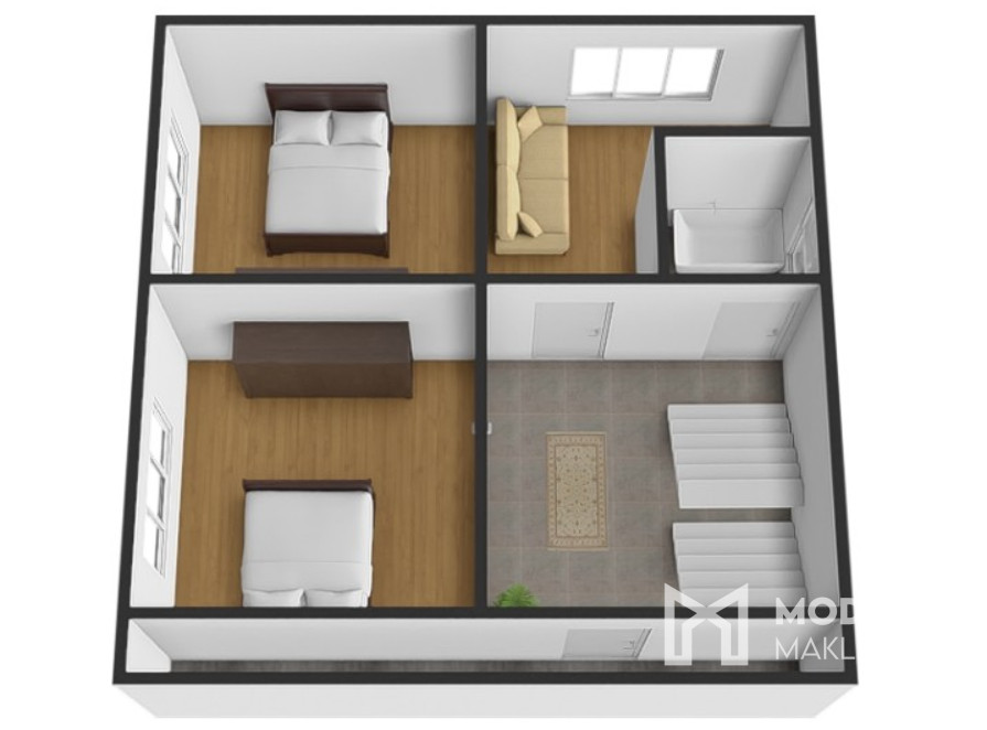 Nehnuteľnosť je dispozične riešená na dve podlažia a pivnicu pod celým domom. Na prízemí sa nachádza vstupná chodba, ktorá vedie do izby, samostatného WC a priestrannej jedálne prepojenej s kuchyňou. Súčasťou kuchyne je praktická špajza. Z chodby zadnej strany domu je tiež prístup na dvor. Pod schodami je šikovne umiestnený vchod do pivnice. Na poschodí nájdete kúpeľňu, chodbu a tri samostatné izby. Vchod domu je orientovaný na severozápad. Dvor je orientovaný na juhovýchod, vďaka čomu je v dome dostatok prirodzeného svetla.