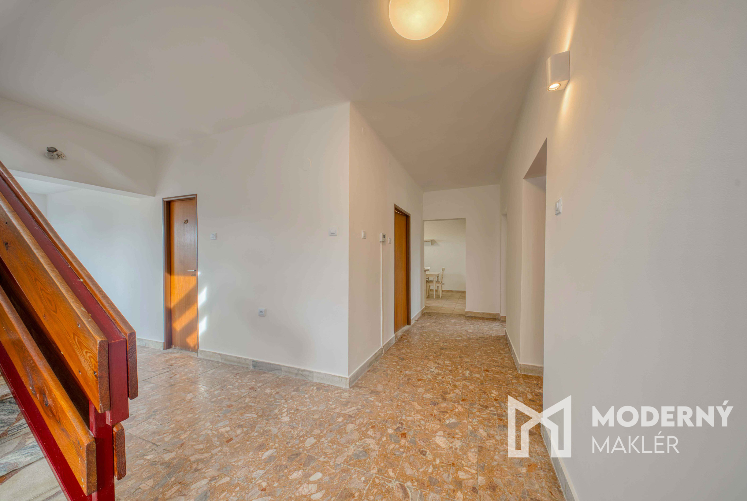 Nehnuteľnosť sa skladá z dvoch podlaží s praktickým rozdelením priestorov. Vstup do domu vedie cez veľkú vstupnú chodbu, z ktorej máte priamy prístup na samostatné WC. Na prízemí sa nachádzajú dve veľké samostatné izby, priestranná kuchyňa so špajzou a kúpeľňa. Horné podlažie ponúka tri samostatné izby, kúpeľňu s WC a výstup na balkón orientovaný do dvora. Dom má kompletné podpivničenie, ktoré poskytuje dodatočný úložný priestor. K domu prislúcha krytá terasa so sedením a kuchyňkou, ideálna na relaxáciu a posedenie s rodinou či priateľmi. Súčasťou je aj priestranná garáž. Dom je orientovaný na východ a západ, čo zabezpečuje prirodzené osvetlenie počas celého dňa.
