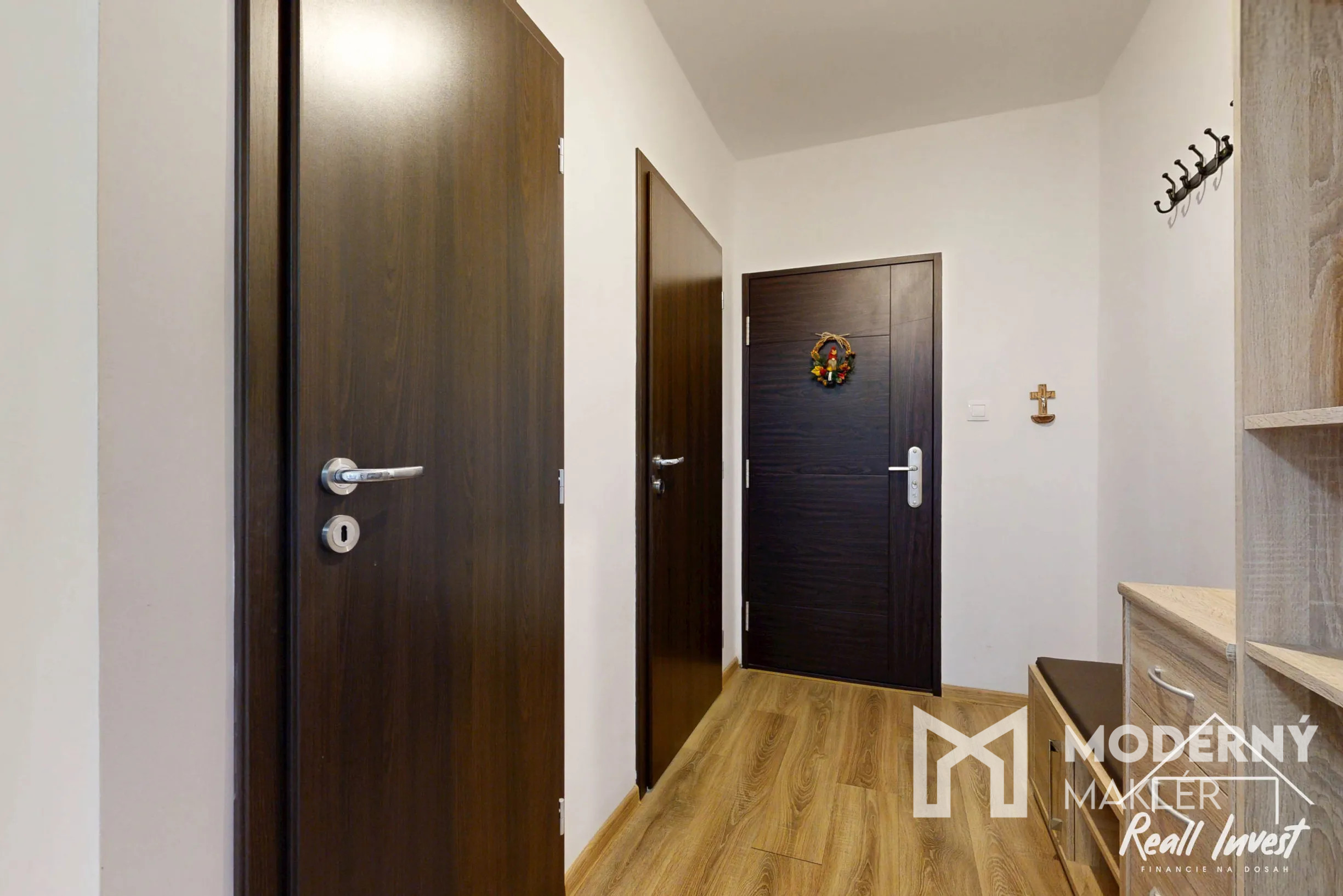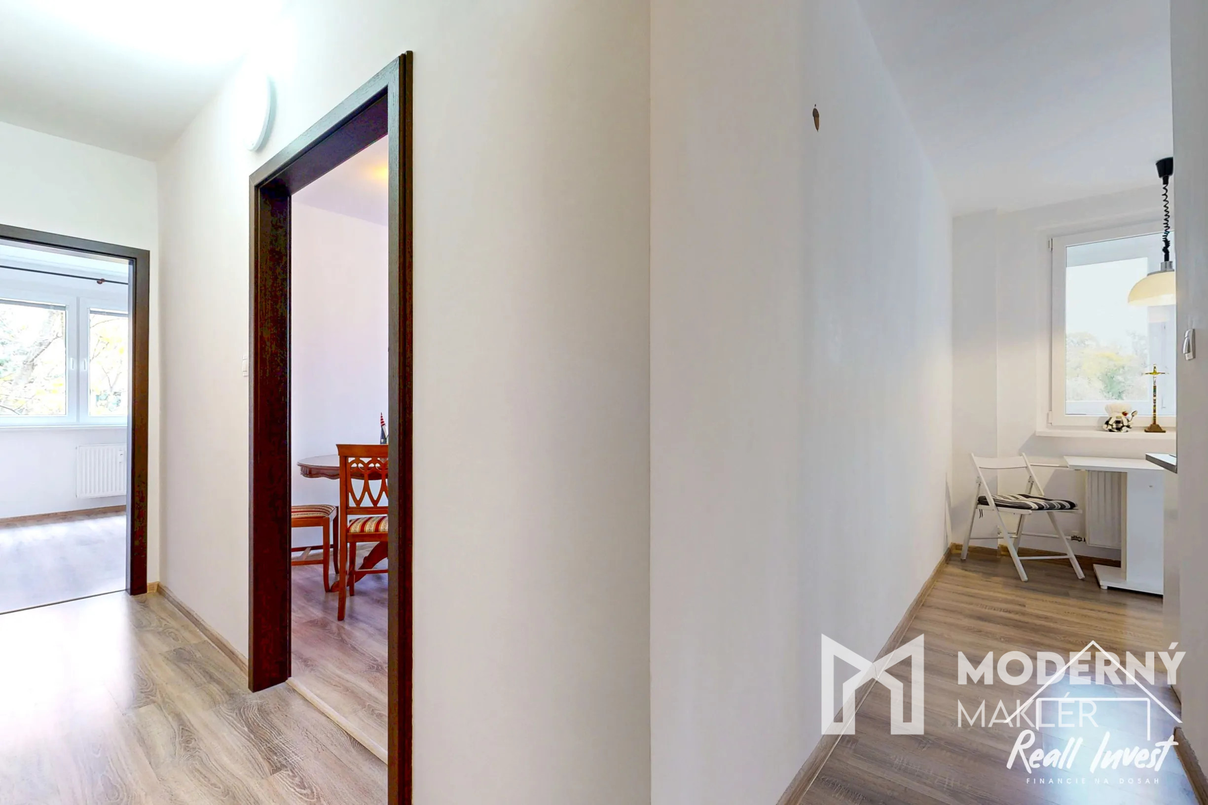 Dispozícia je premyslená do detailu a pôsobí prirodzene a vzdušne. Vstupná chodba tvorí centrálny bod bytu, z ktorej je prístup do všetkých miestností. Po pravej strane sa nachádza kúpeľňa so sprchovým kútom a samostatné WC. Dominantou je svetlá obývacia izba s jedálenskou časťou, ktorá vytvára príjemný priestor na každodenný život aj stretnutia. Z nej sa prechádza do ďalšej izby, ideálnej ako pracovňa alebo hosťovská izba. Samostatná kuchyňa zabezpečuje oddelenie varenia od obývacej časti a zachovanie komfortu. Nepriechodná tretia izba poskytuje ideálne zázemie ako spálňa alebo detská izba. Byt ponúka dostatok úložného priestoru vďaka vstavaným riešeniam.