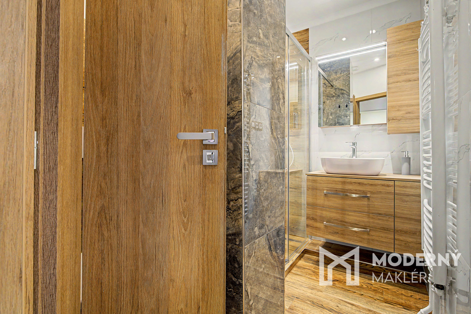 Byt sa skladá zo vstupnej chodby, z ktorej máte priamy vstup do kuchyne a po ľavej strane vstup do obývacej izby. Z obývacej izby pokračujete do zadnej chodby bytu, odkiaľ sú samostatné vstupy do detskej izby, hlavnej spálne a kúpeľne s WC. Na chodbe nájdete ďalšie samostatné WC pre väčšie pohodlie. Byt je orientovaný na juhozápad, čo zabezpečuje príjemné prirodzené osvetlenie počas celého dňa.
